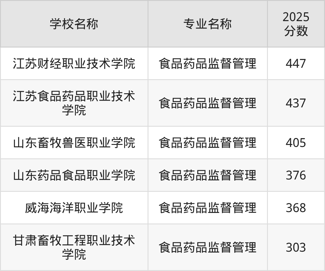下面是2025年全国专科食品药品监督管理专业大学录取分数线。