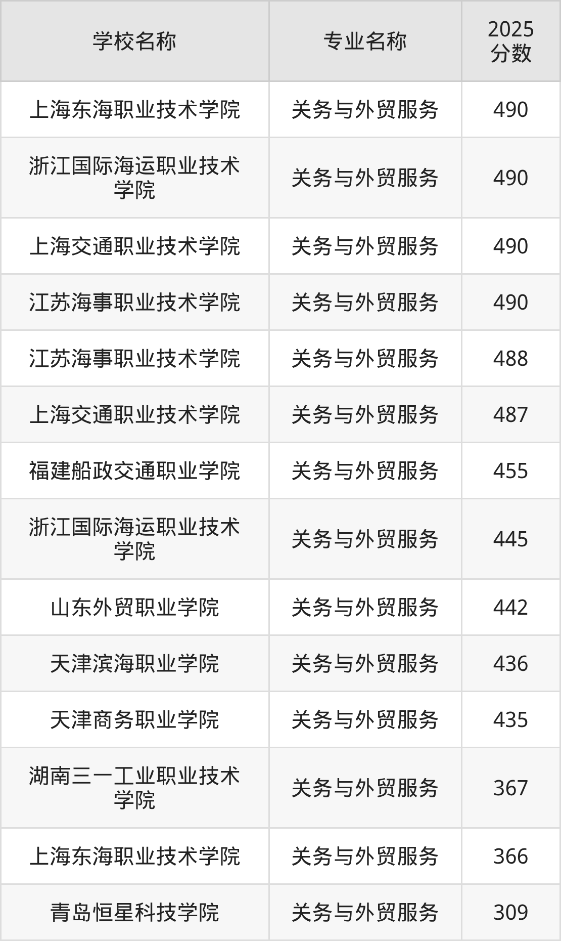 下面是2025年全国专科关务与外贸服务专业大学录取分数线。