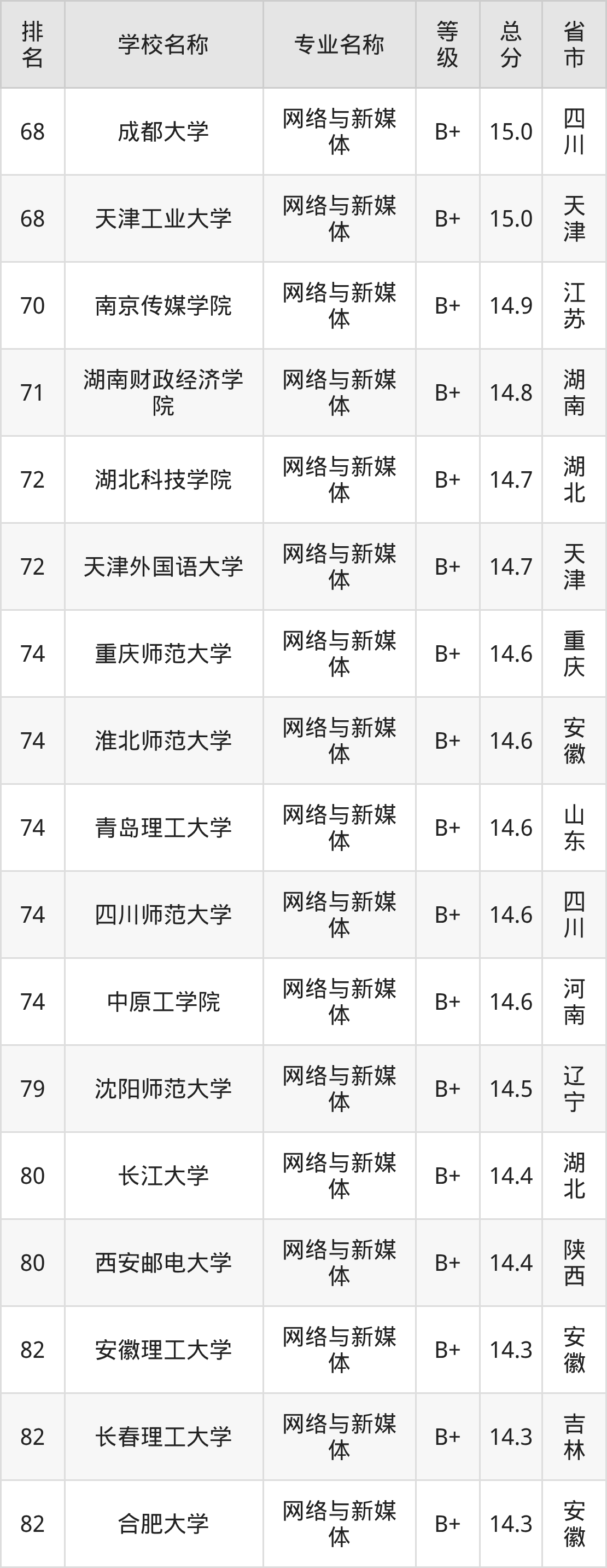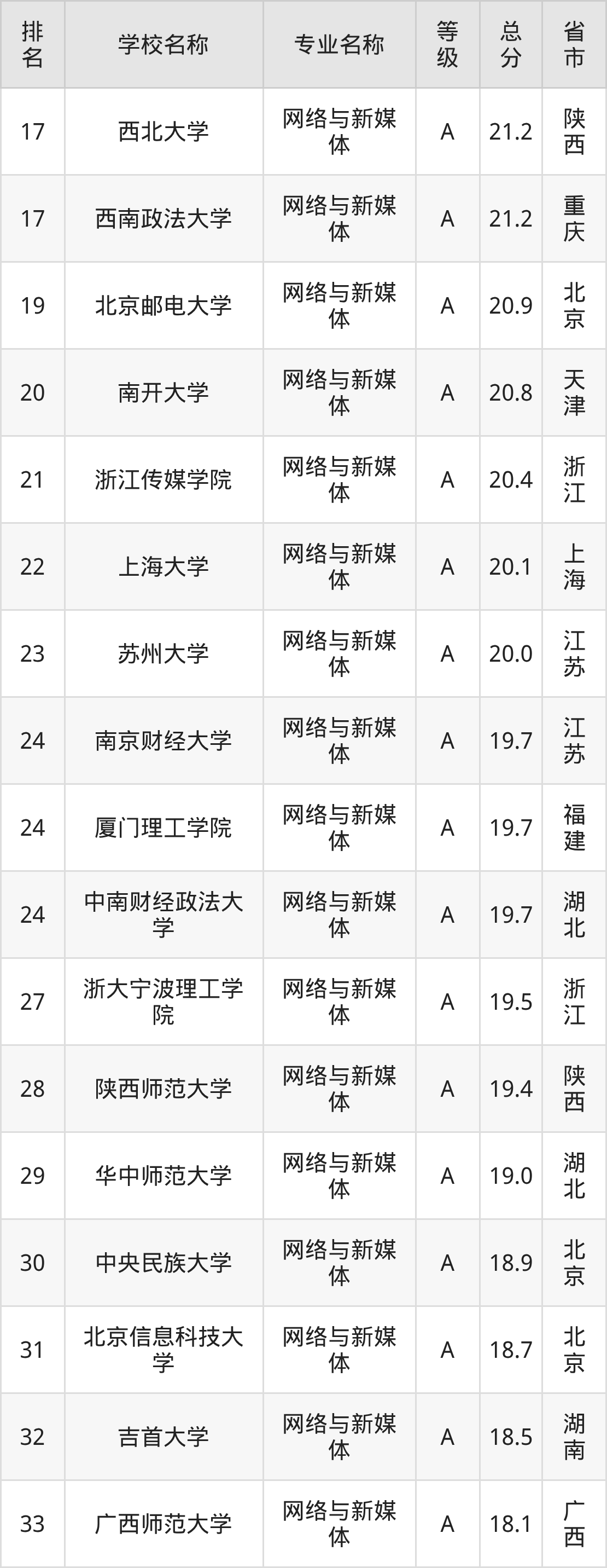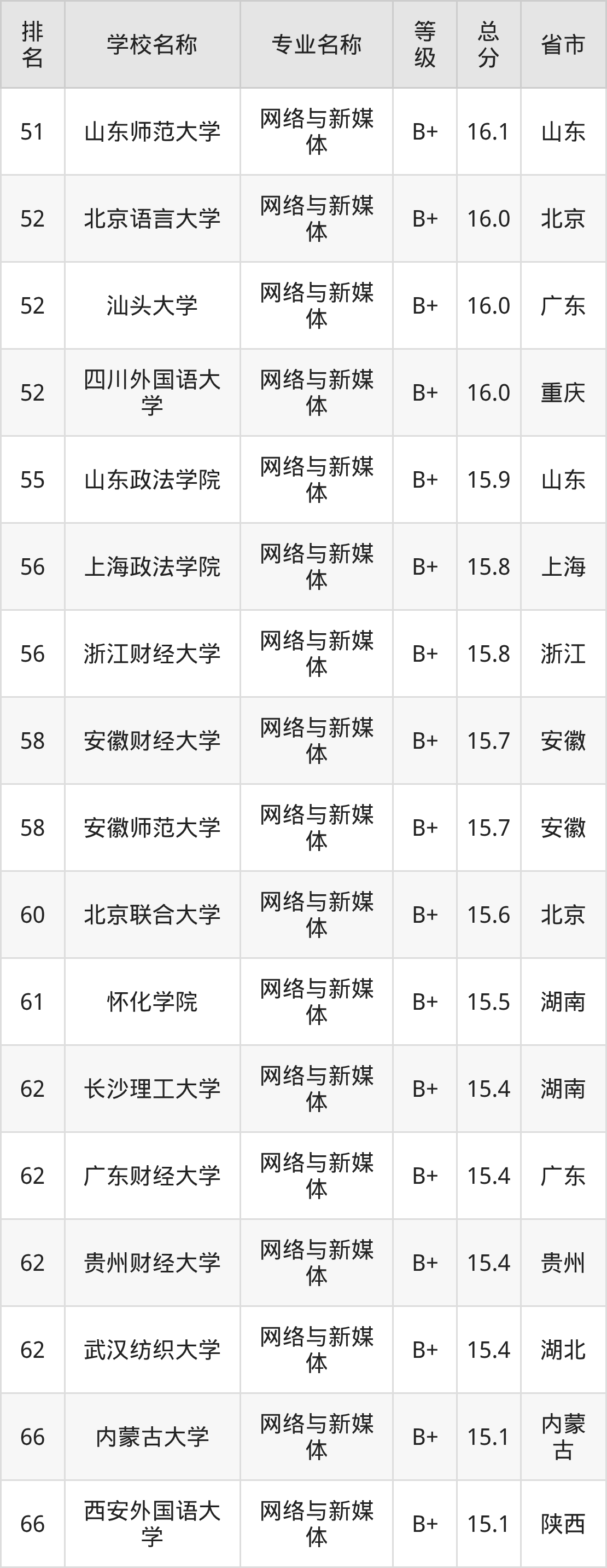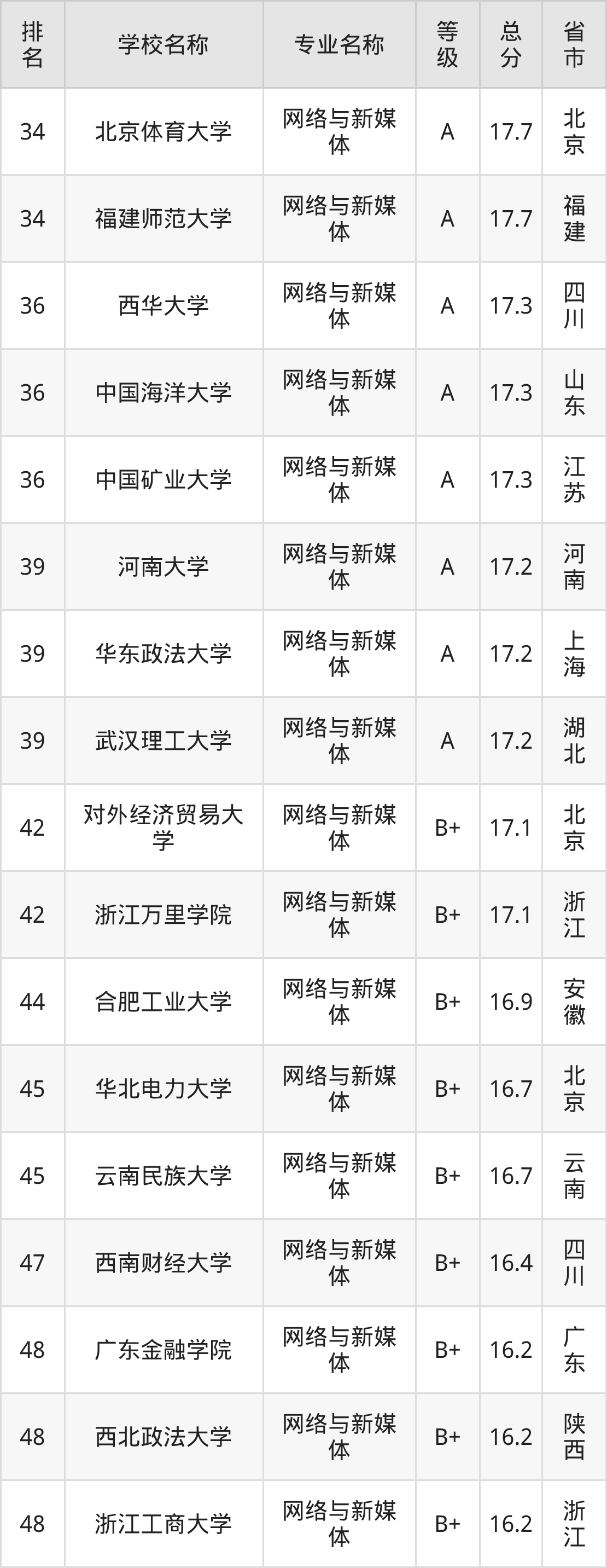 根据软科榜单可知,网络与新媒体专业全国排名前十的大学分别是: