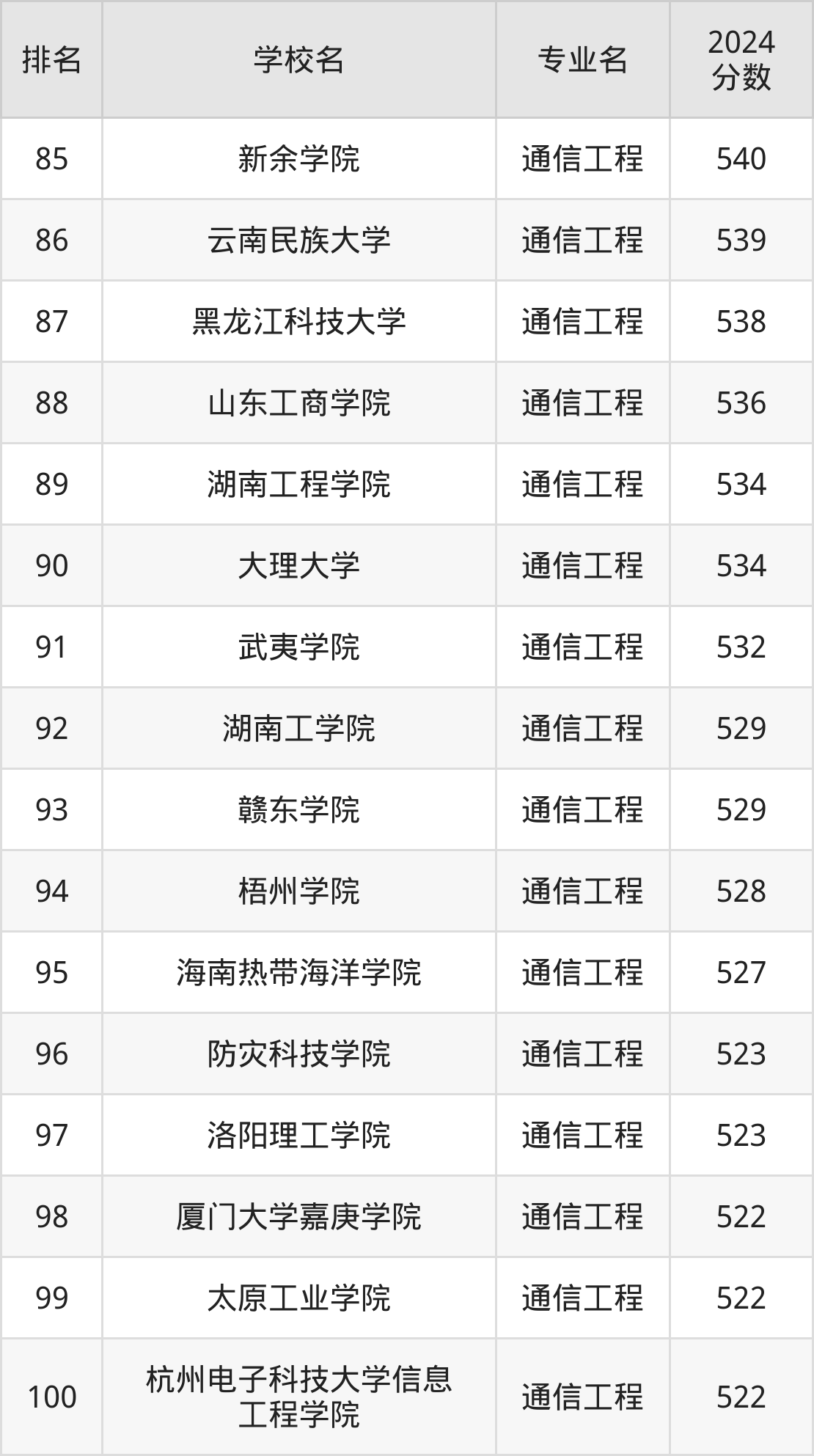 以下为全国通信工程专业在浙江省分数线排名前100的大学。