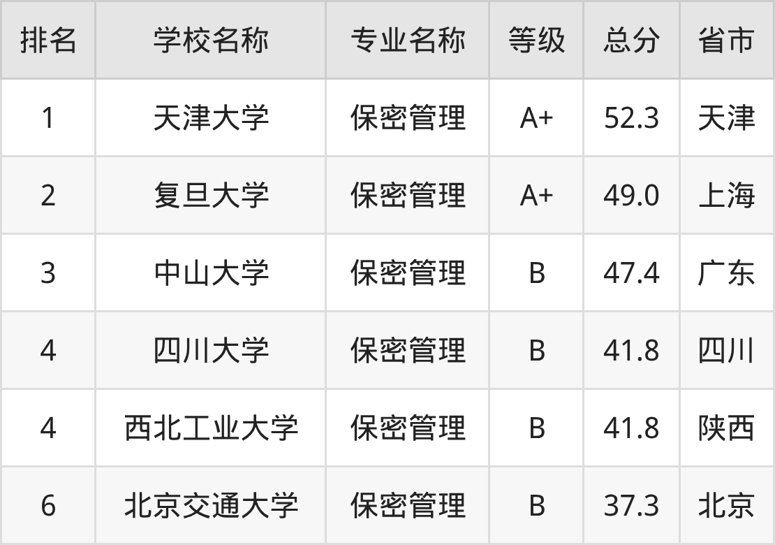 根据软科榜单可知,保密管理专业全国排名前六的大学分别是: