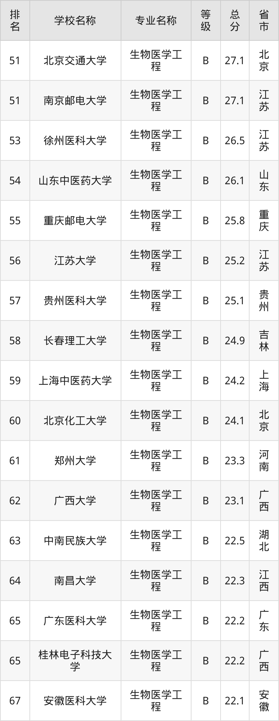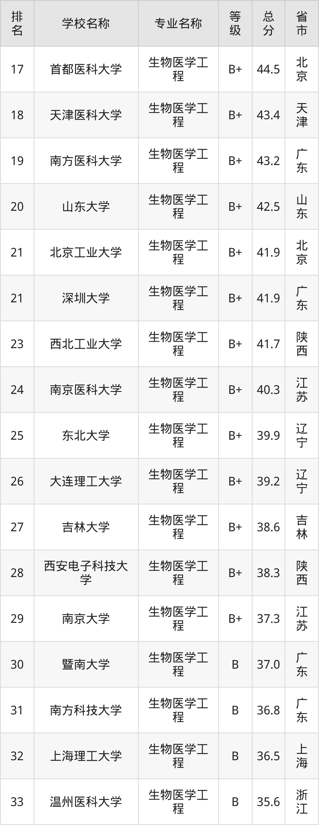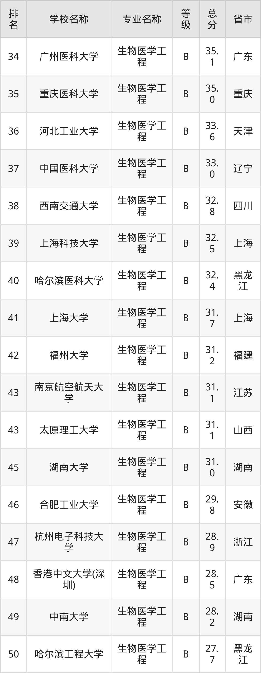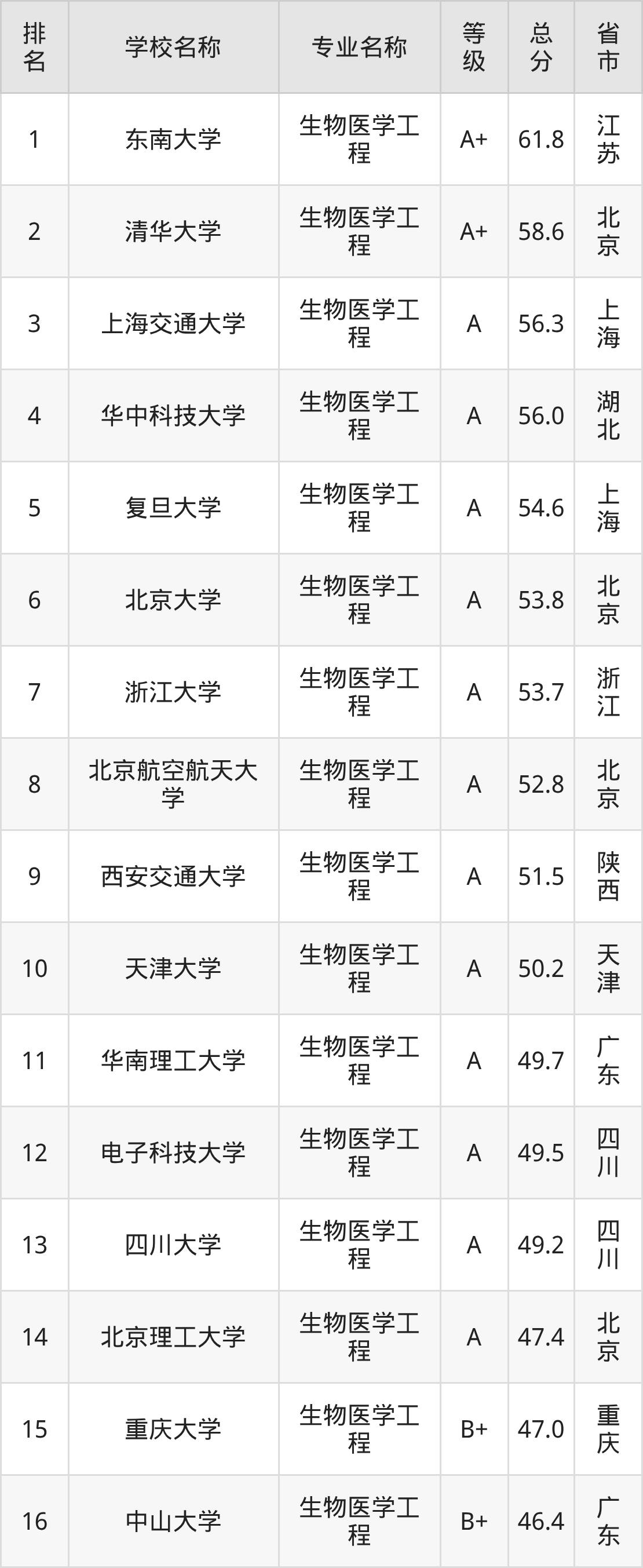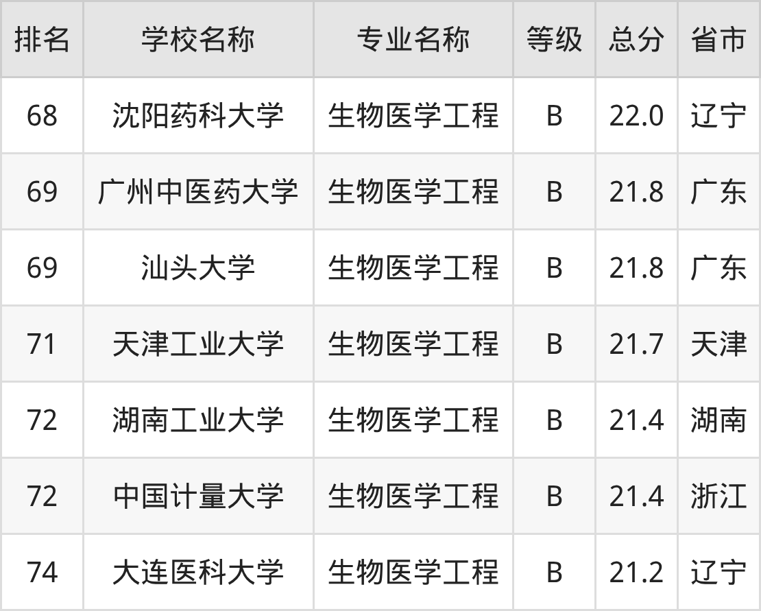 附生物医学工程专业全国74所院校排名榜单一览表!