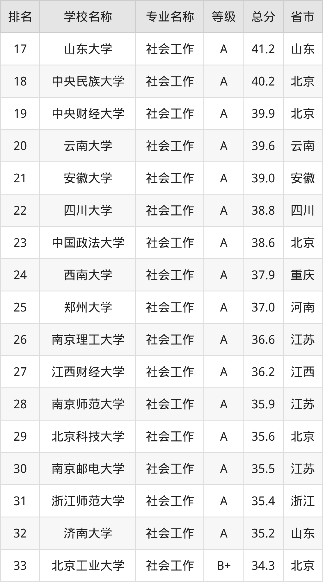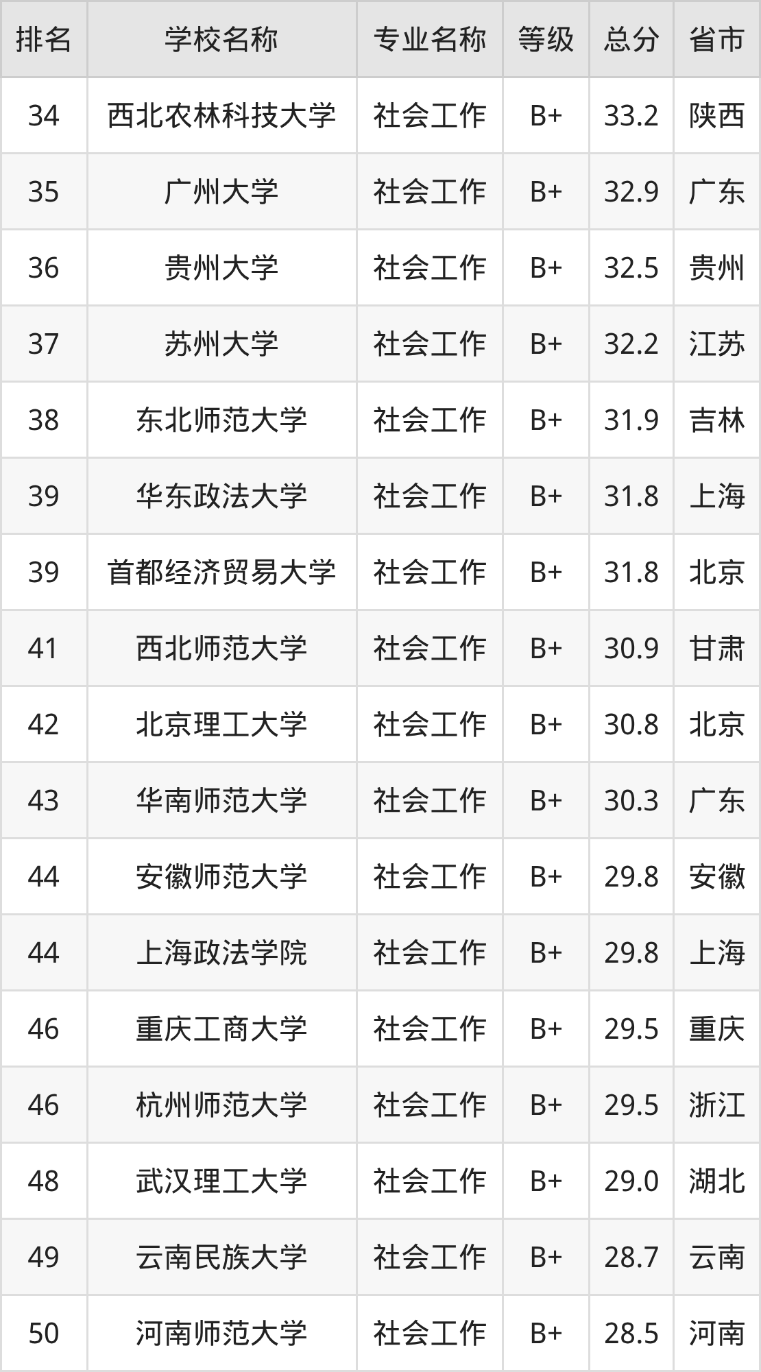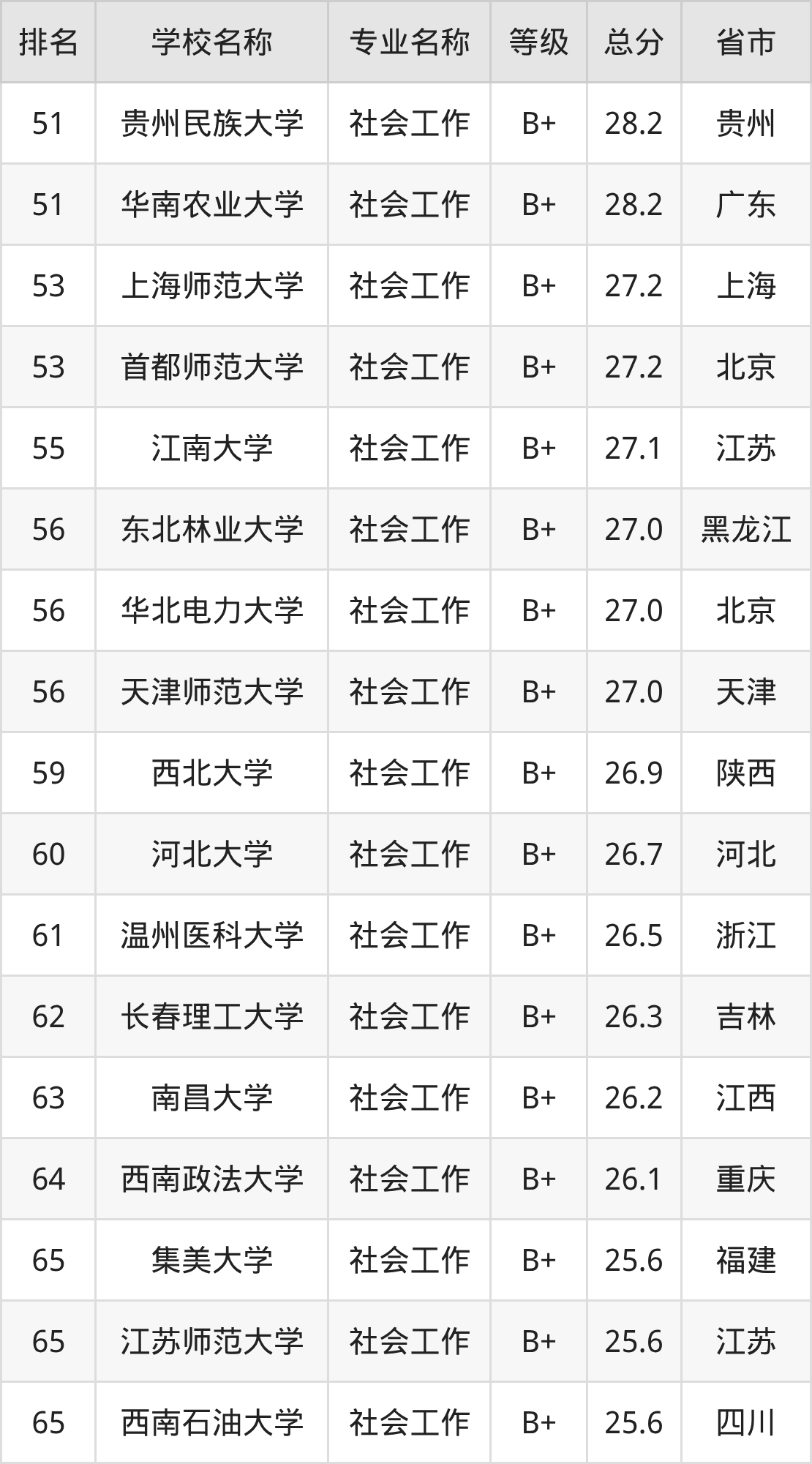 根据软科榜单可知,社会工作专业全国排名前十的大学分别是: