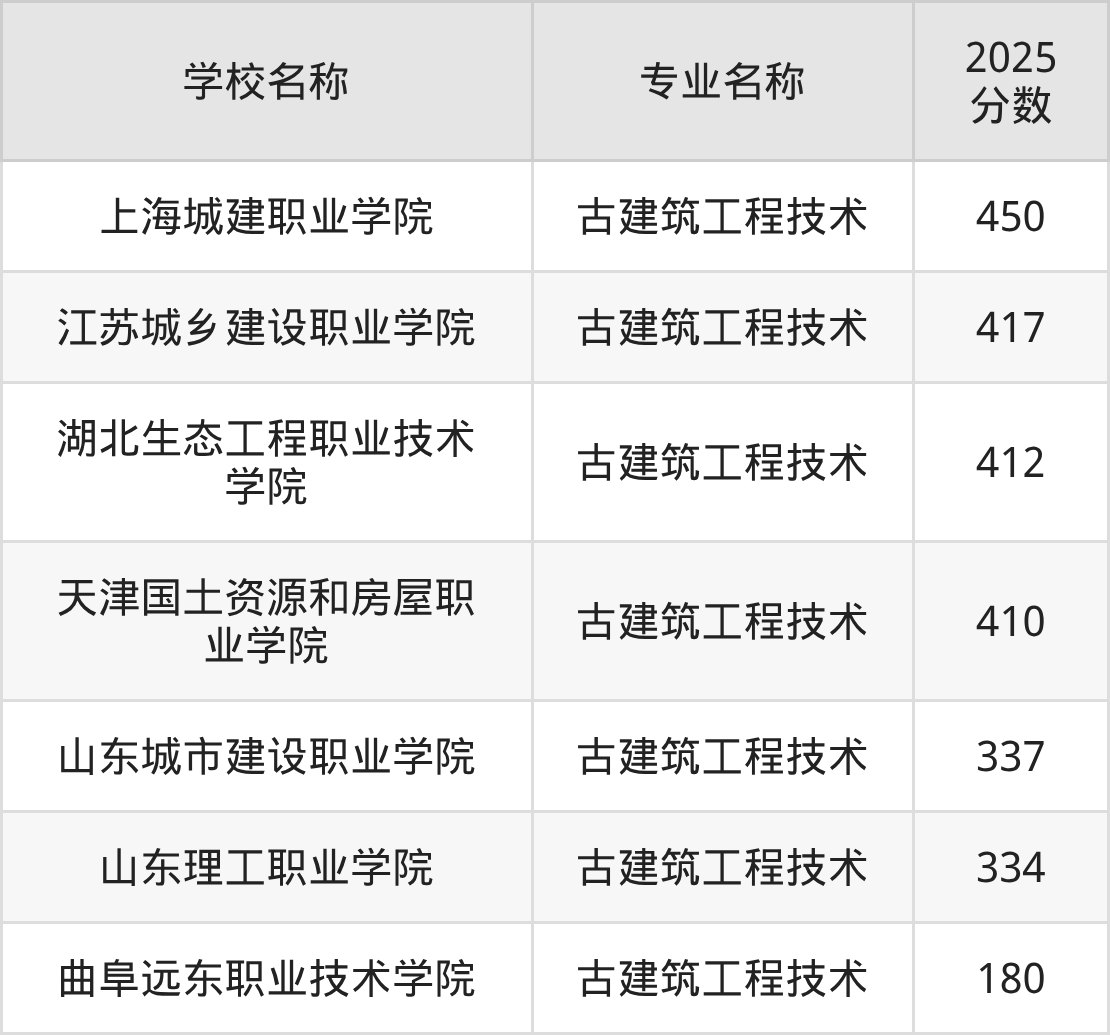 | 1 | 古建筑工程技术 | 上海城建职业学院 | 450 |
