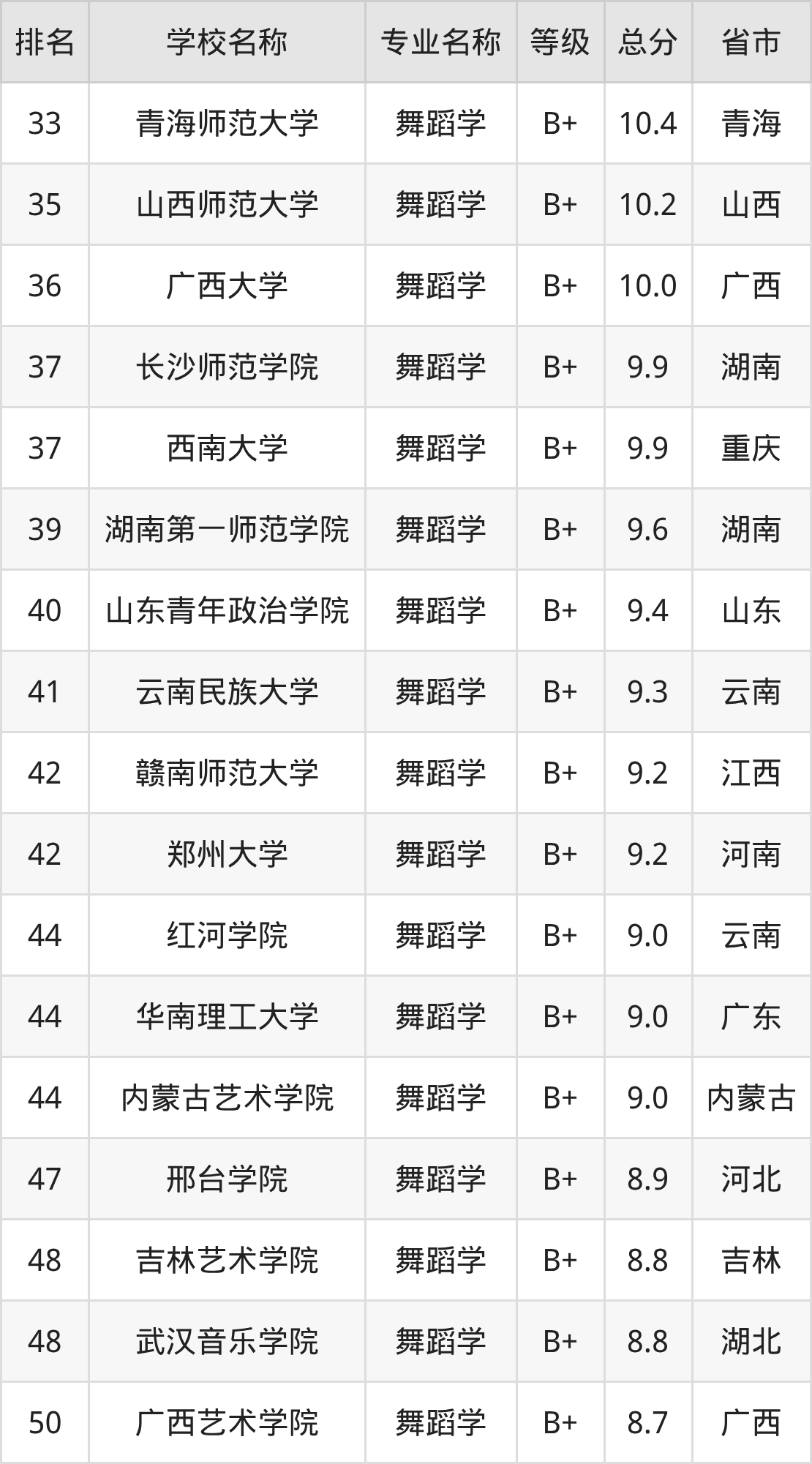 根据软科榜单可知,舞蹈学专业全国排名前十的大学分别是: