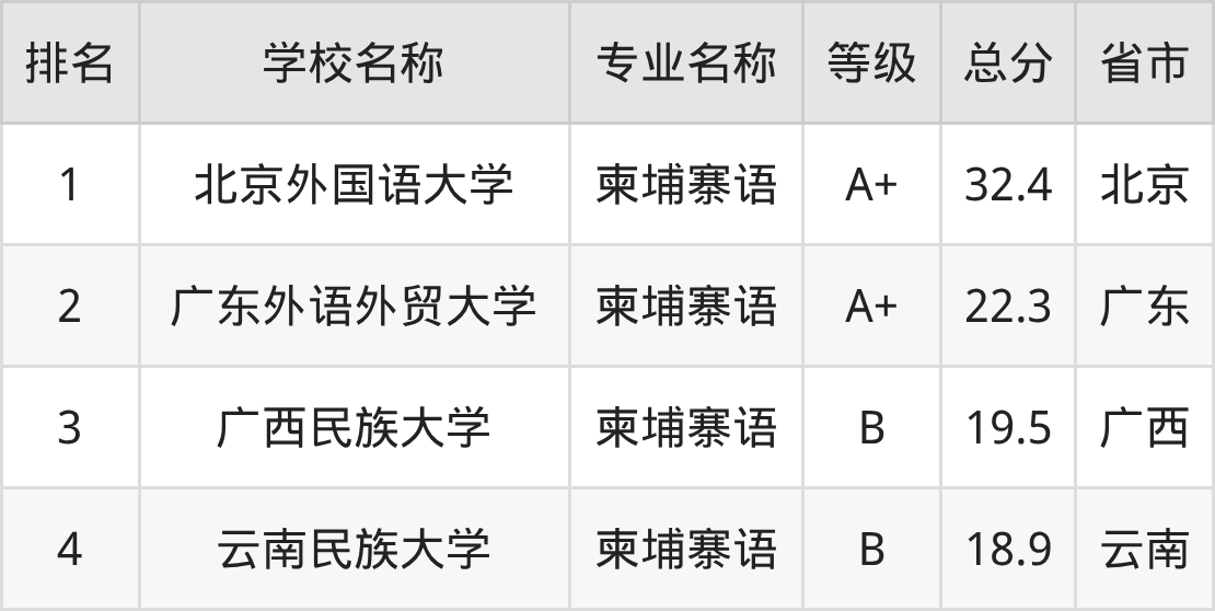 根据软科榜单可知,柬埔寨语专业全国排名前四的大学分别是: