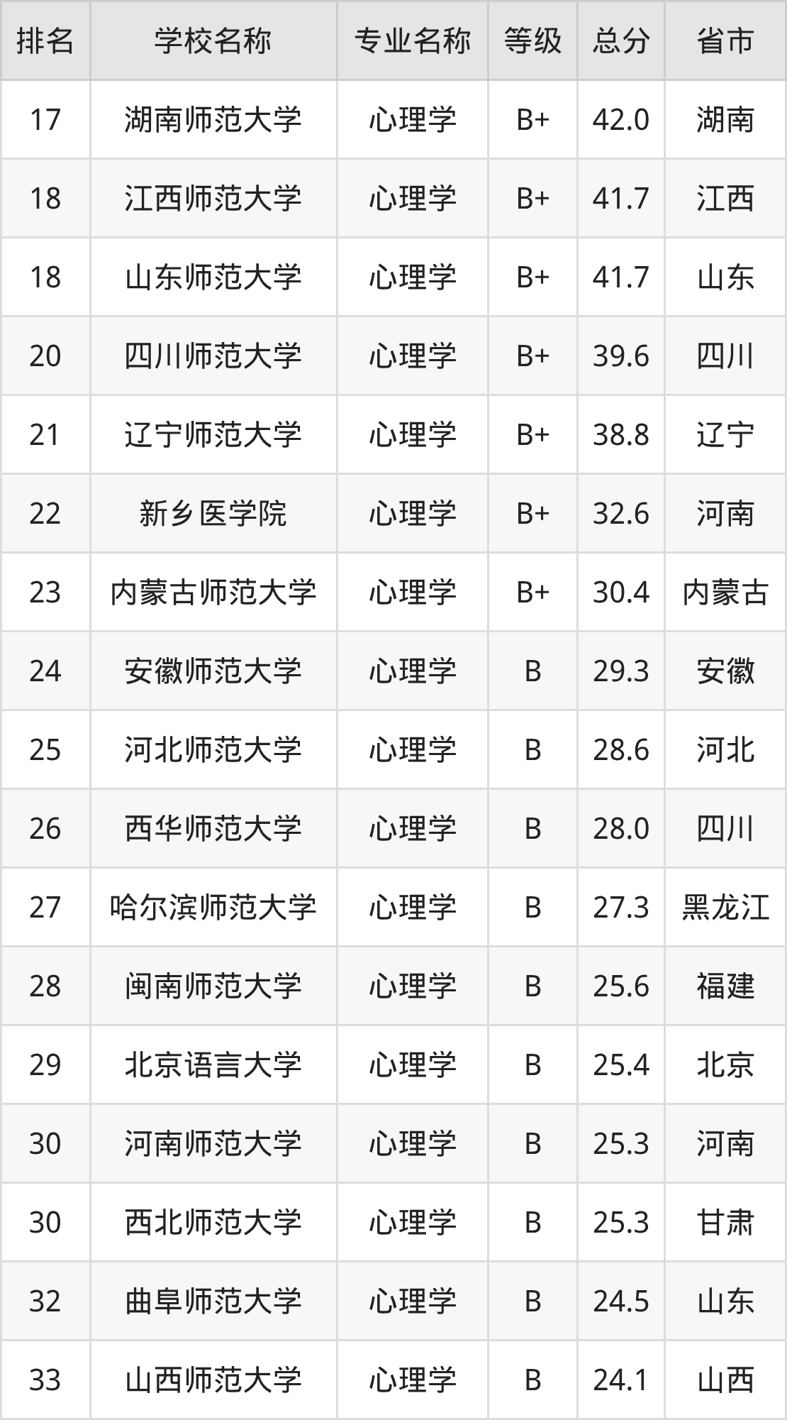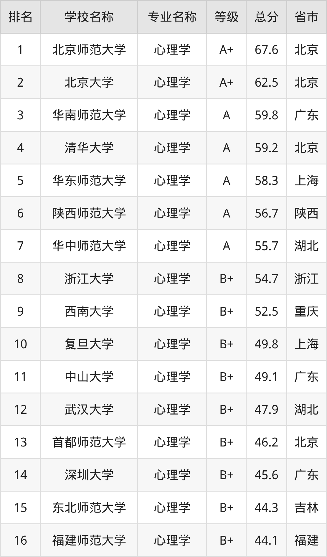 根据软科榜单可知,心理学专业全国排名前十的大学分别是: