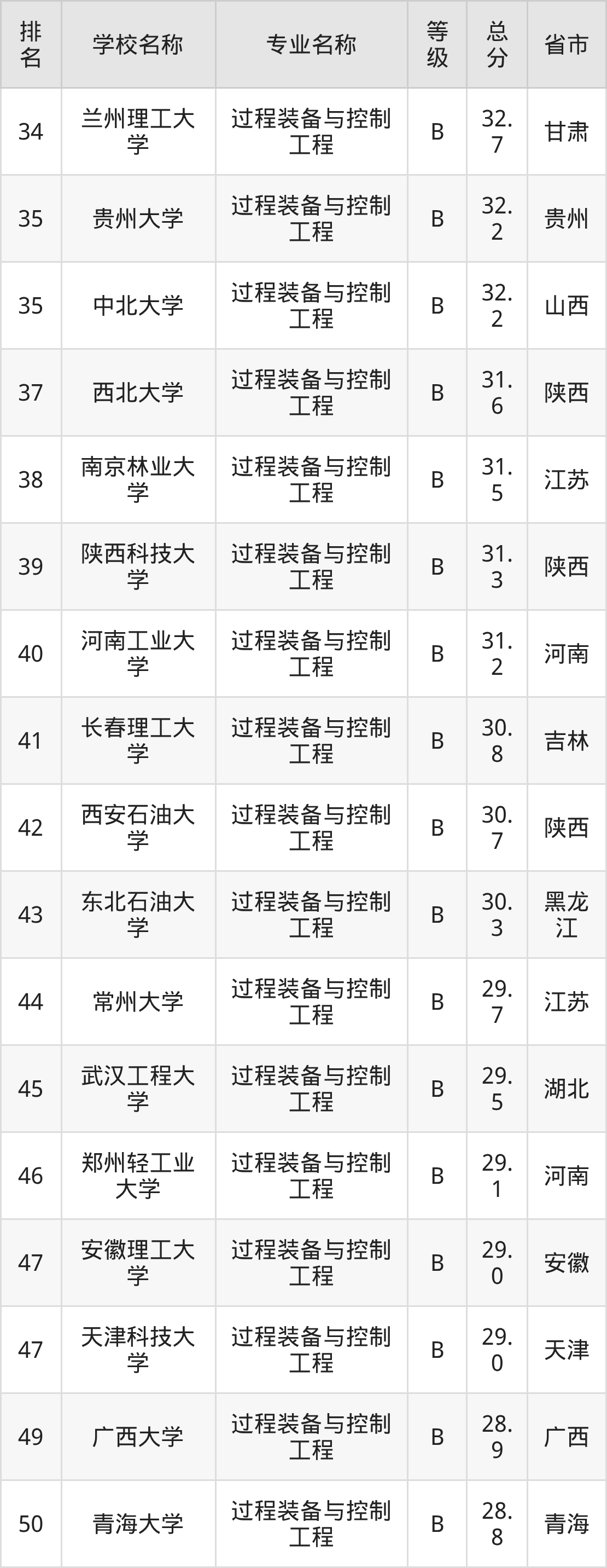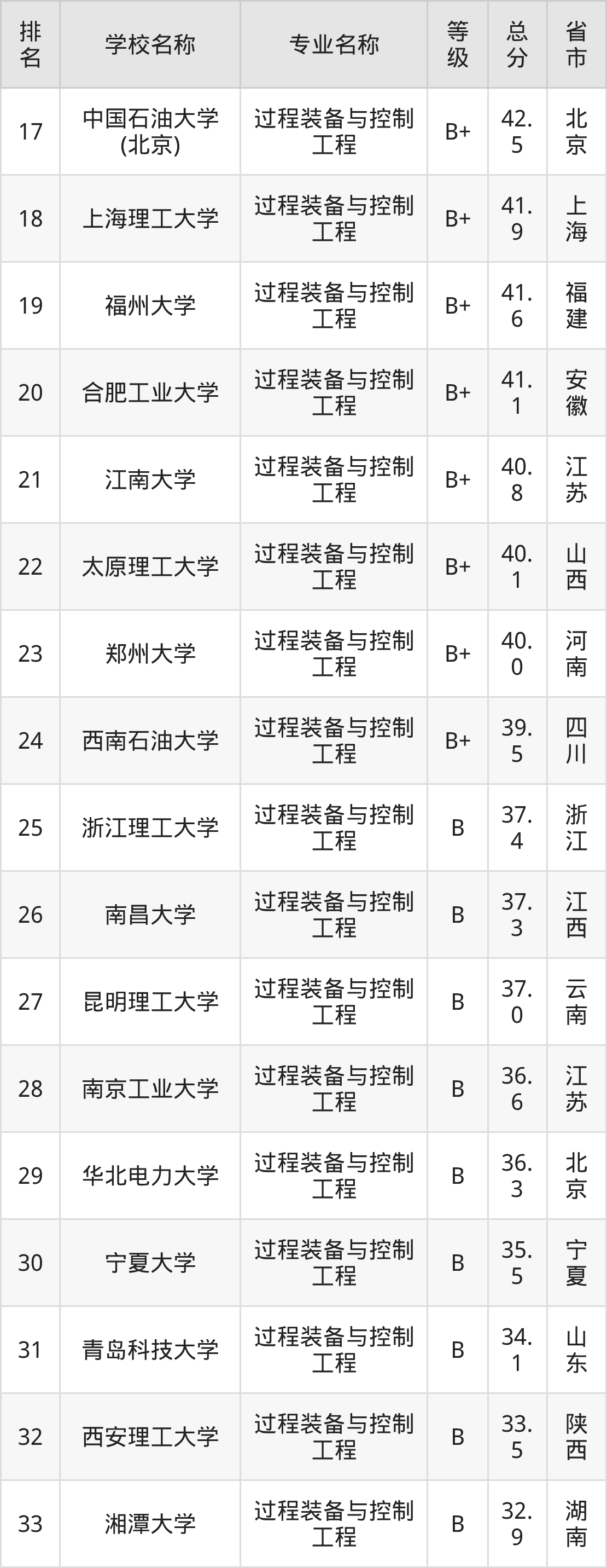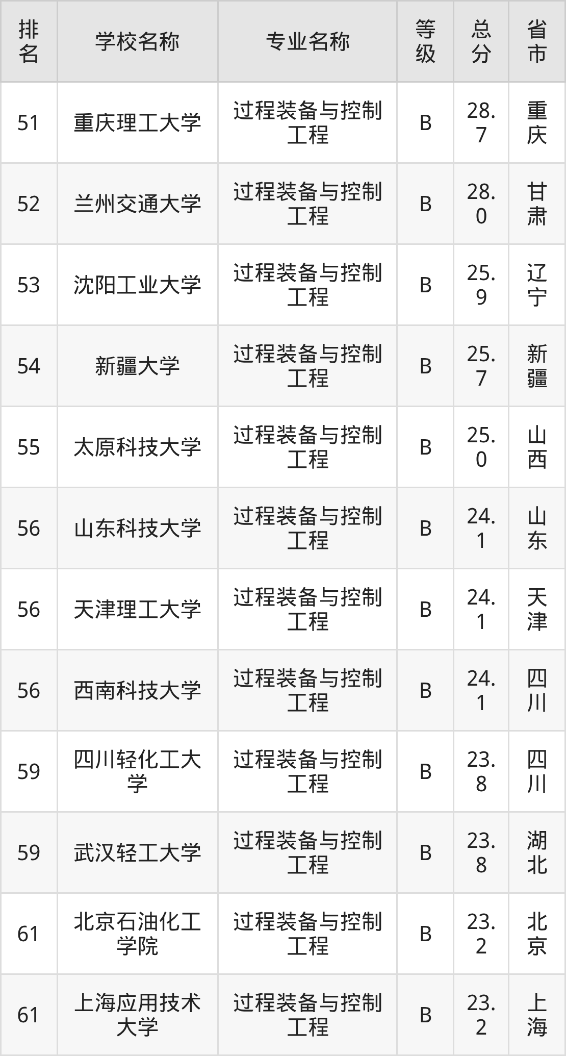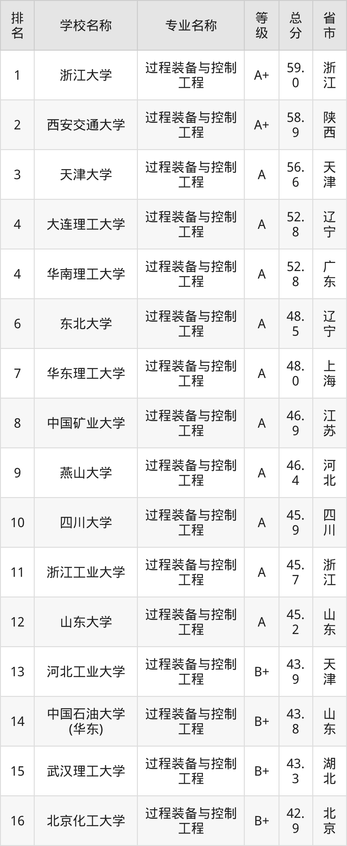 附过程装备与控制工程专业全国62所院校排名榜单一览表!