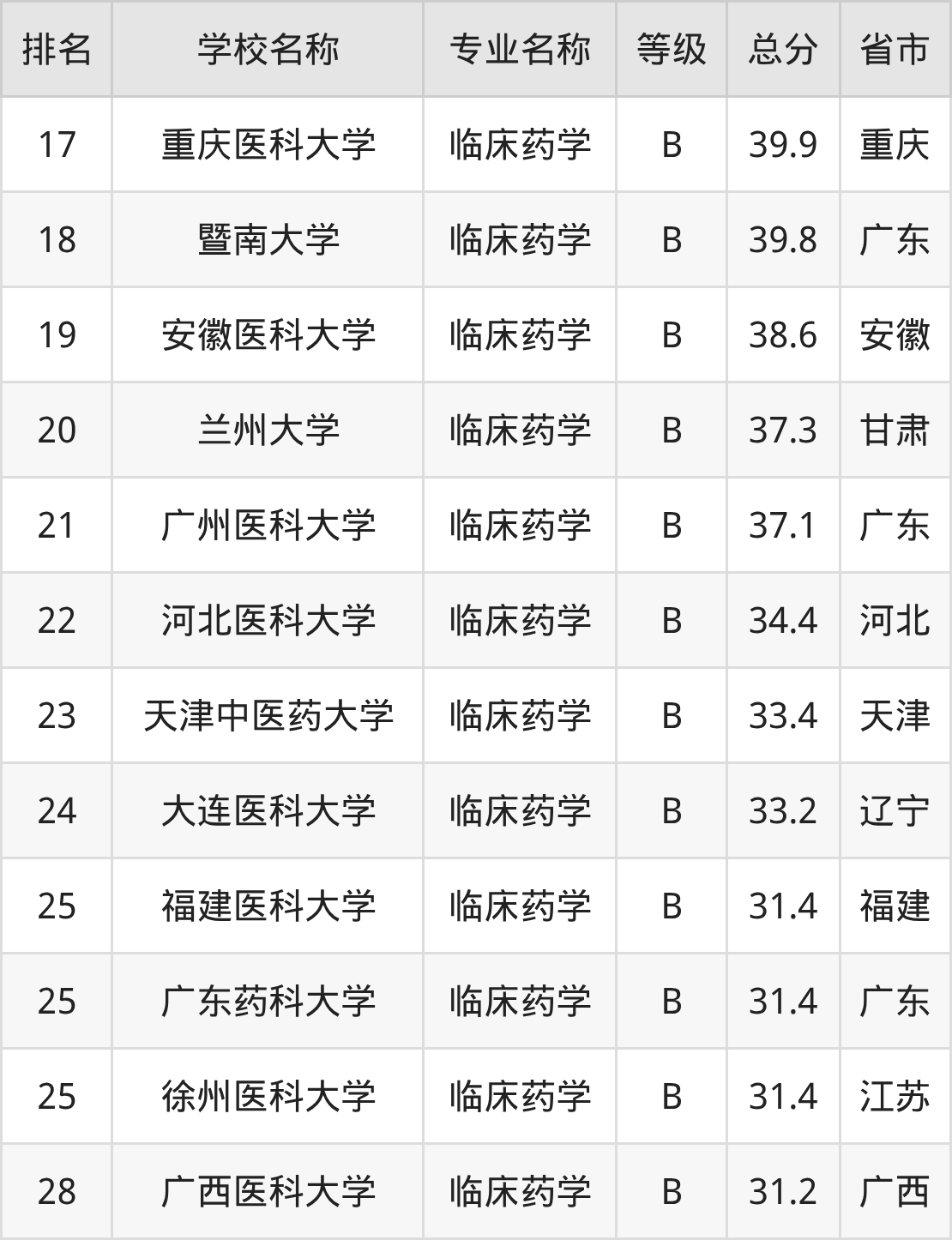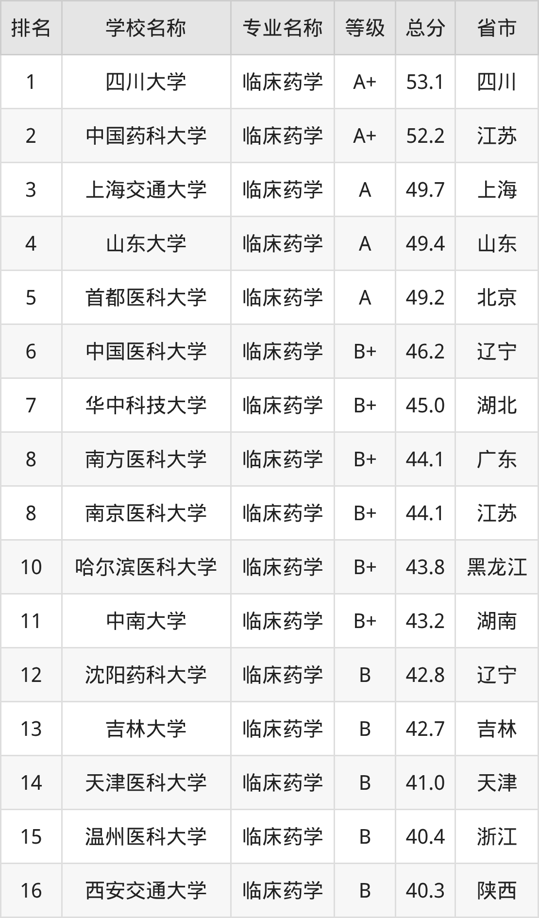 根据软科榜单可知,临床药学专业全国排名前十的大学分别是: