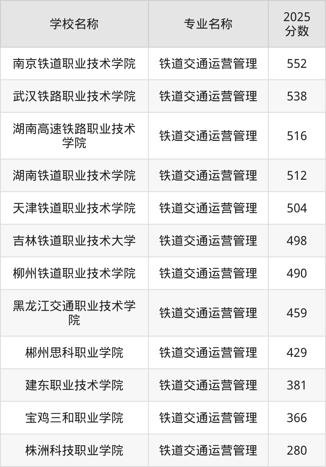 下面是2025年全国专科铁道交通运营管理专业大学录取分数线。