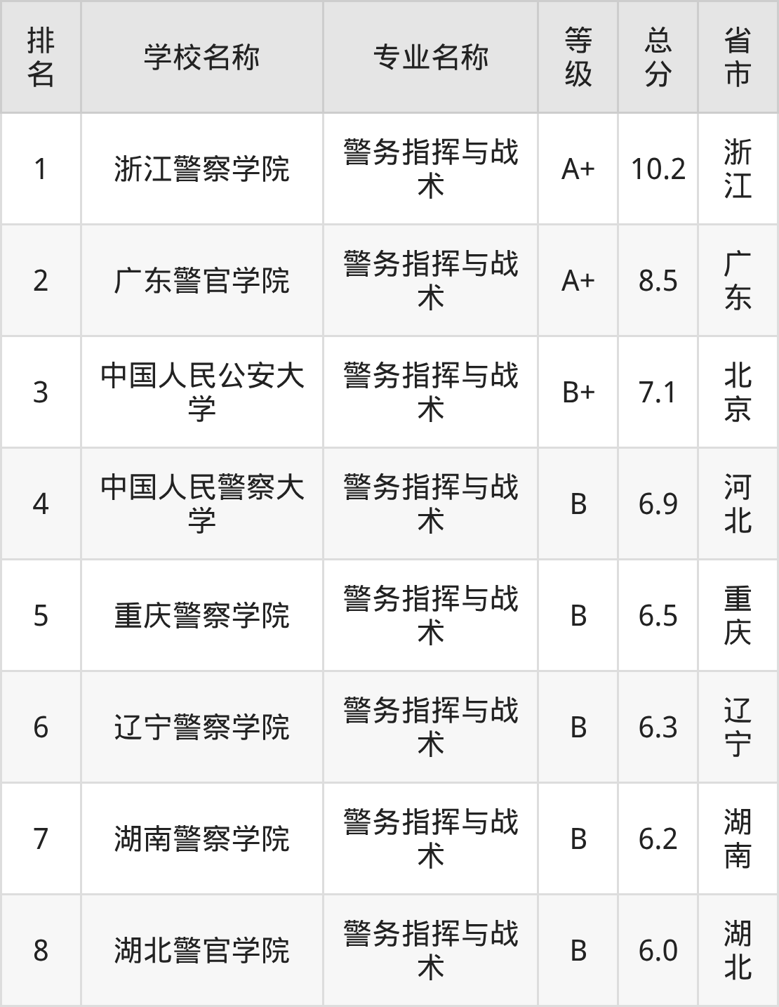 浙江警察学院:第1名,评分为10.2