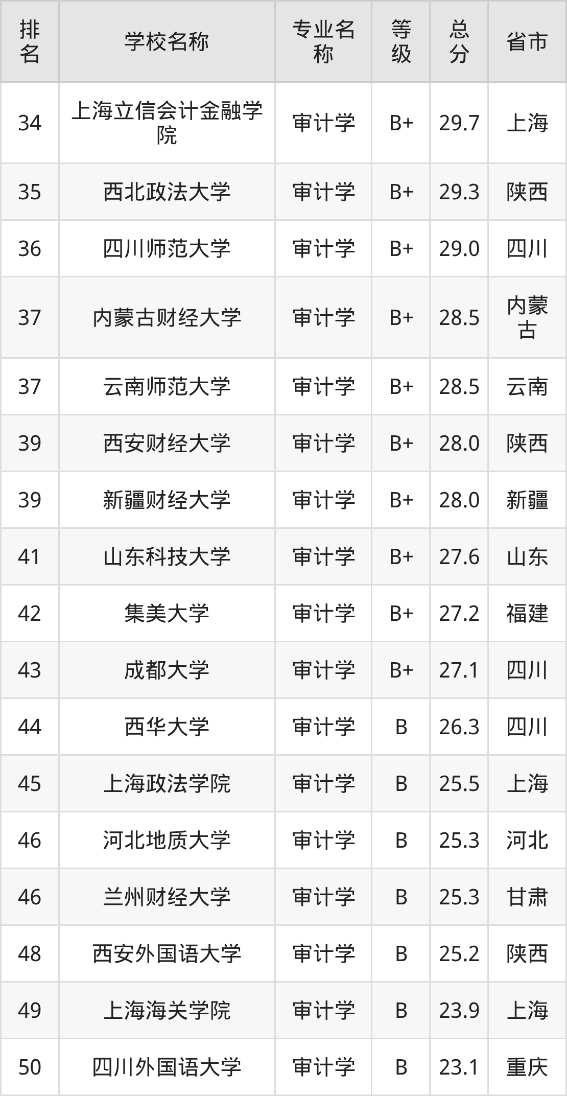 根据软科榜单可知,审计学专业全国排名前十的大学分别是: