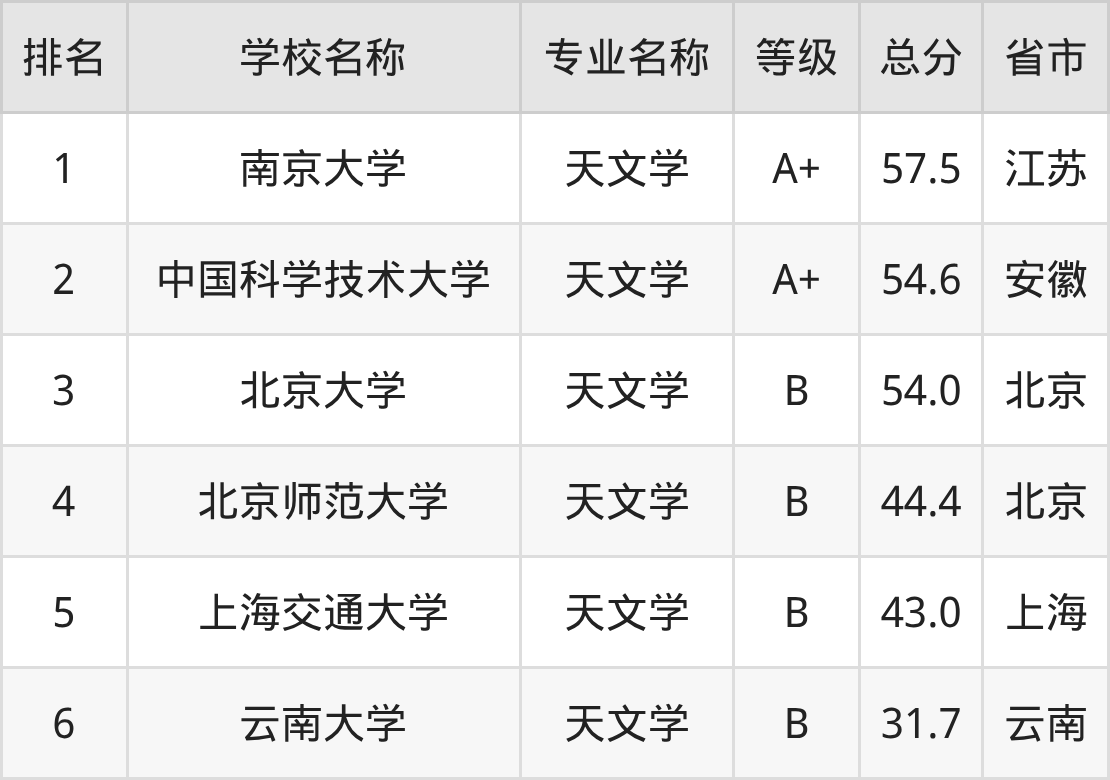 根据软科榜单可知,天文学专业全国排名前六的大学分别是: