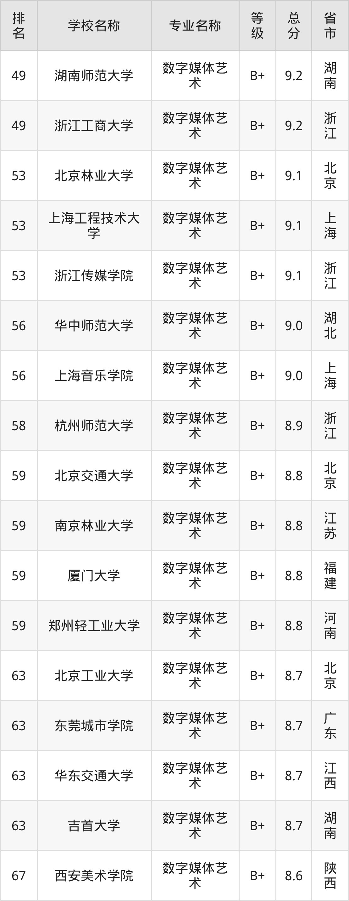 根据软科榜单可知,数字媒体艺术专业全国排名前十的大学分别是: