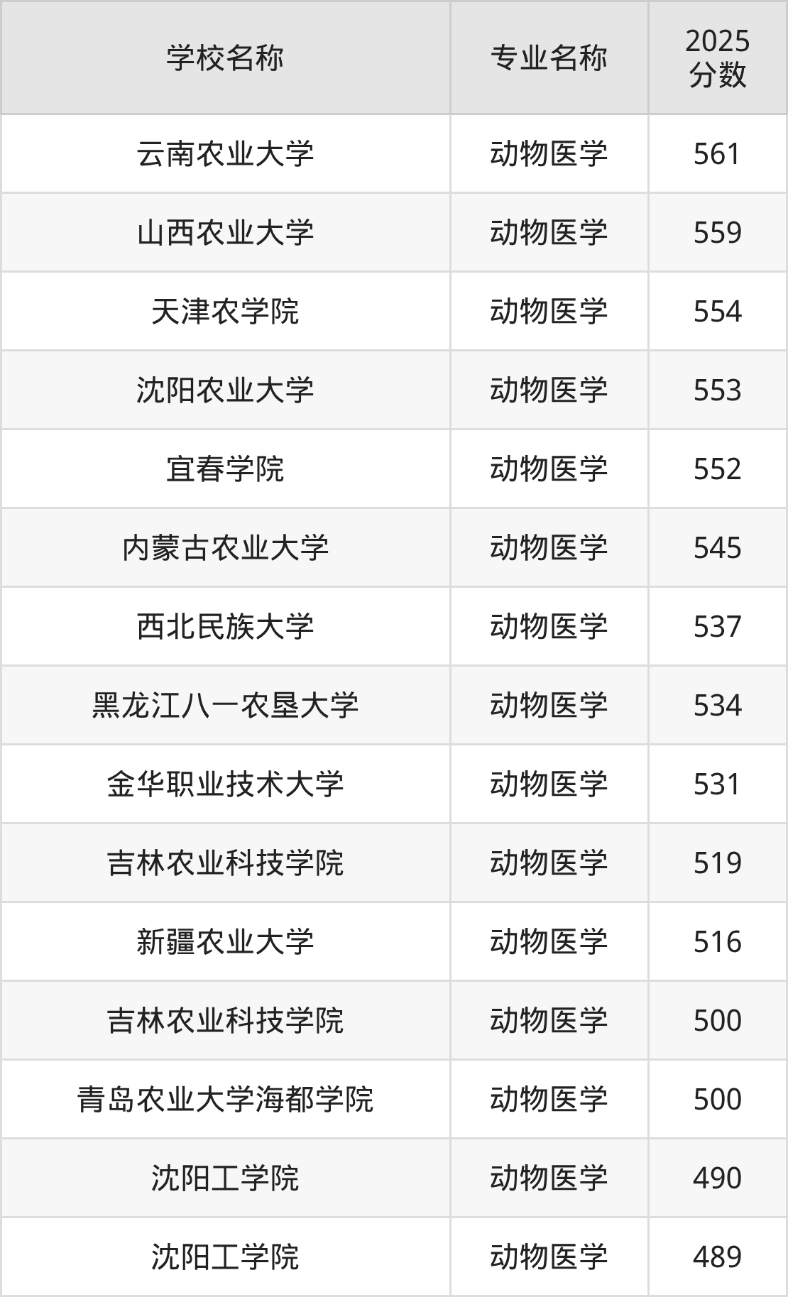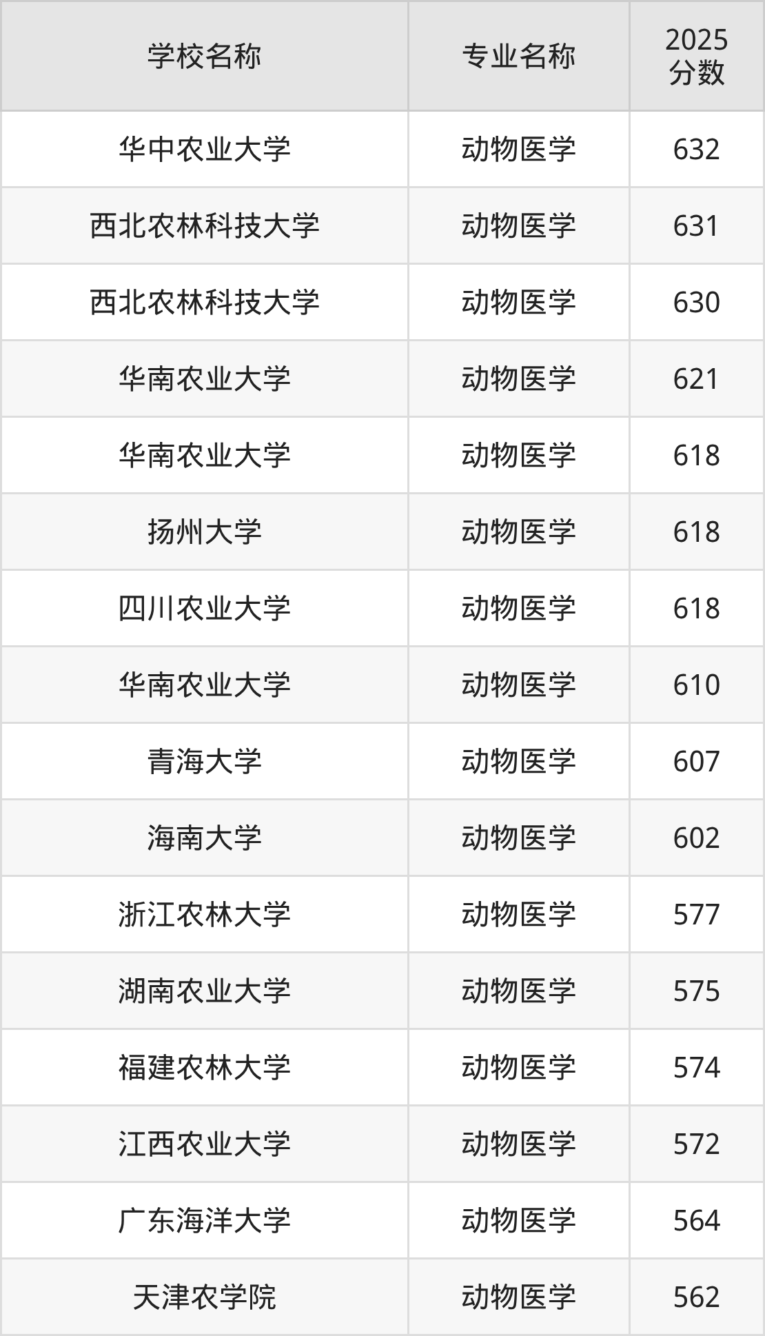 下面是2025年全国本科动物医学专业大学录取分数线。
