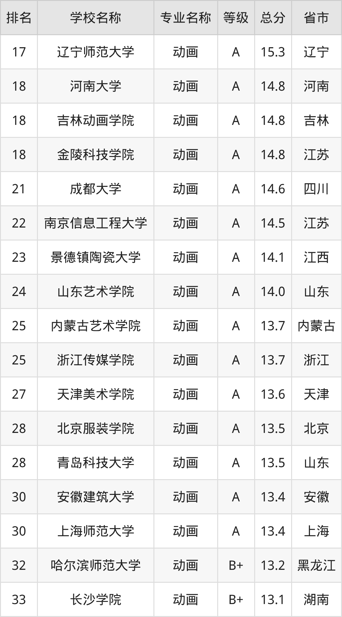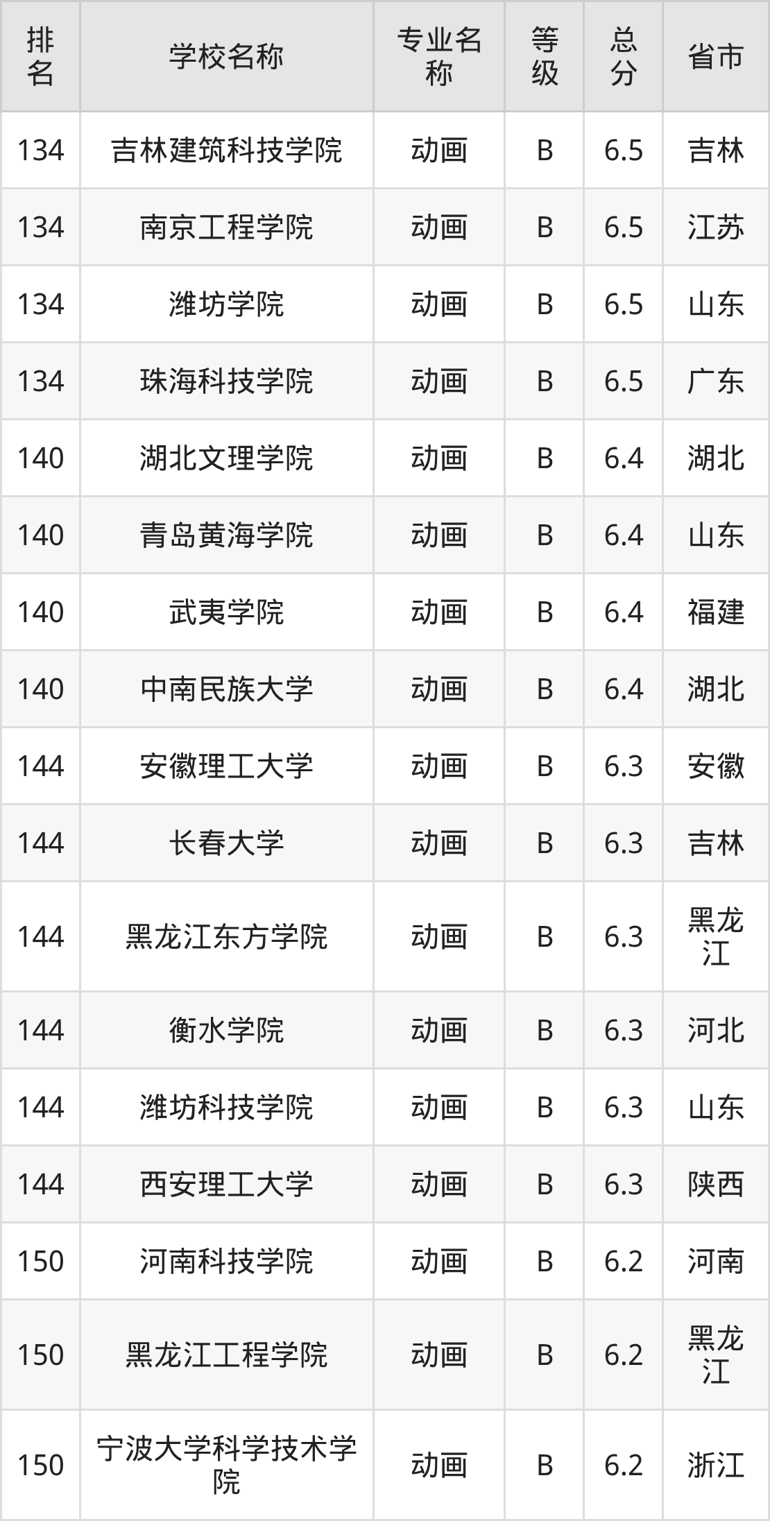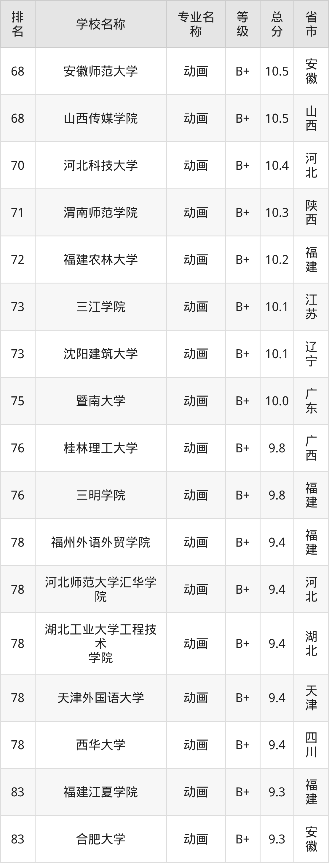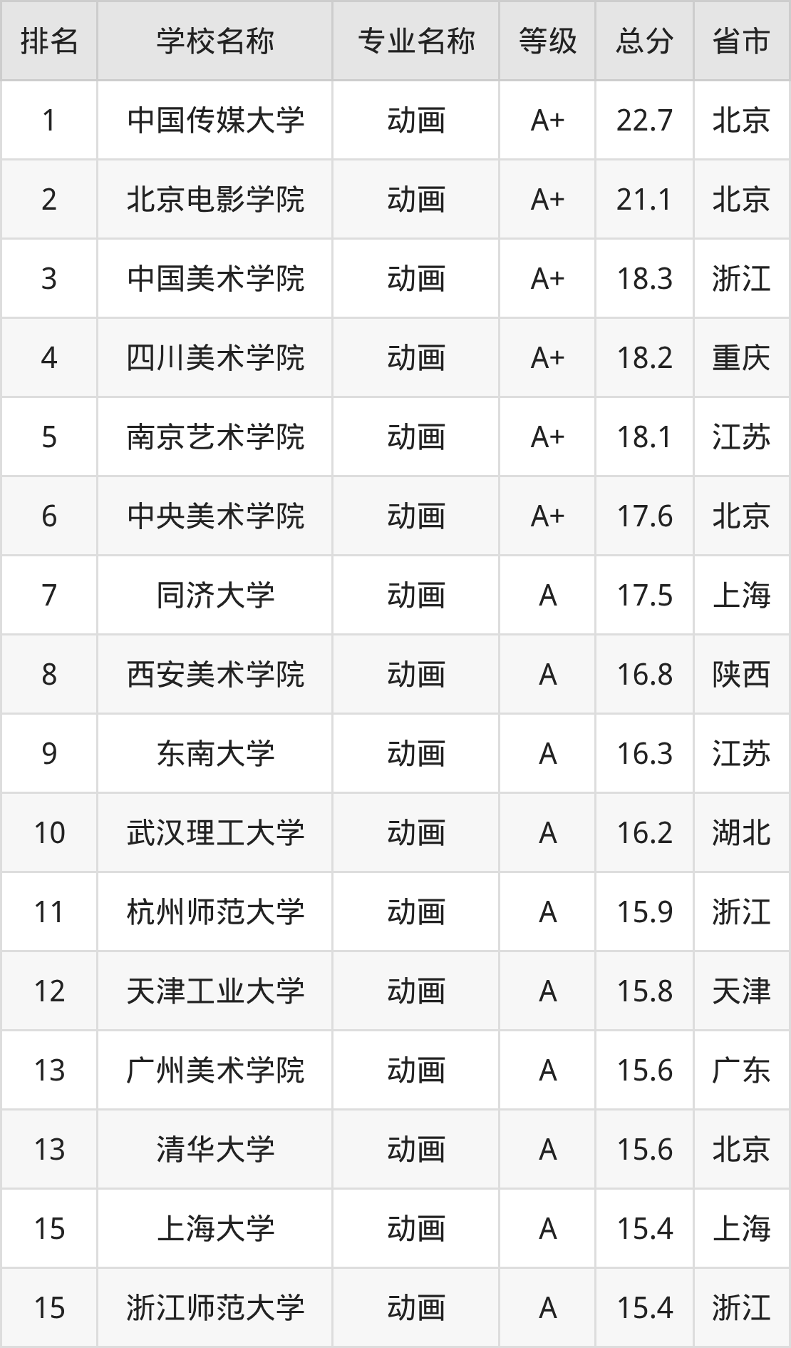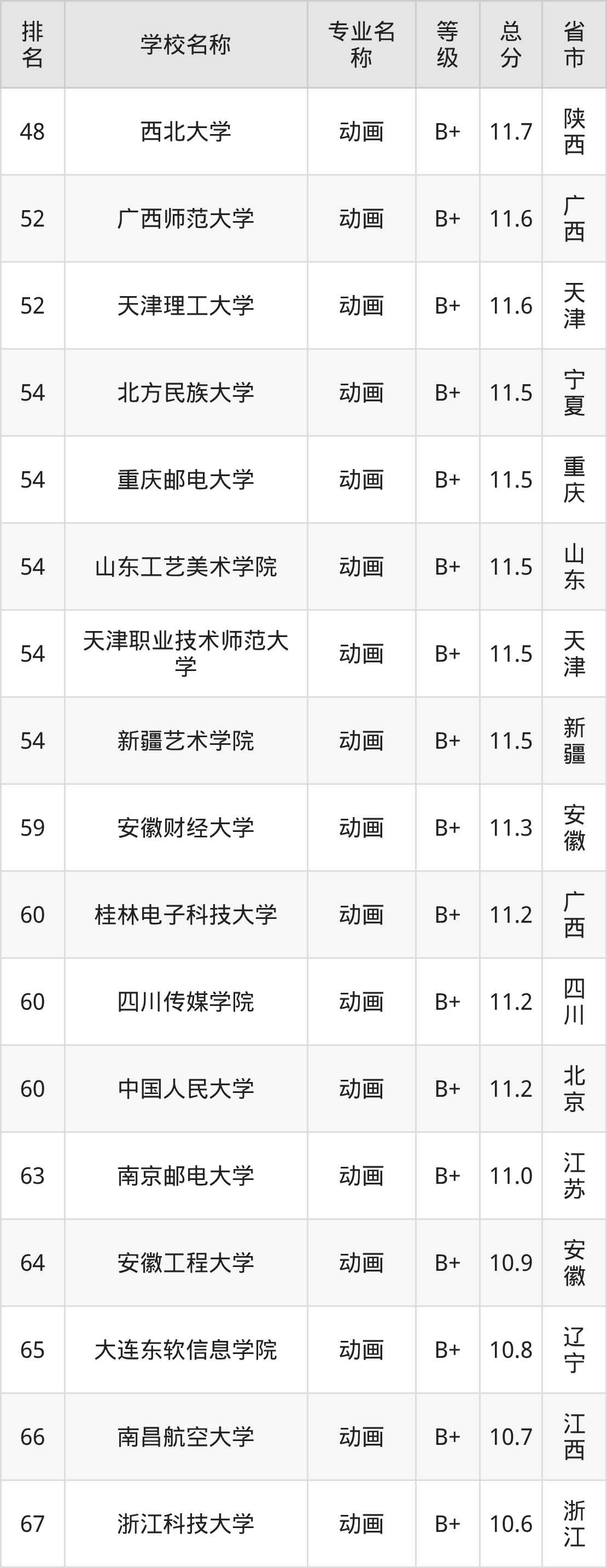 根据软科榜单可知,动画专业全国排名前十的大学分别是: