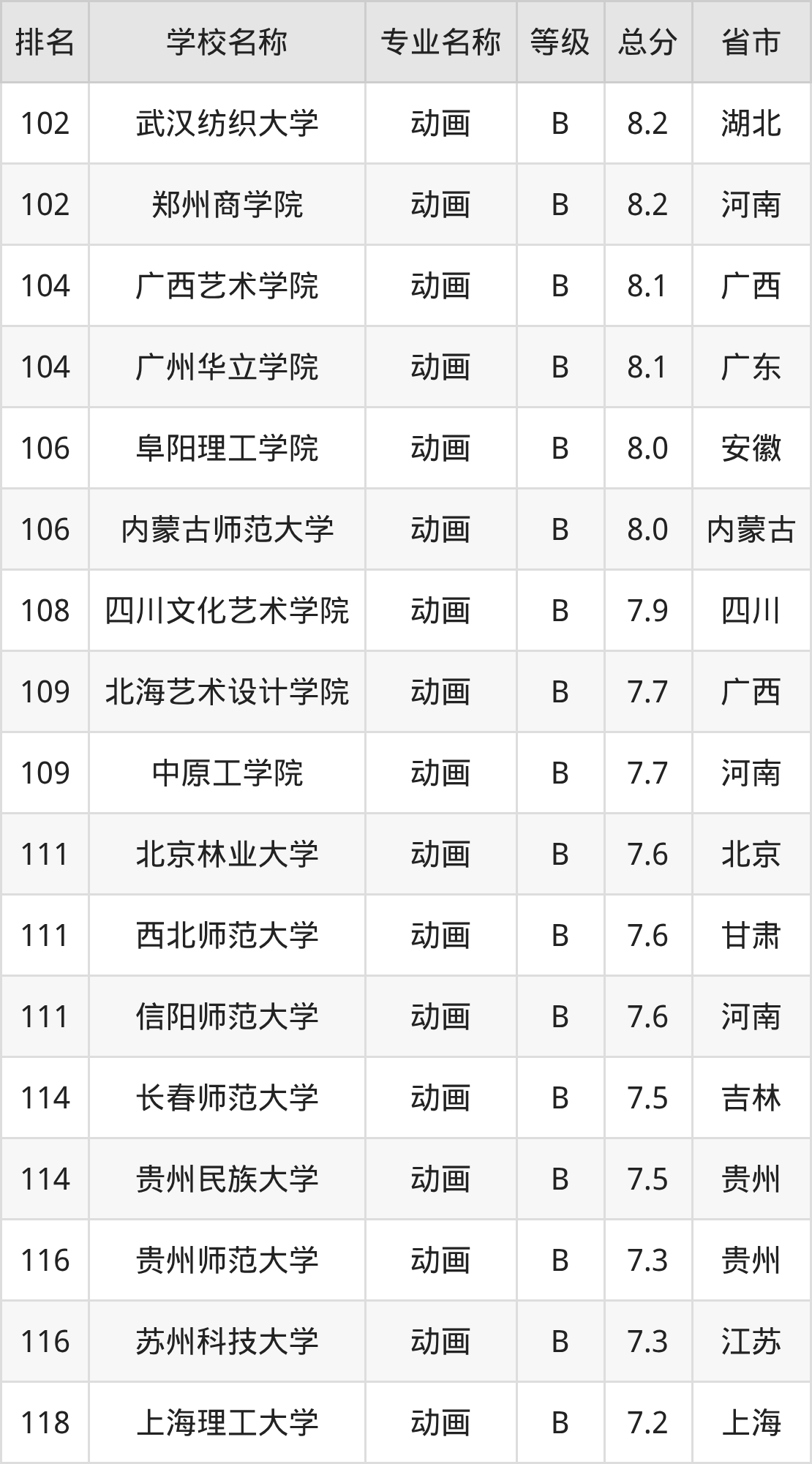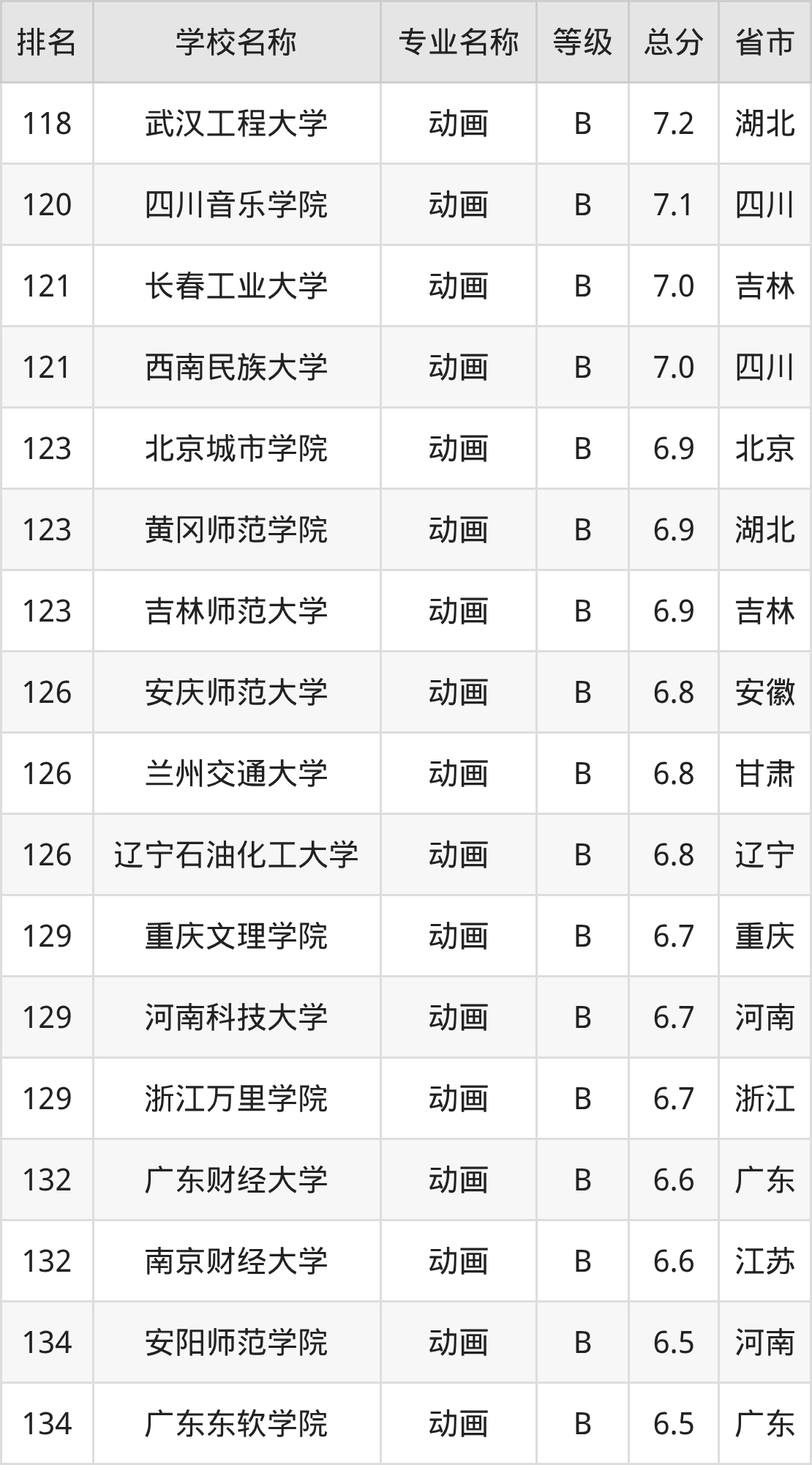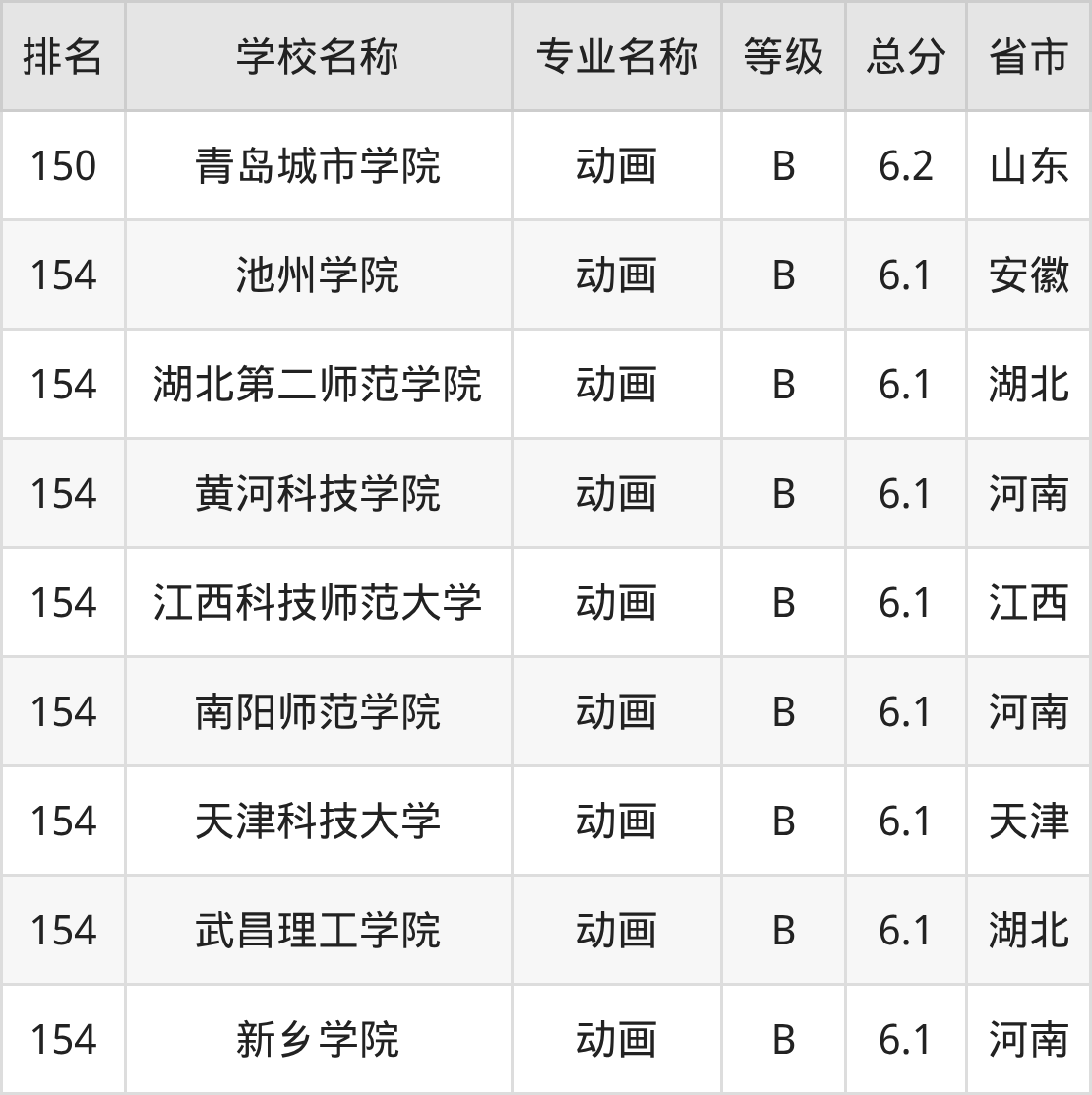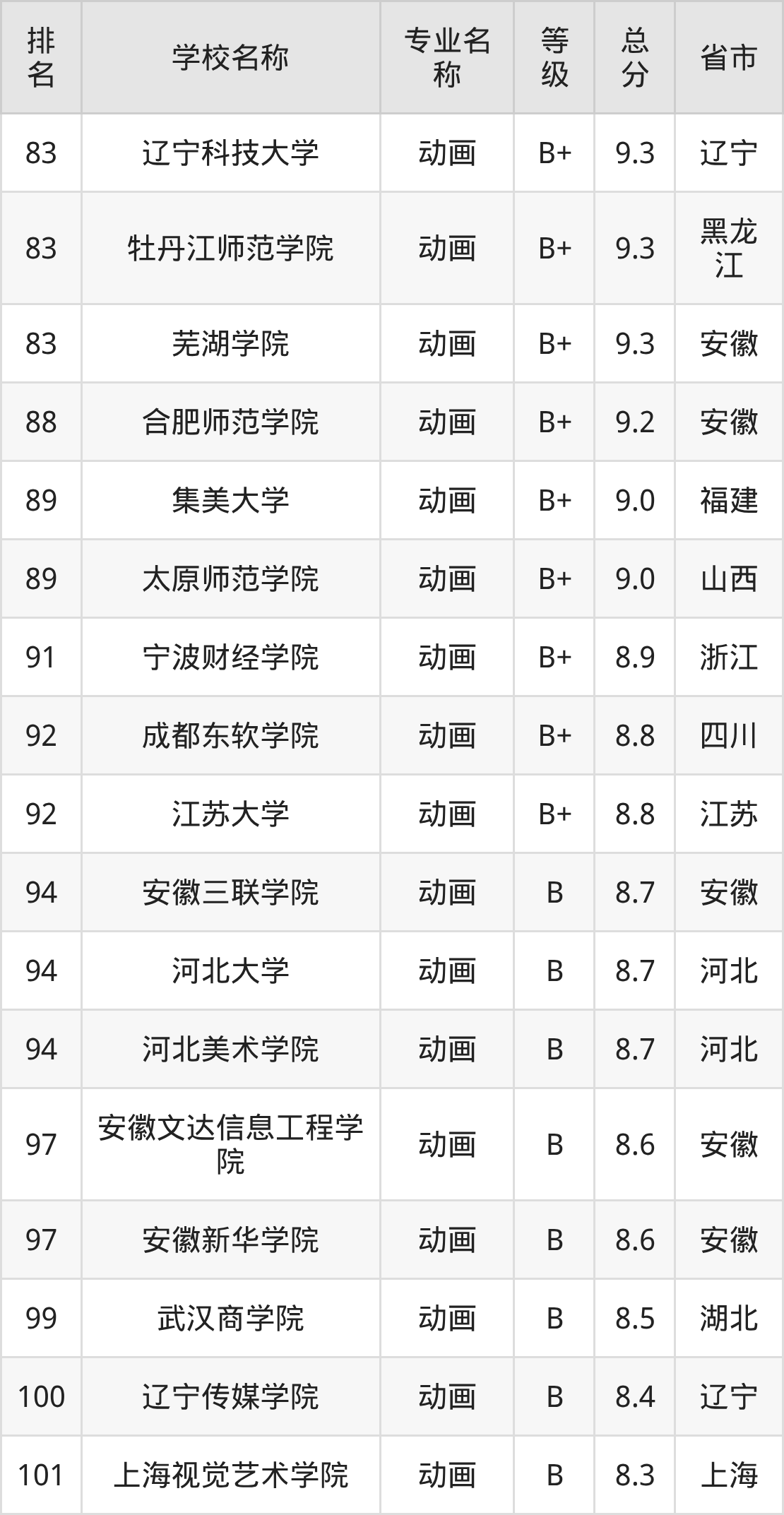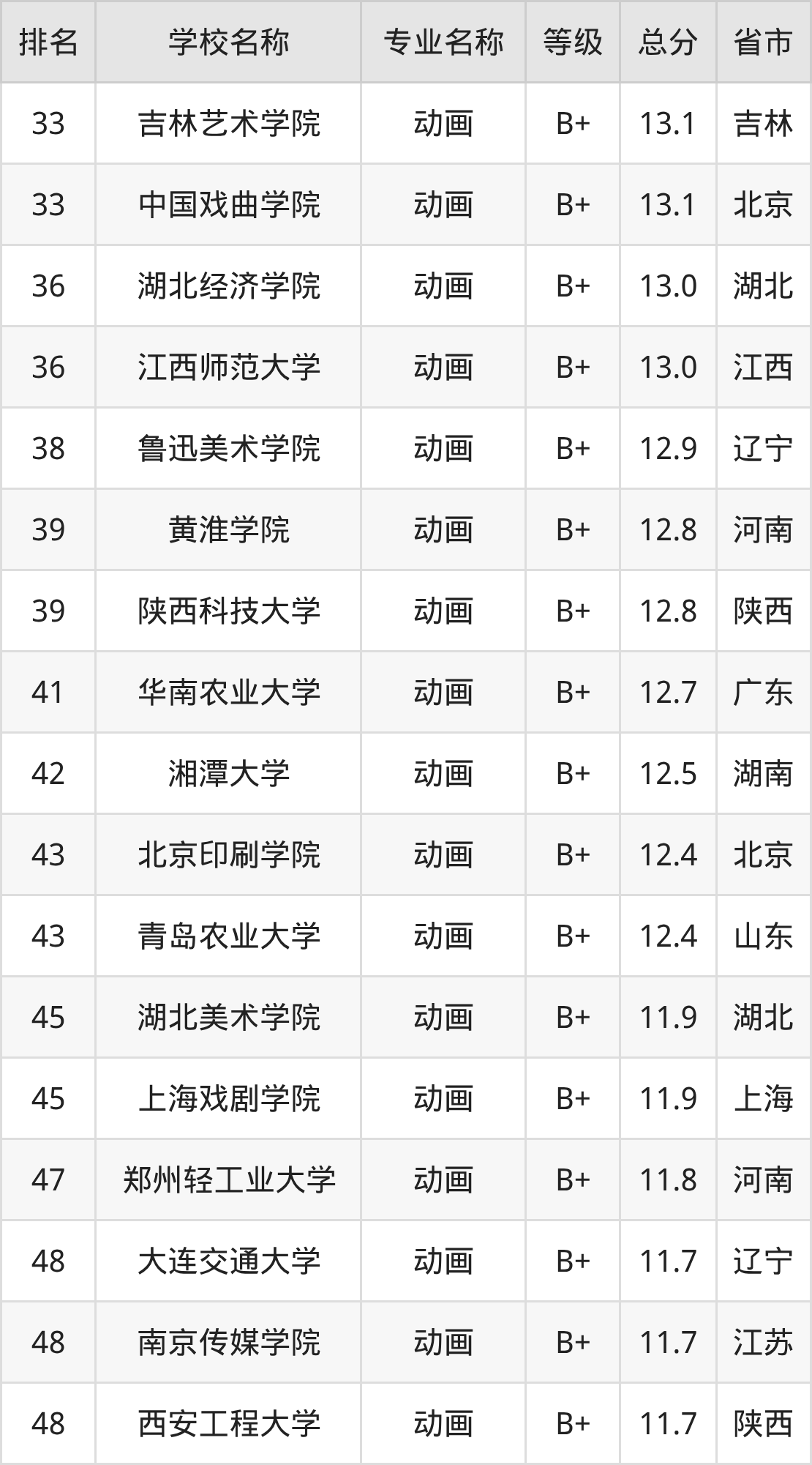 根据软科榜单可知,动画专业全国排名前十的大学分别是: