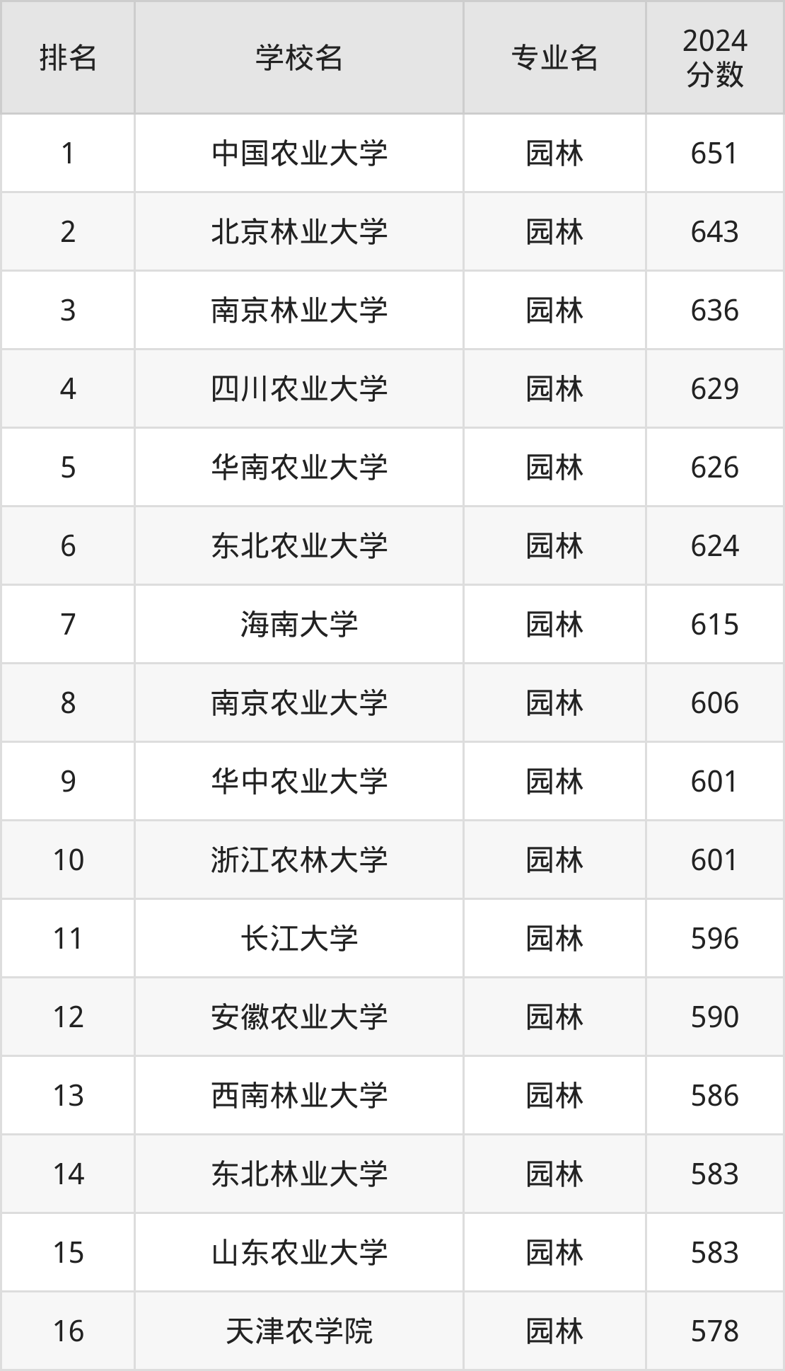 (注:不包含把园林专业列在大类专业中招生的名校)