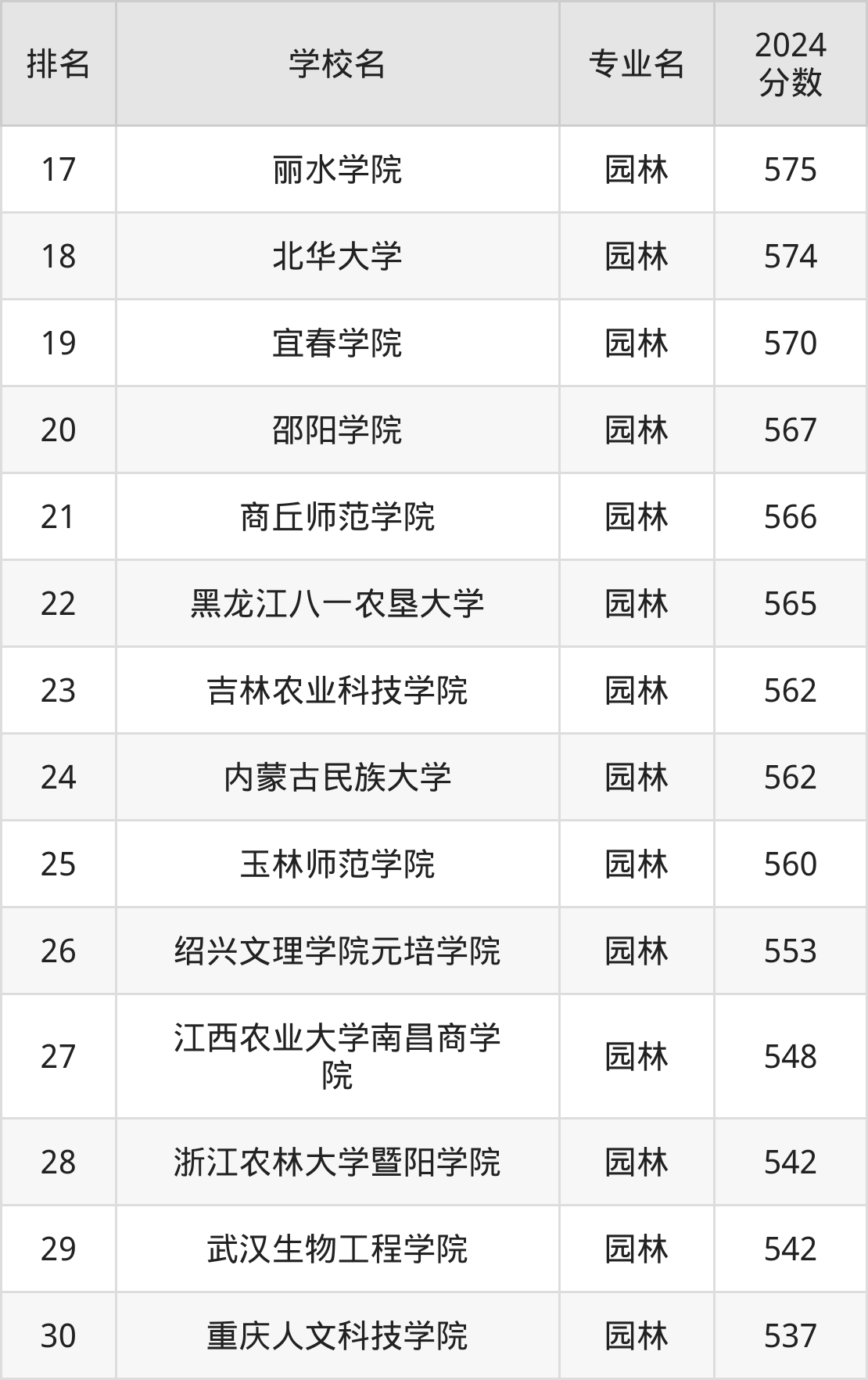 以下为全国园林专业在浙江省分数线排名前30的大学。