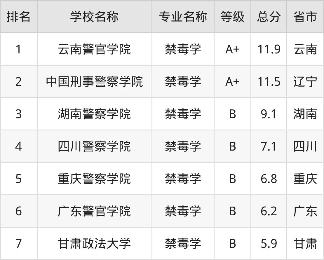 2025年禁毒学专业全国大学排名中,排名第一的是云南警官学院,被软科榜单评为:禁毒学专业实力最强的本科院校。本文将展示禁毒学专业上榜软科榜单的7所院校排名以及等级评分,供2026年想读禁毒学专业的同学们参考!