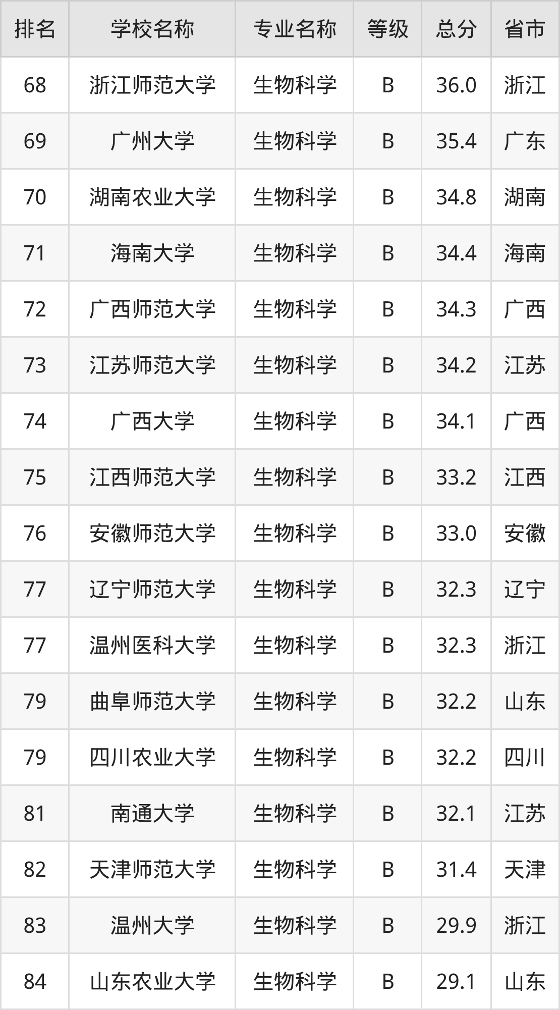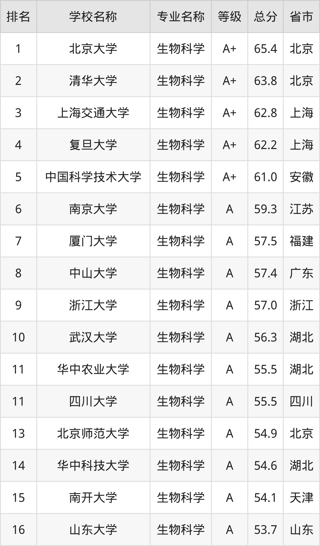 根据软科榜单可知,生物科学专业全国排名前十的大学分别是: