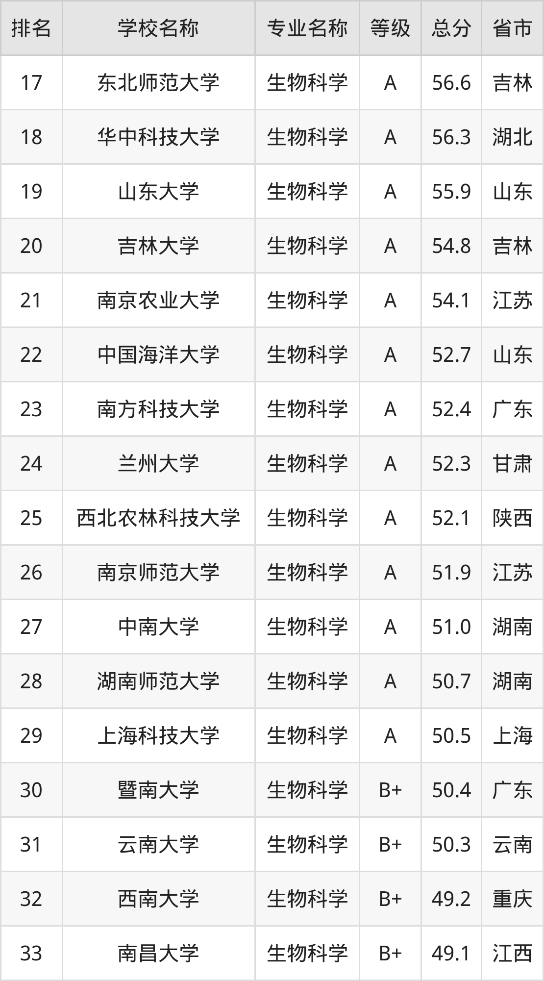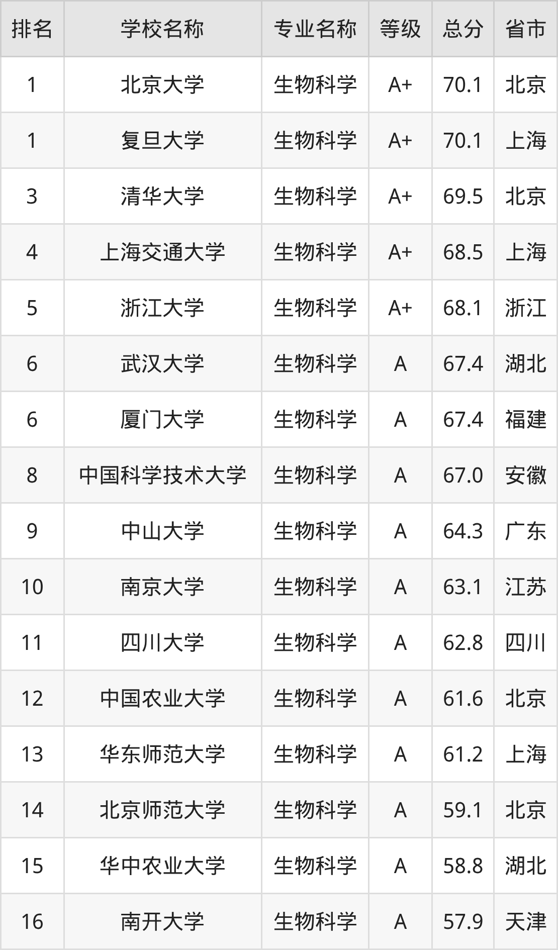 一、2025年生物科学专业全国大学排名