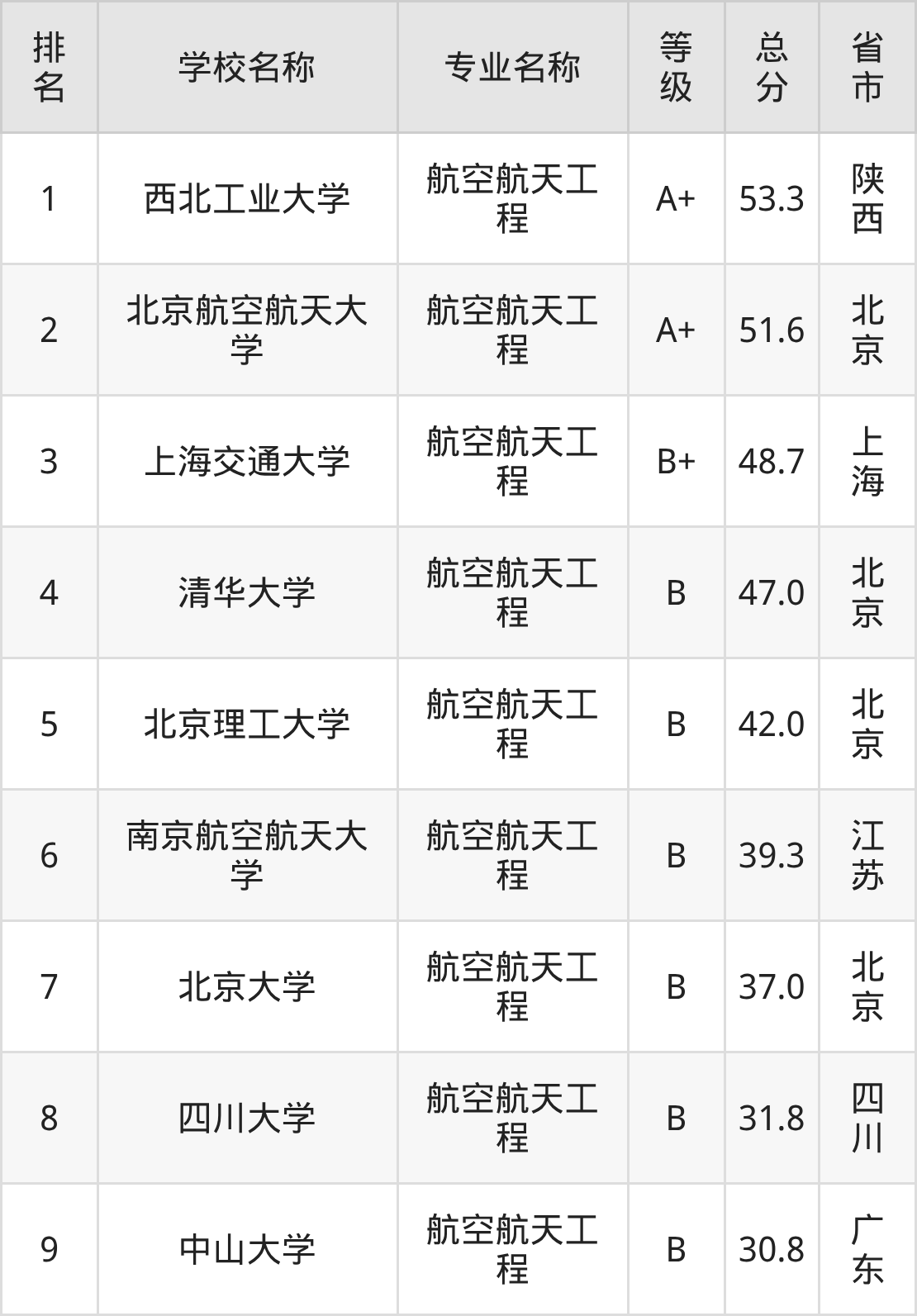 根据软科榜单可知,航空航天工程专业全国排名前九的大学分别是: