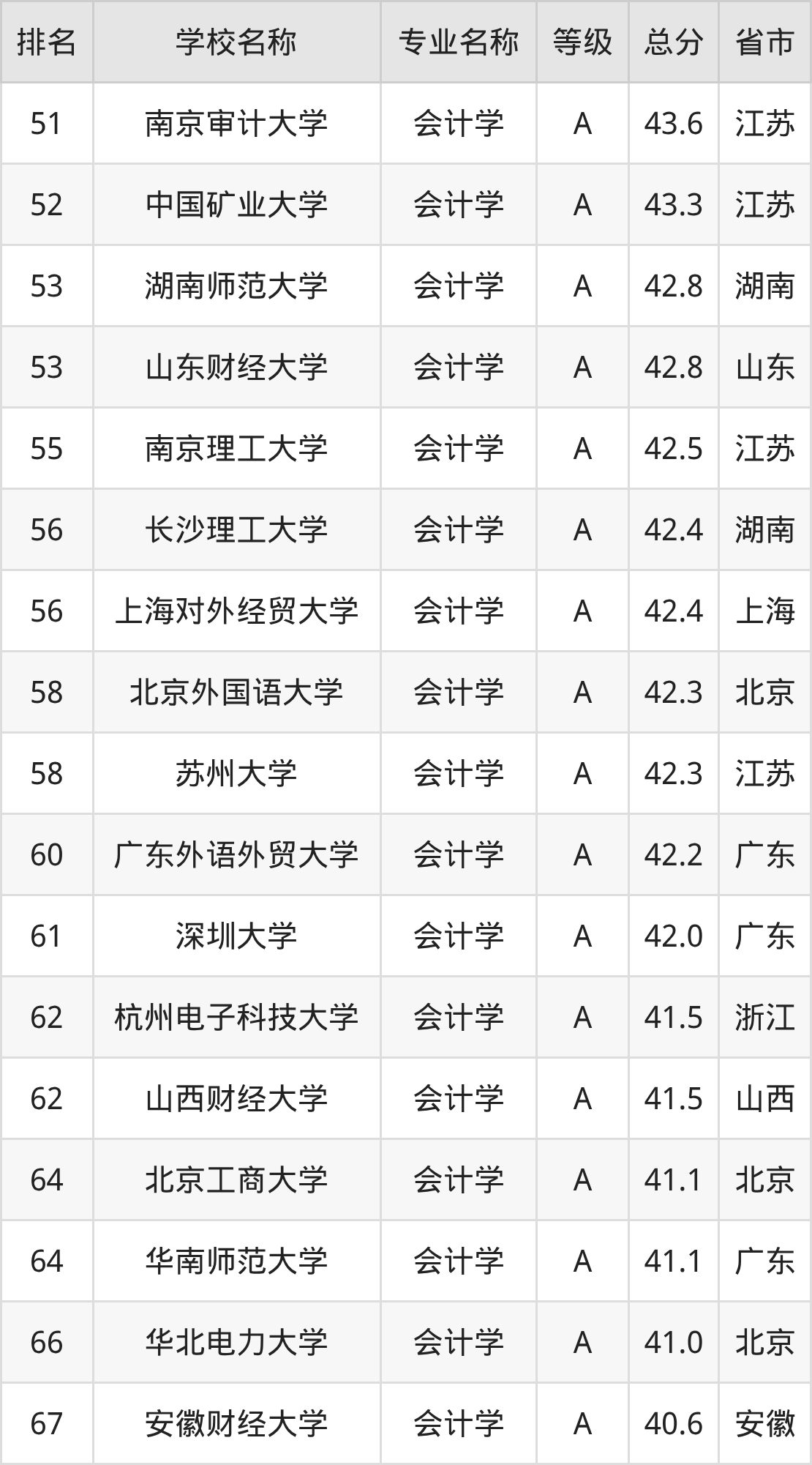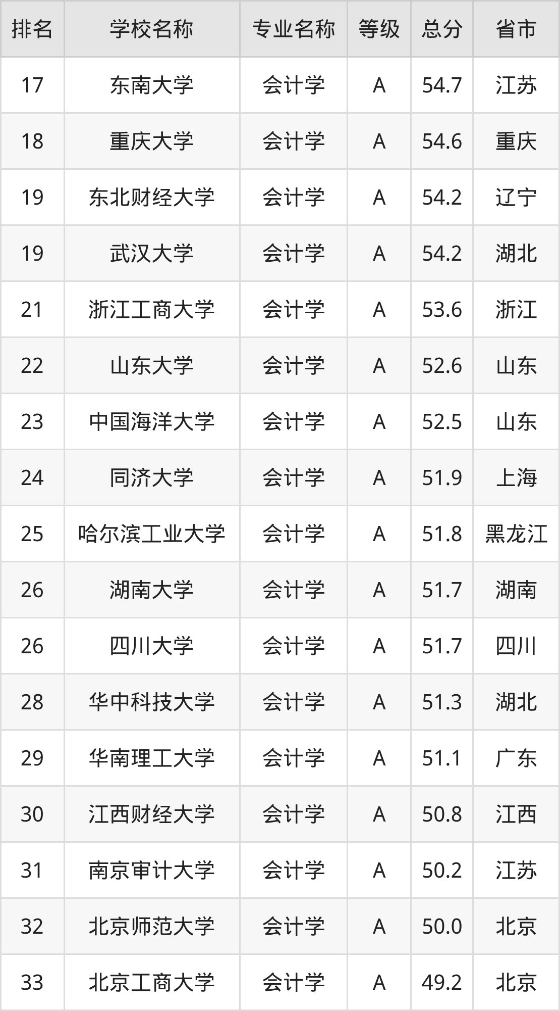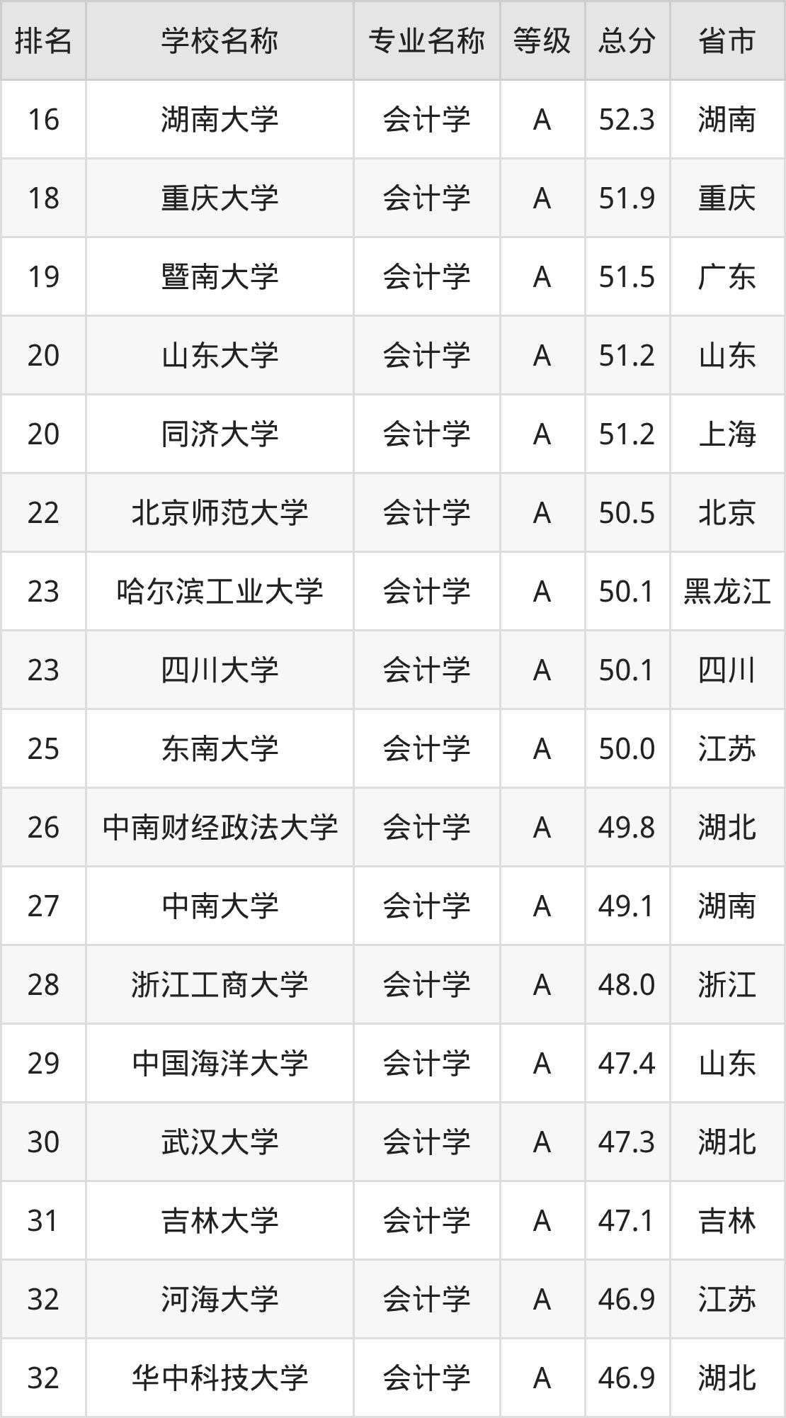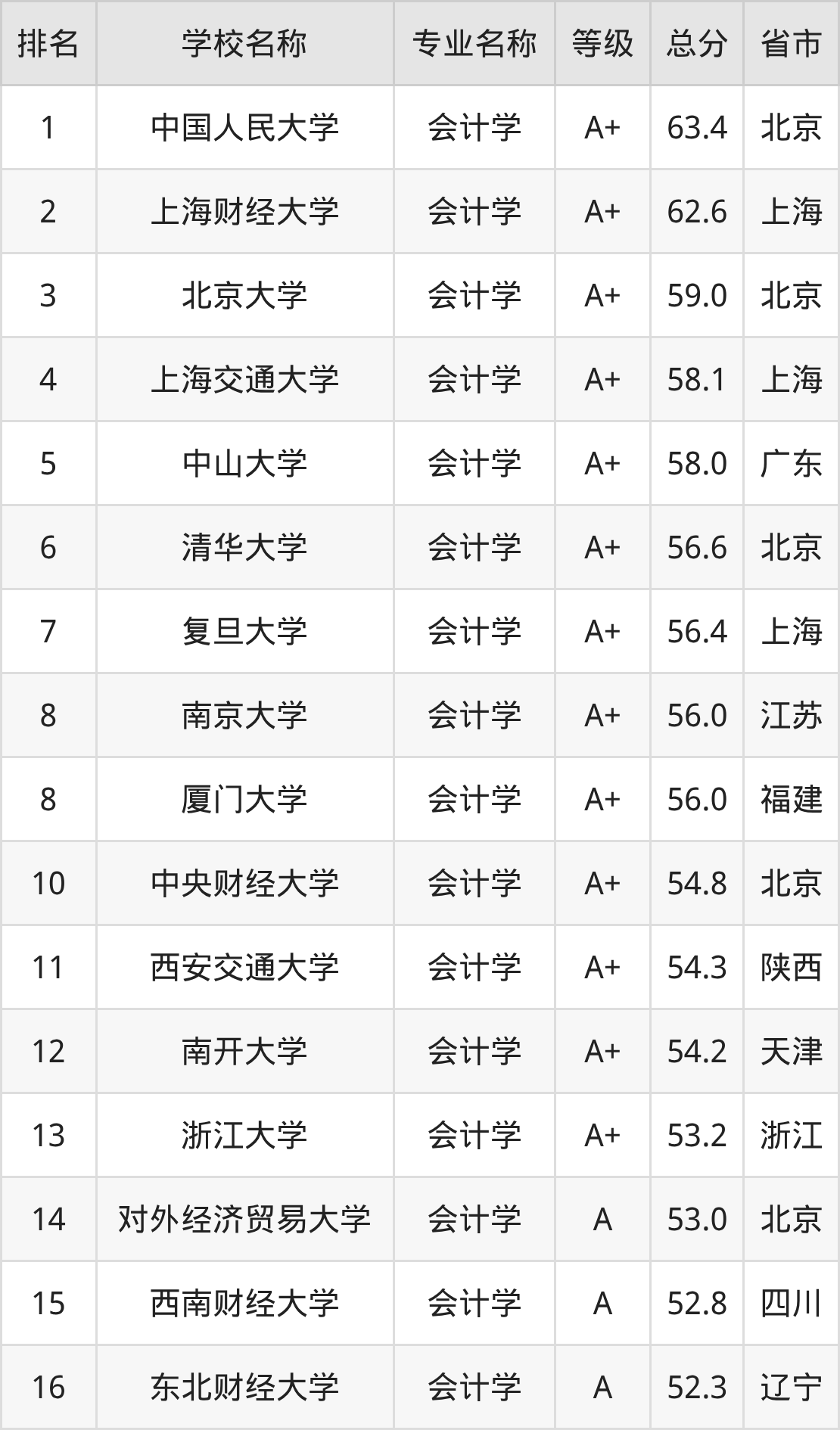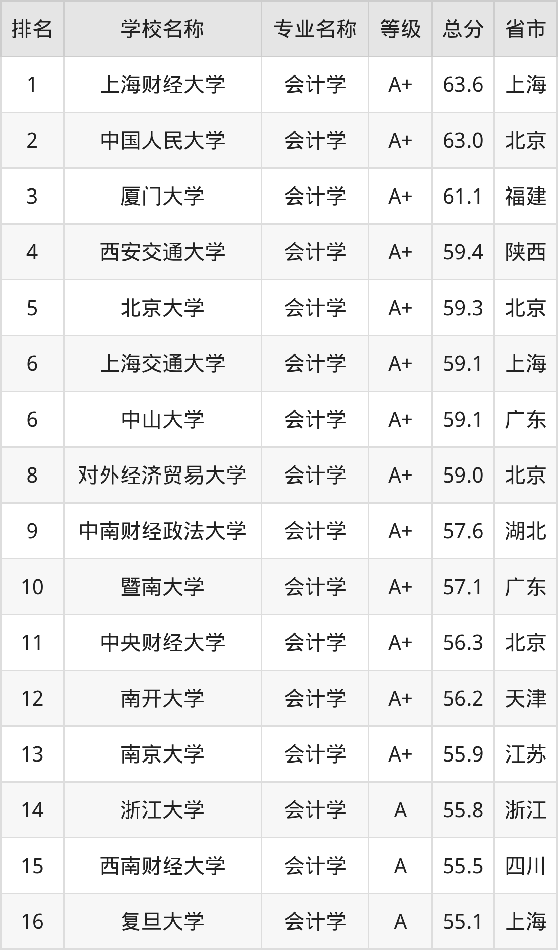 根据软科榜单可知,会计学专业全国排名前十的大学分别是: