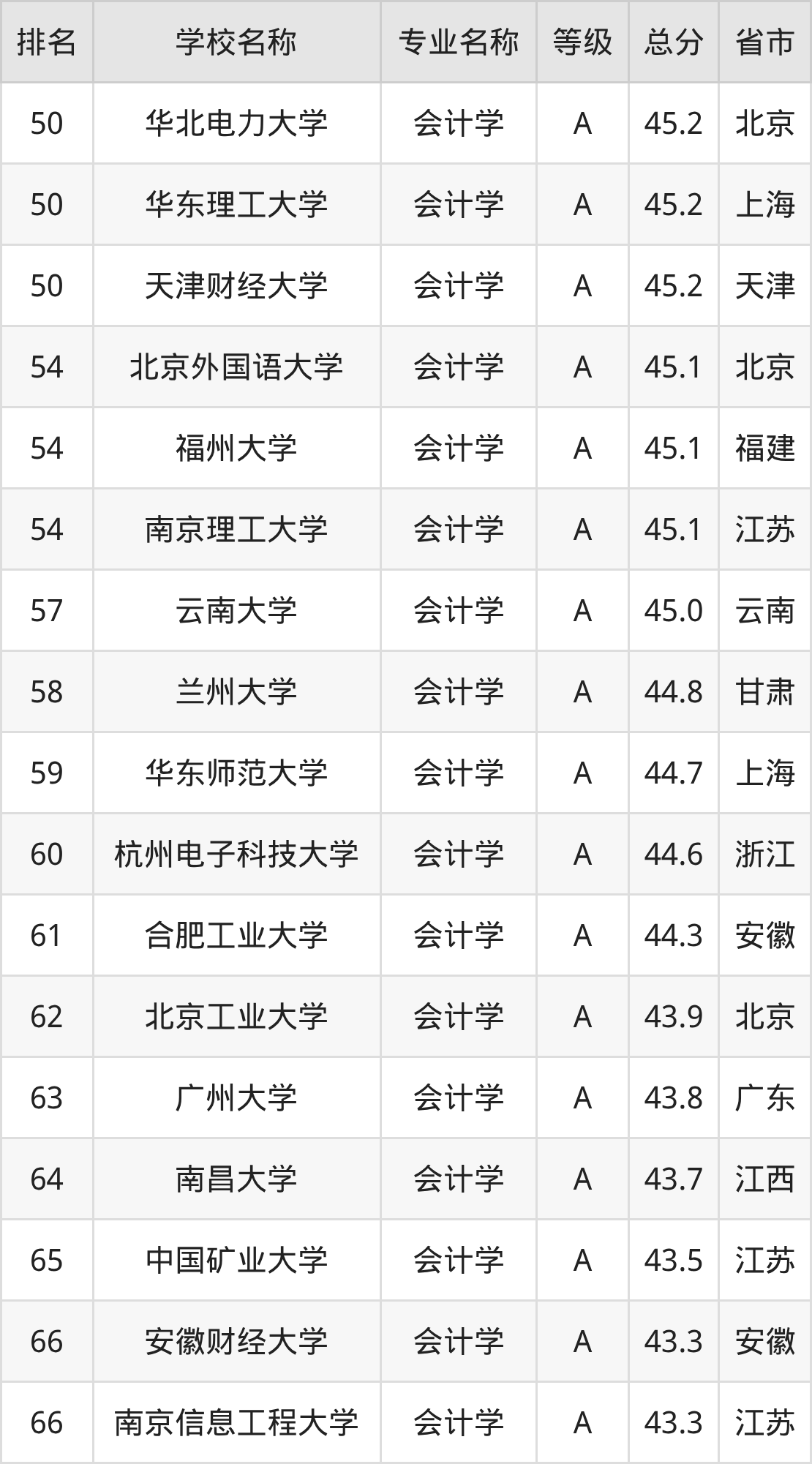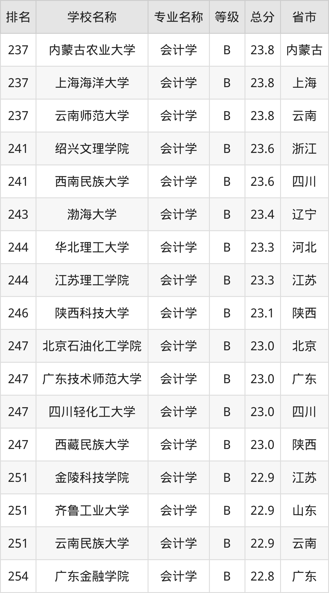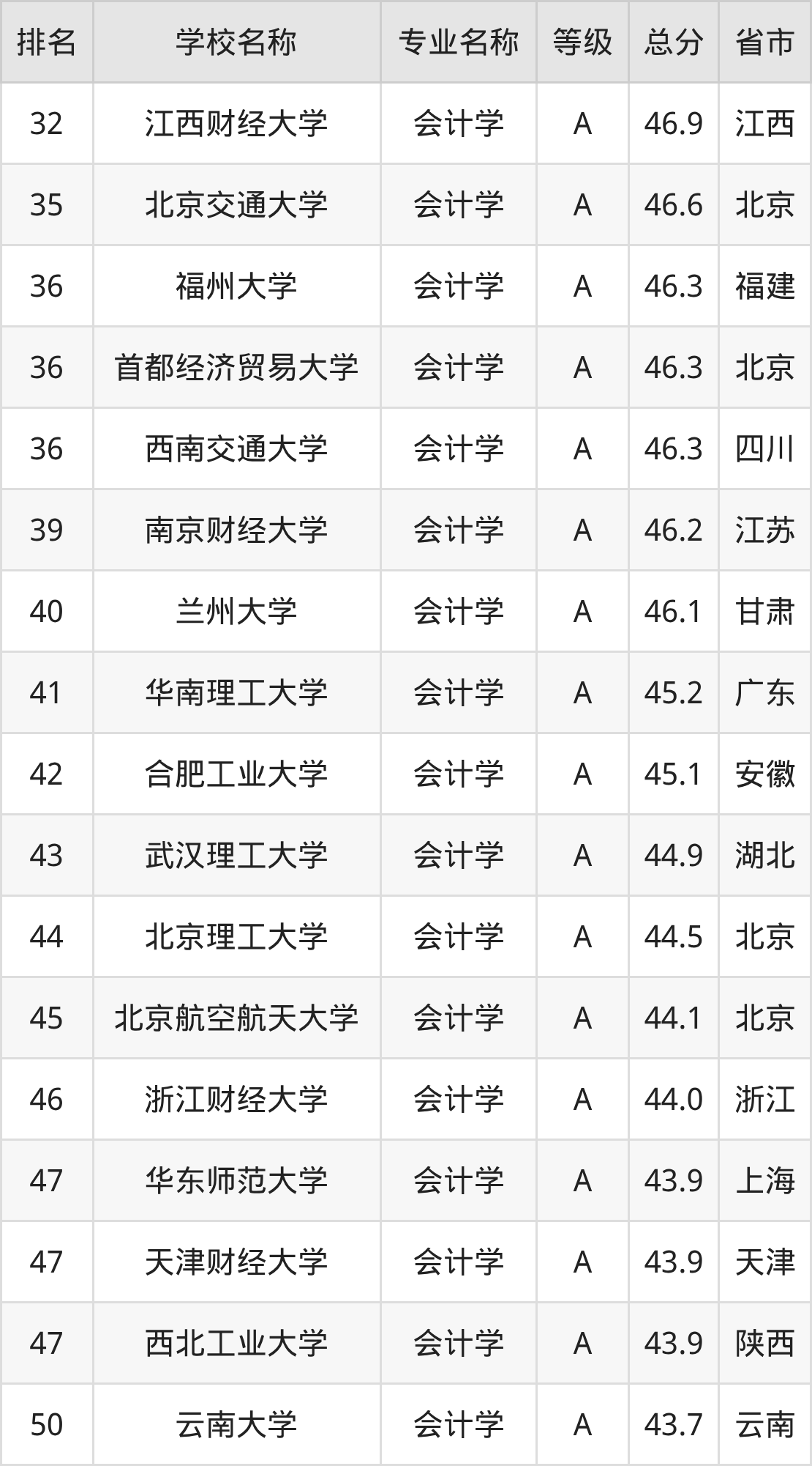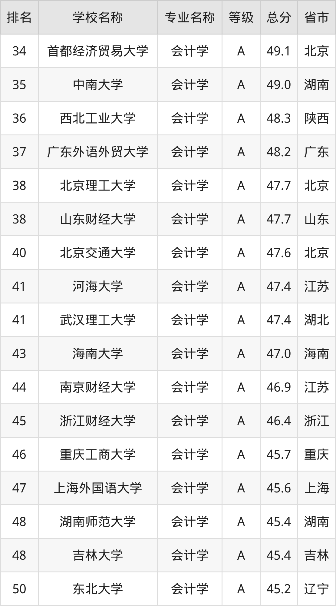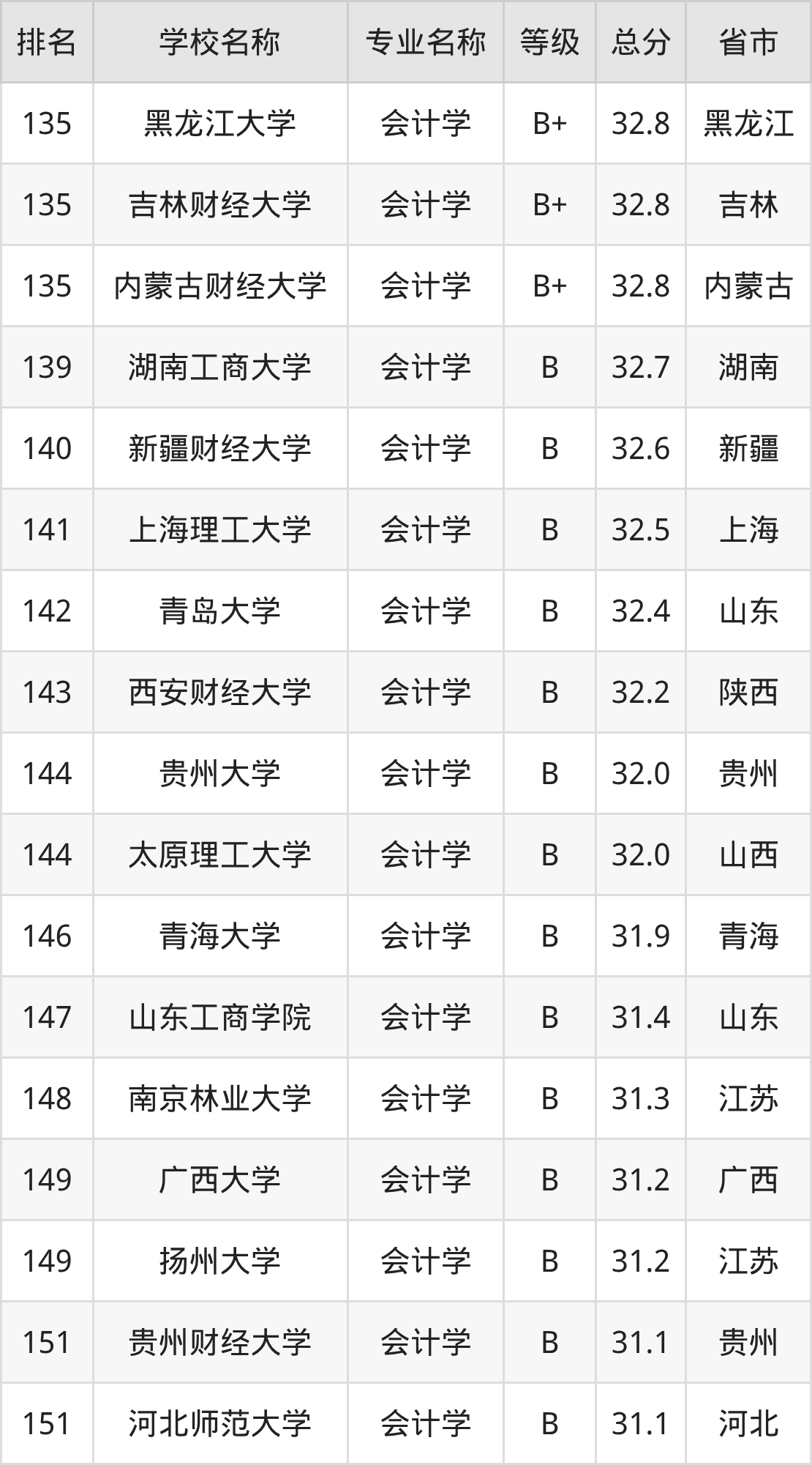 根据软科榜单可知,会计学专业全国排名前十的大学分别是: