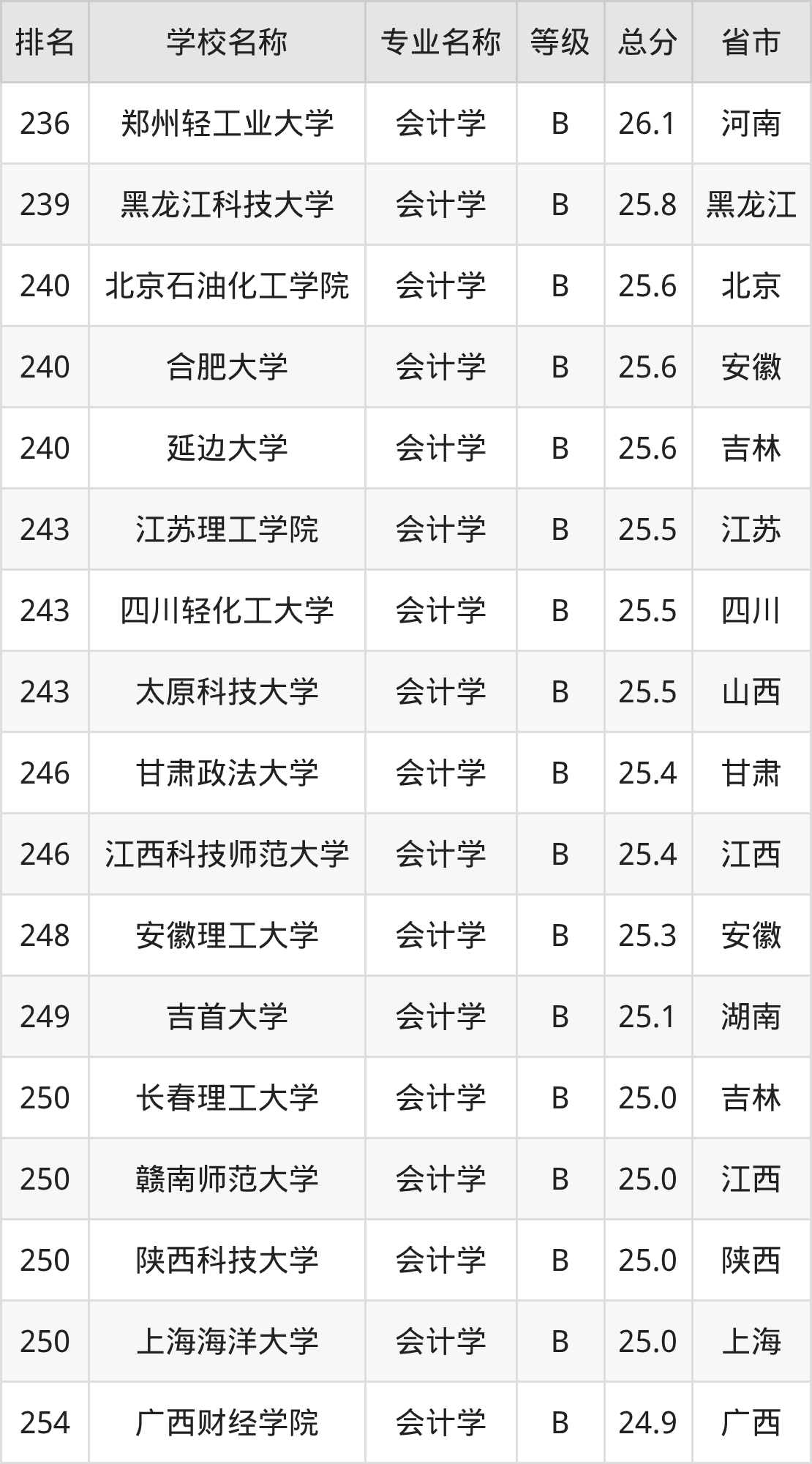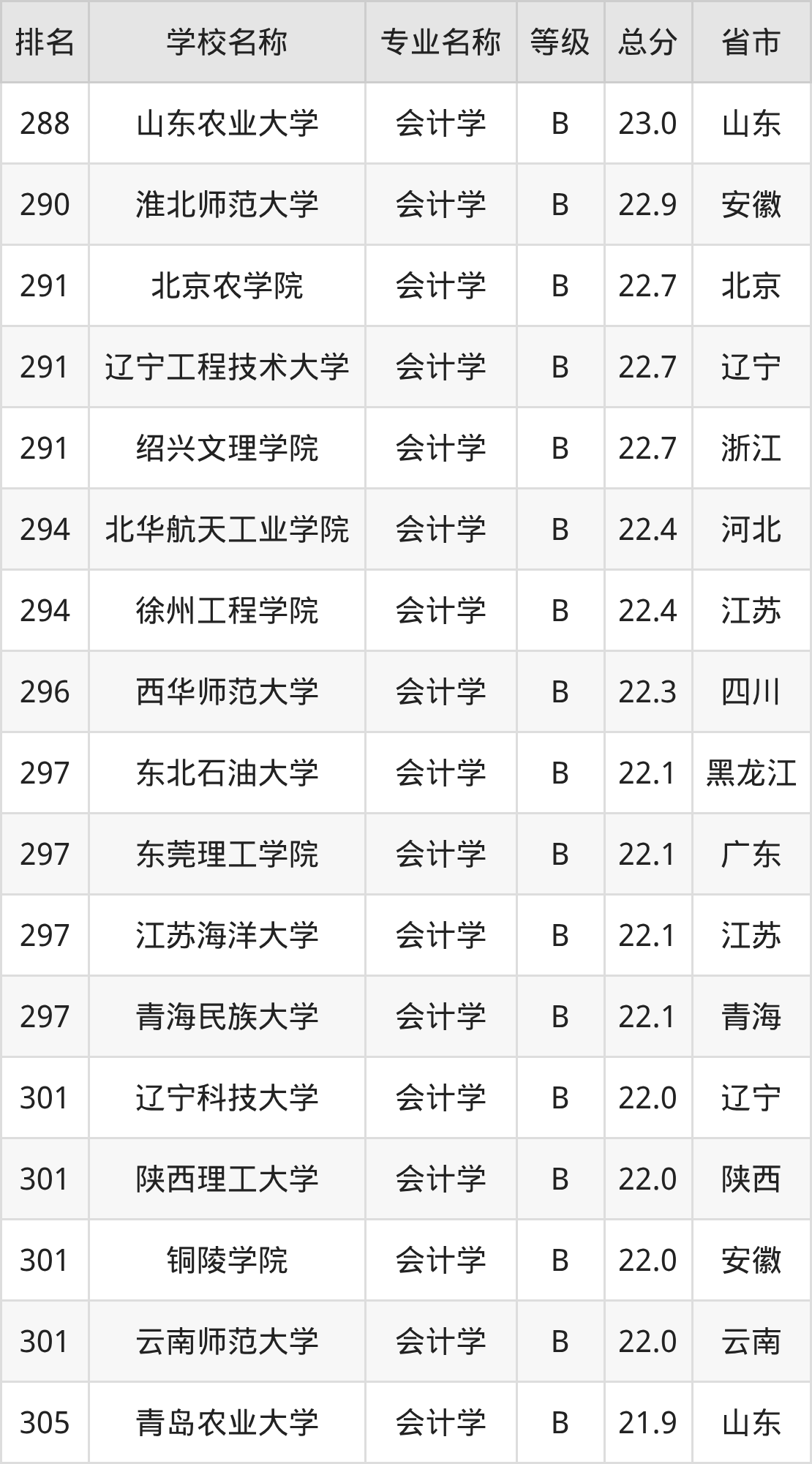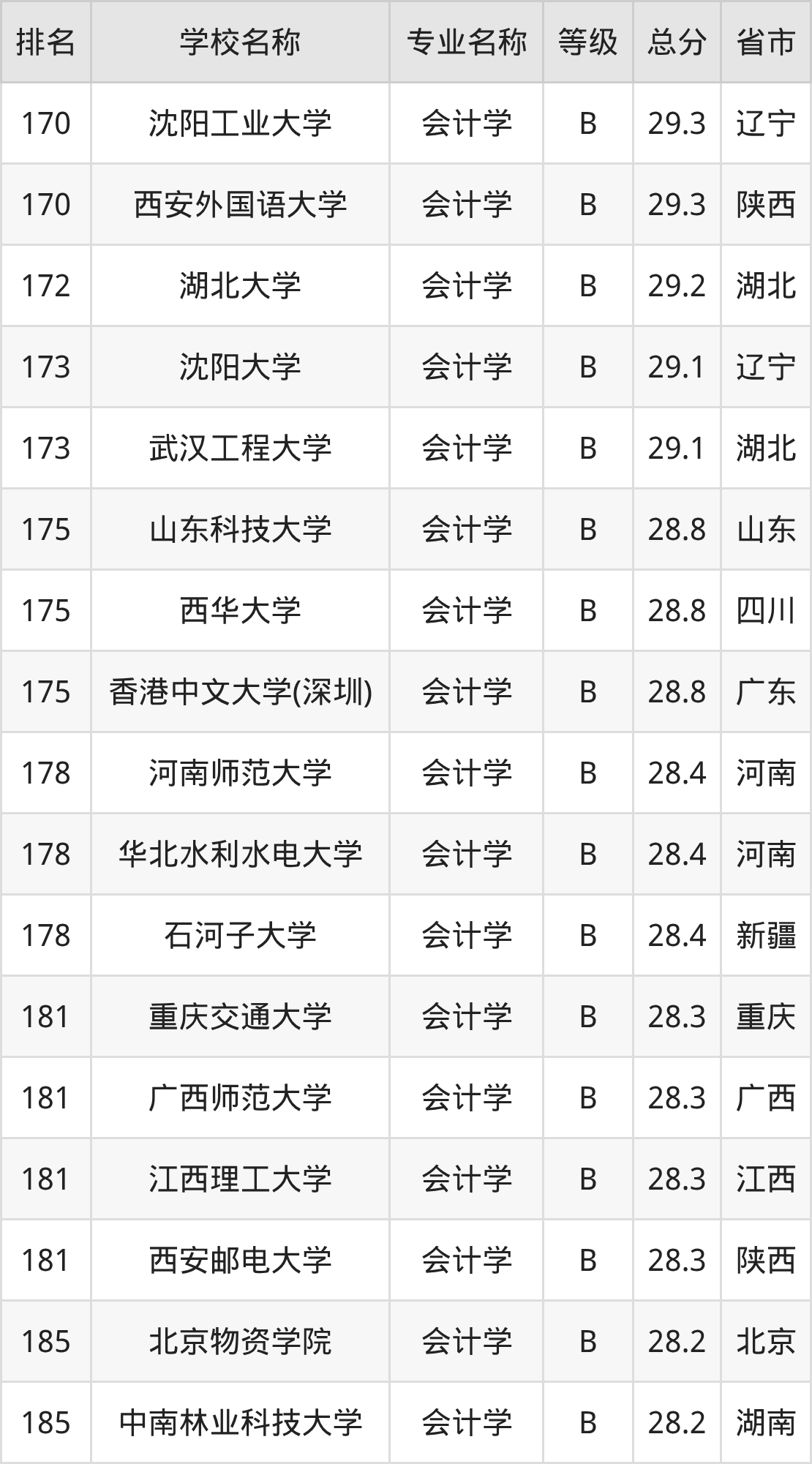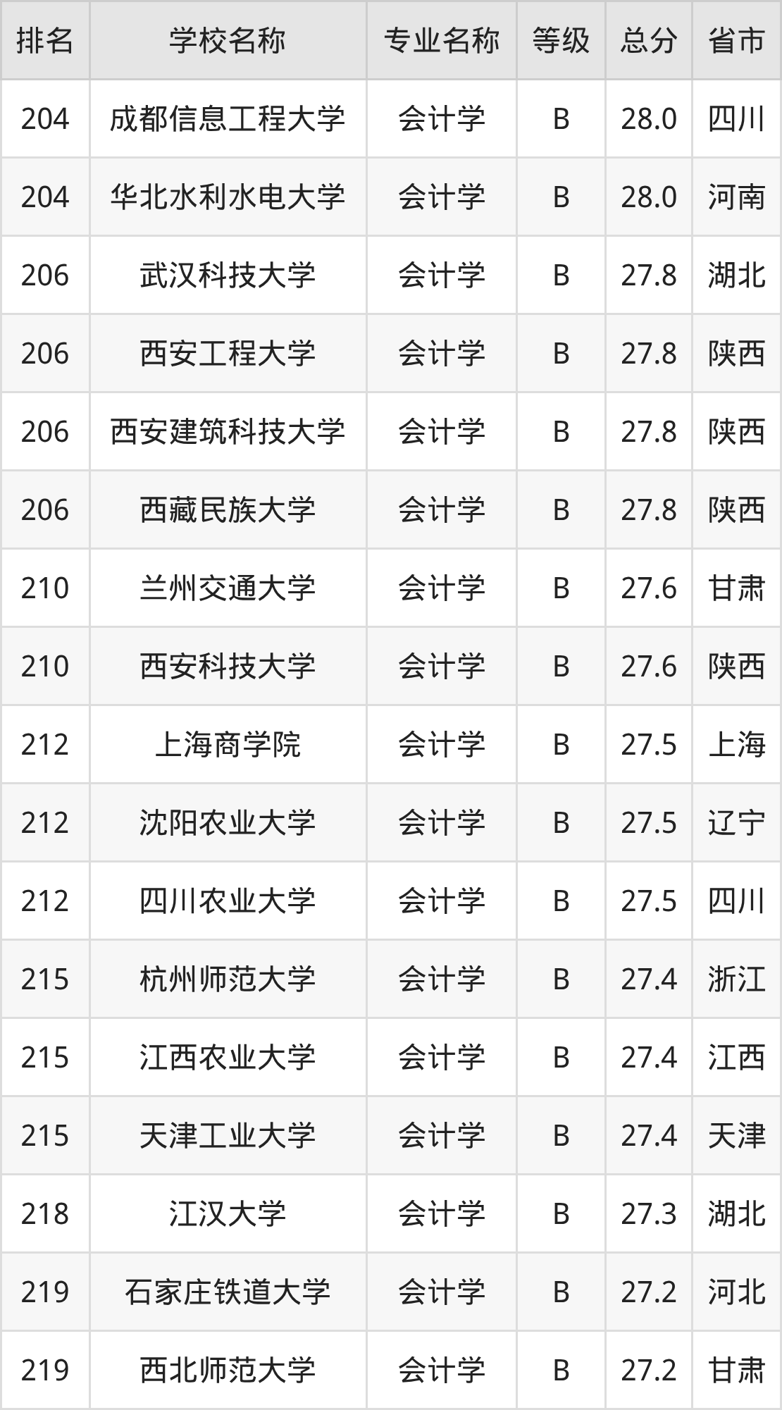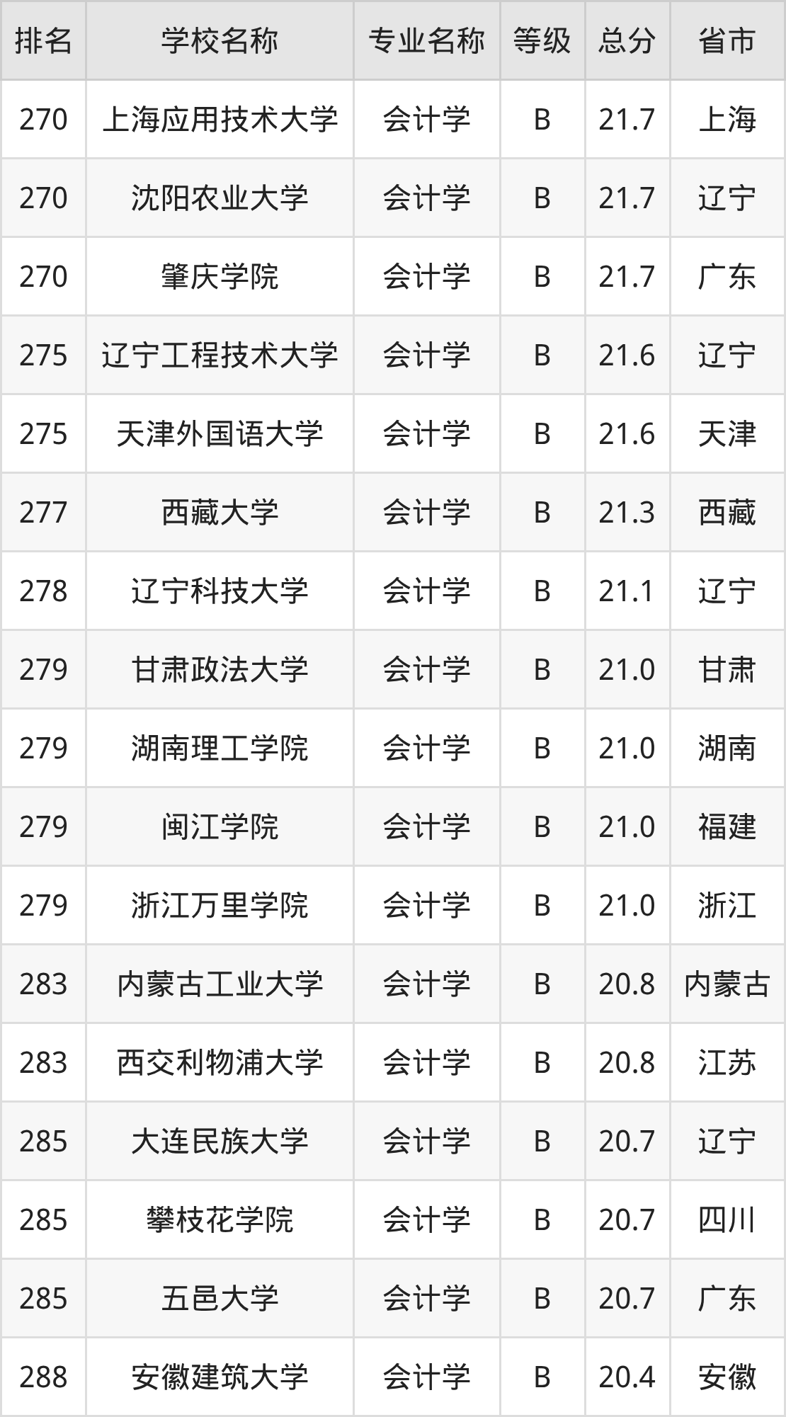 根据软科榜单可知,会计学专业全国排名前十的大学分别是: