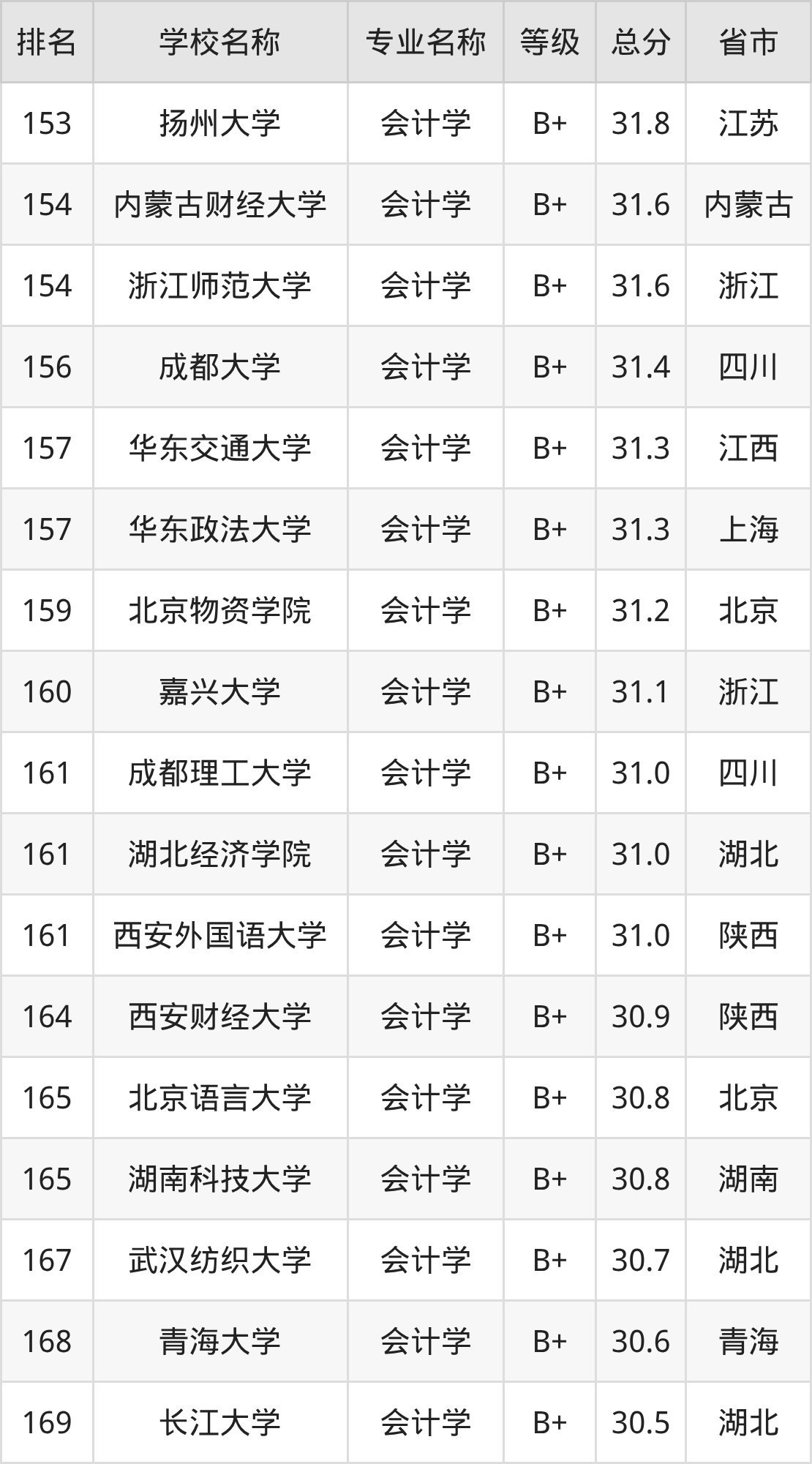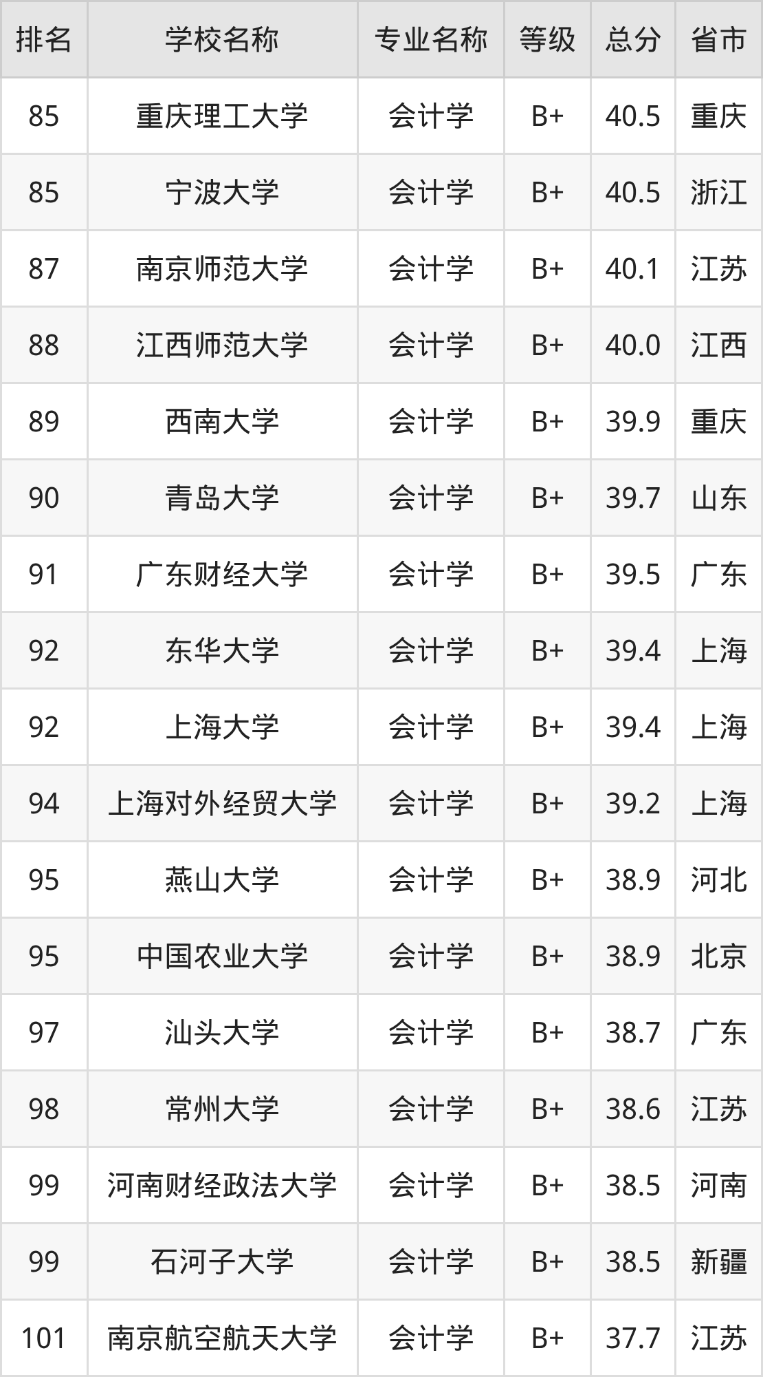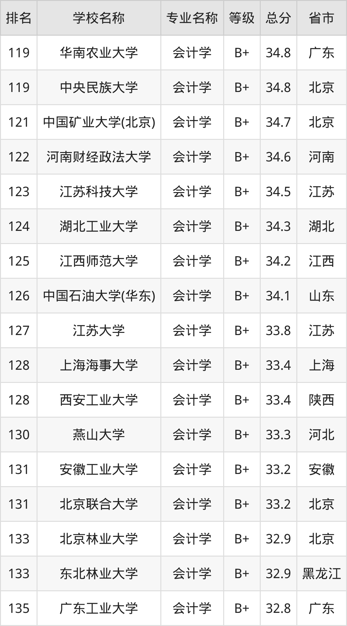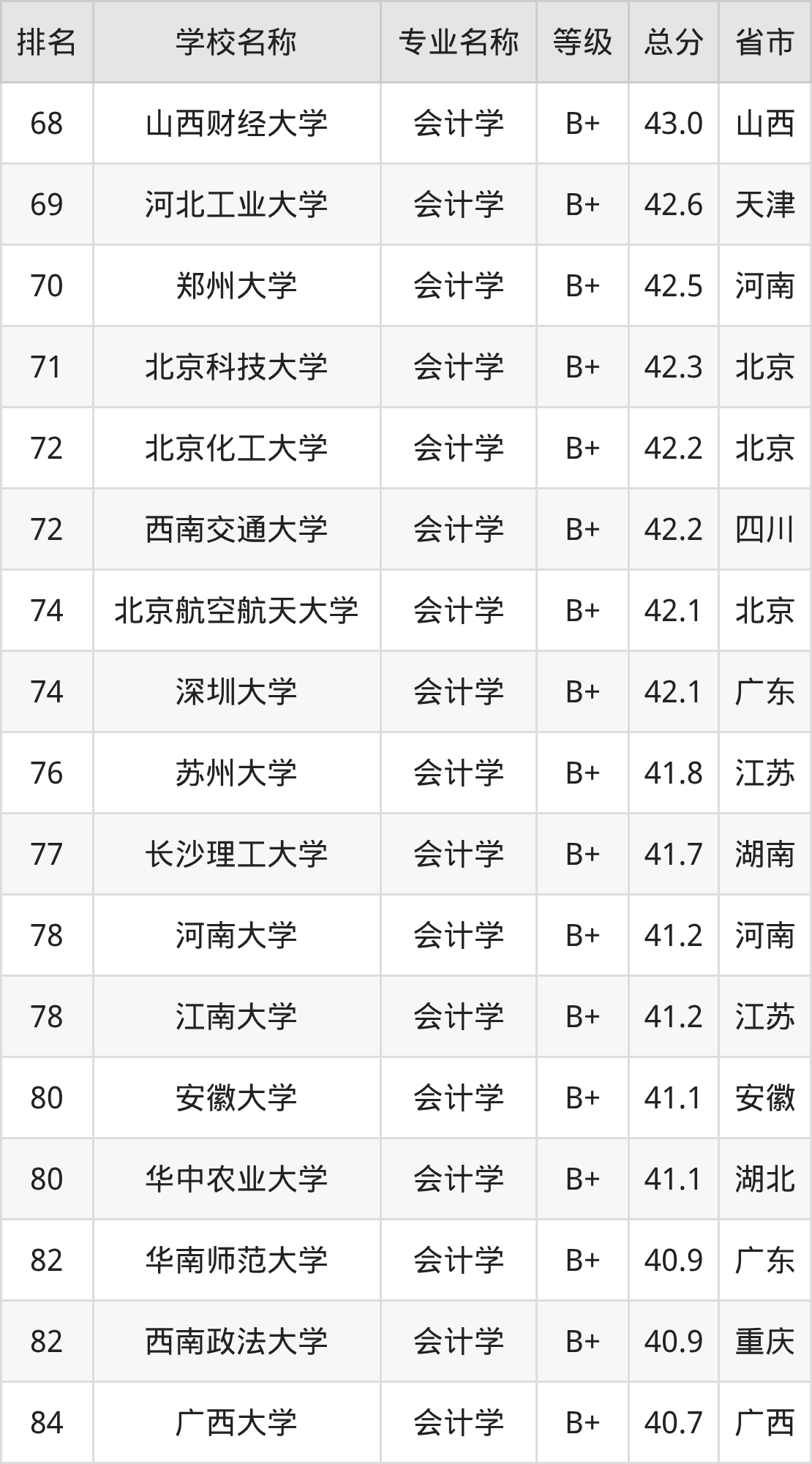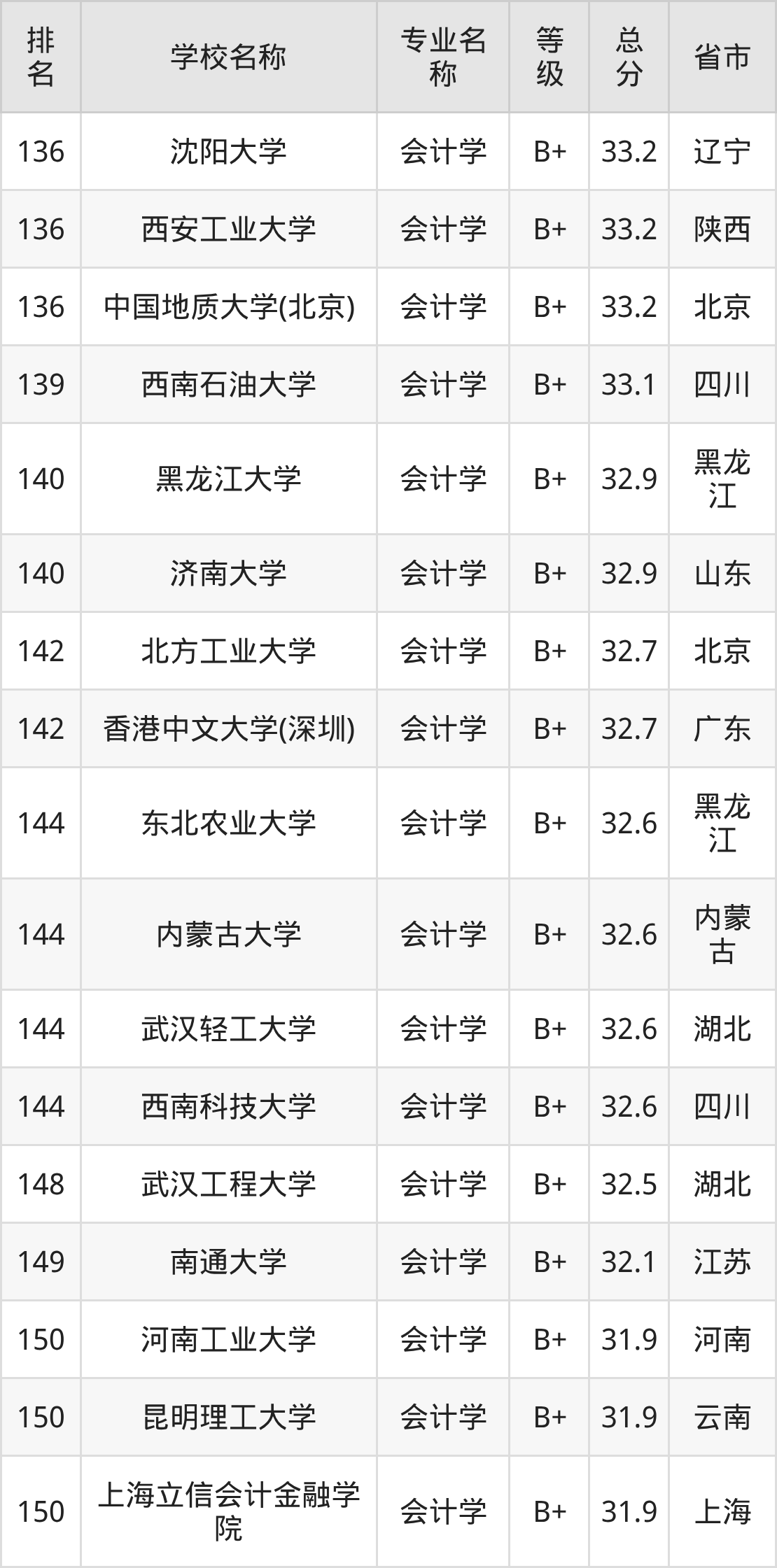 根据软科榜单可知,会计学专业全国排名前十的大学分别是: