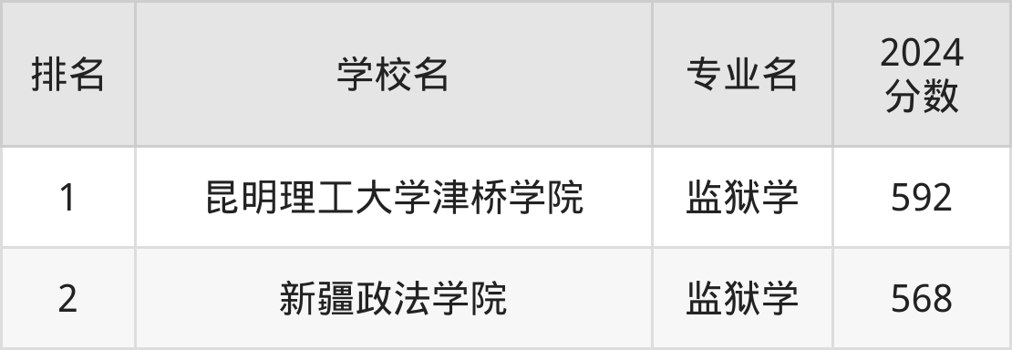 监狱学专业排名前2的大学中,收分较低的有新疆政法学院(568分)、昆明理工大学津桥学院(592分)。