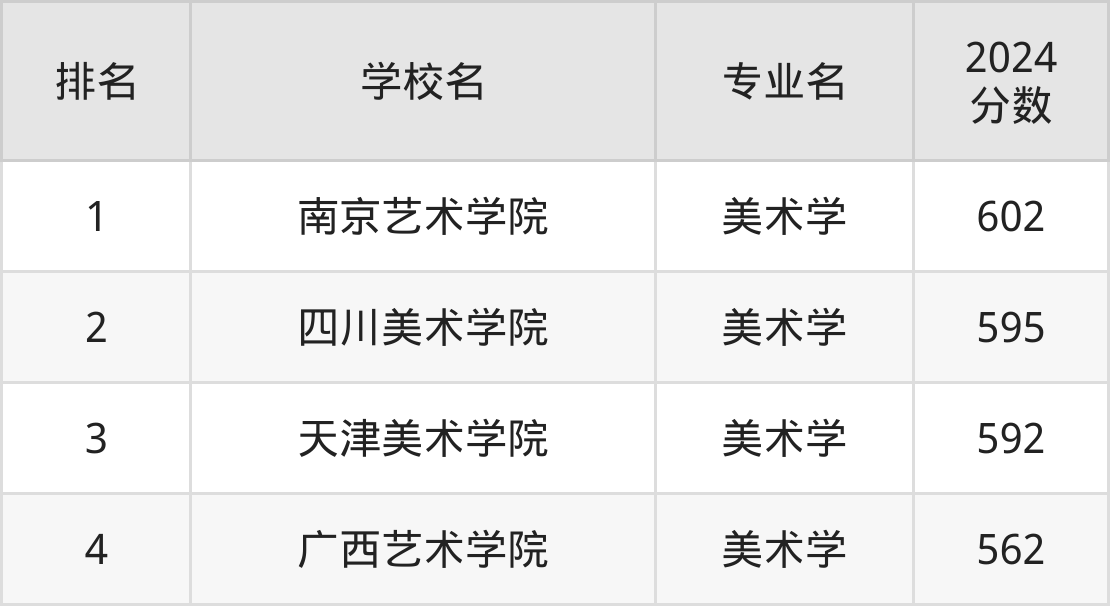 美术学专业排名前4的大学中,收分较低的有广西艺术学院(562分)、天津美术学院(592分)、四川美术学院(595分)、南京艺术学院(602分)。