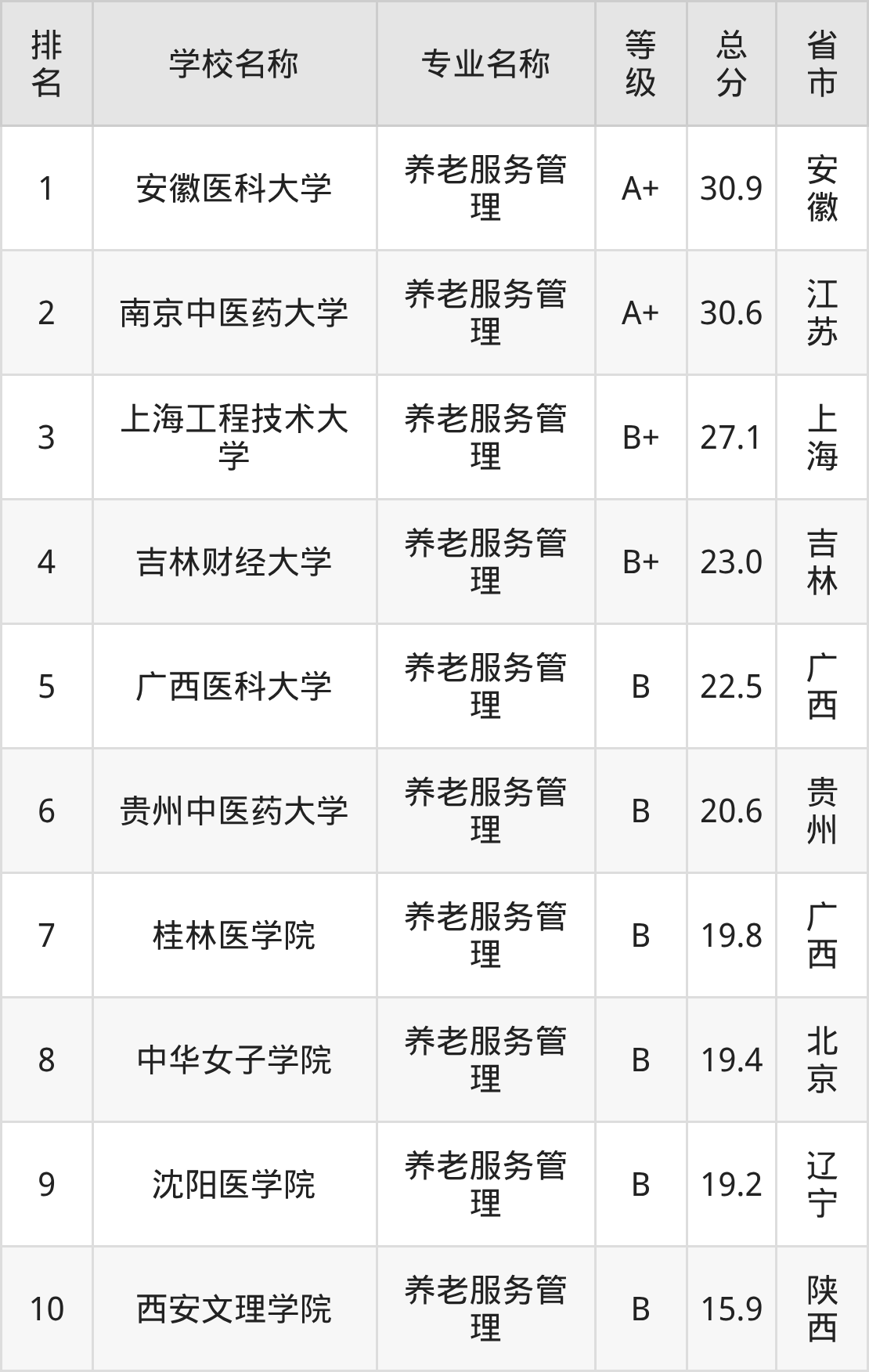 根据软科榜单可知,养老服务管理专业全国排名前十的大学分别是: