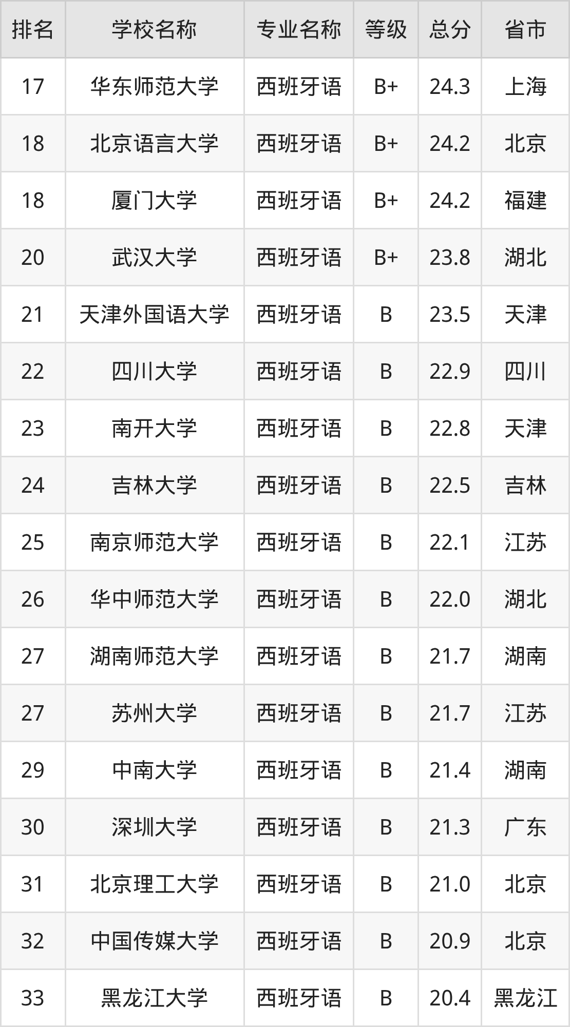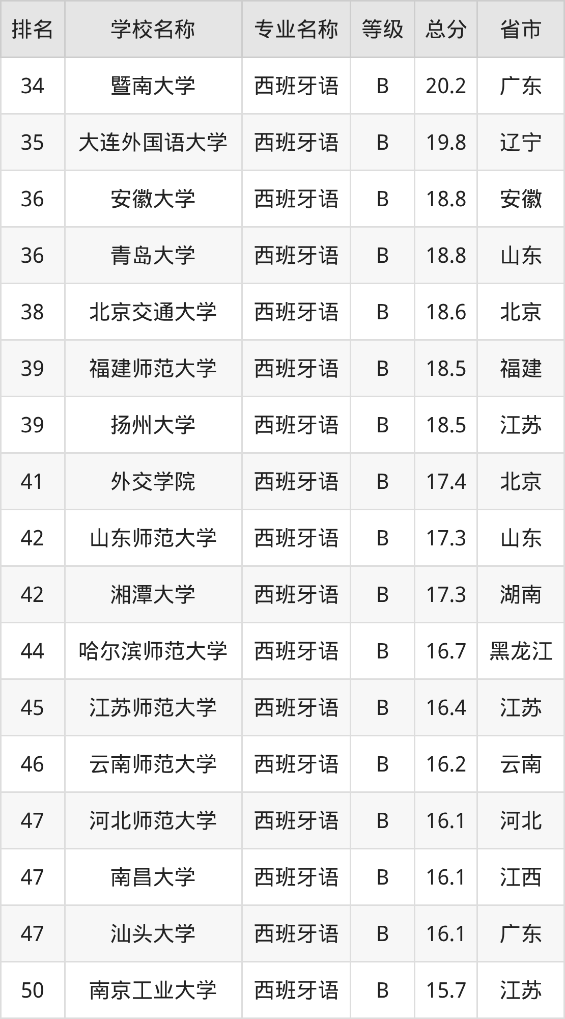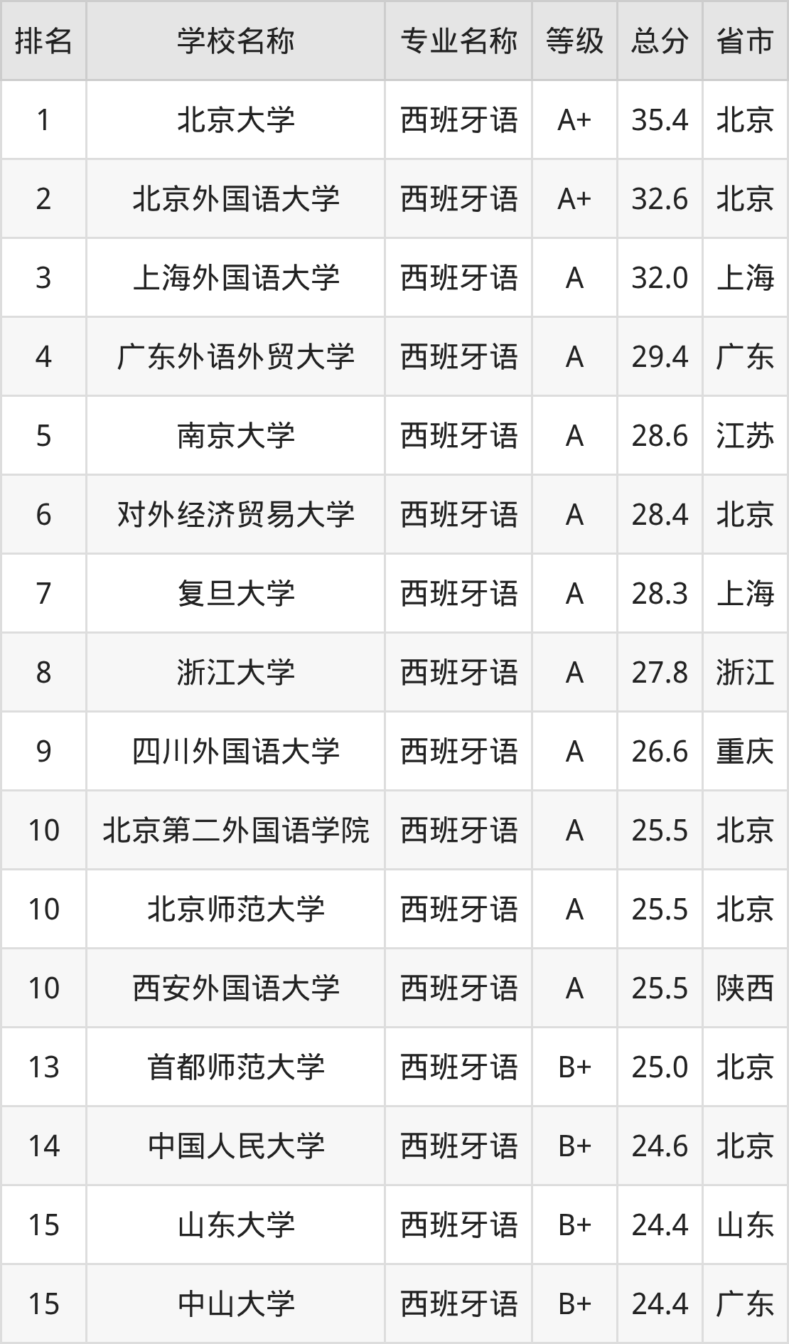 根据软科榜单可知,西班牙语专业全国排名前十的大学分别是:
