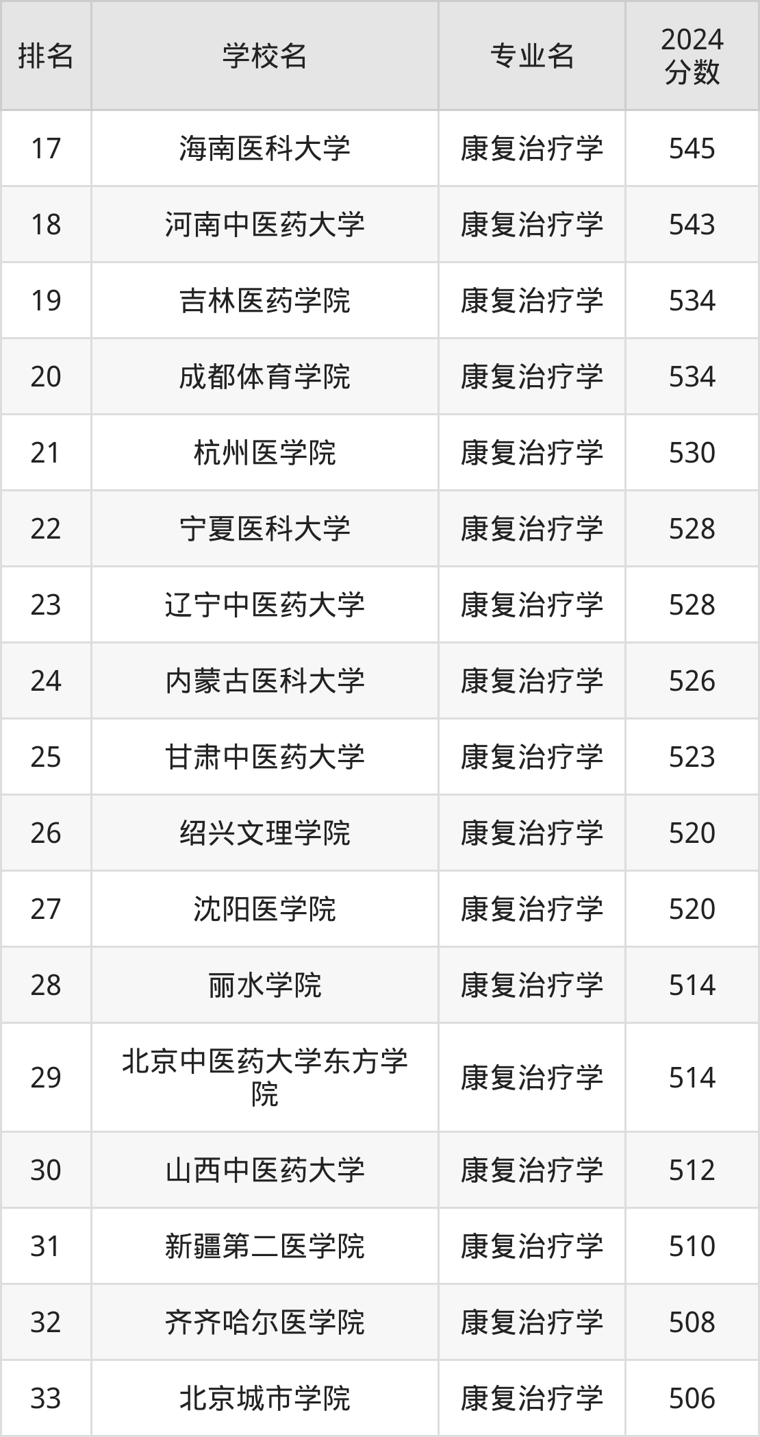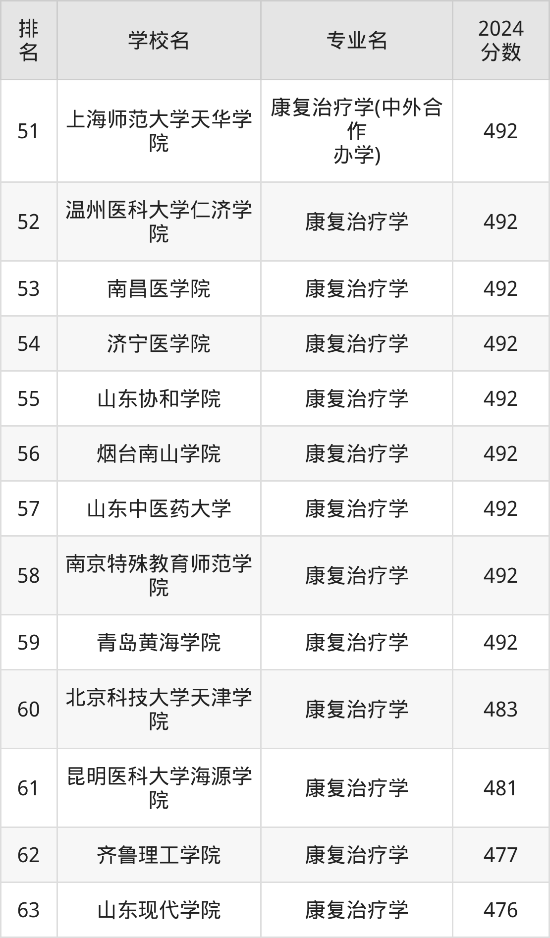 (注:不包含把康复治疗学专业列在大类专业中招生的名校)