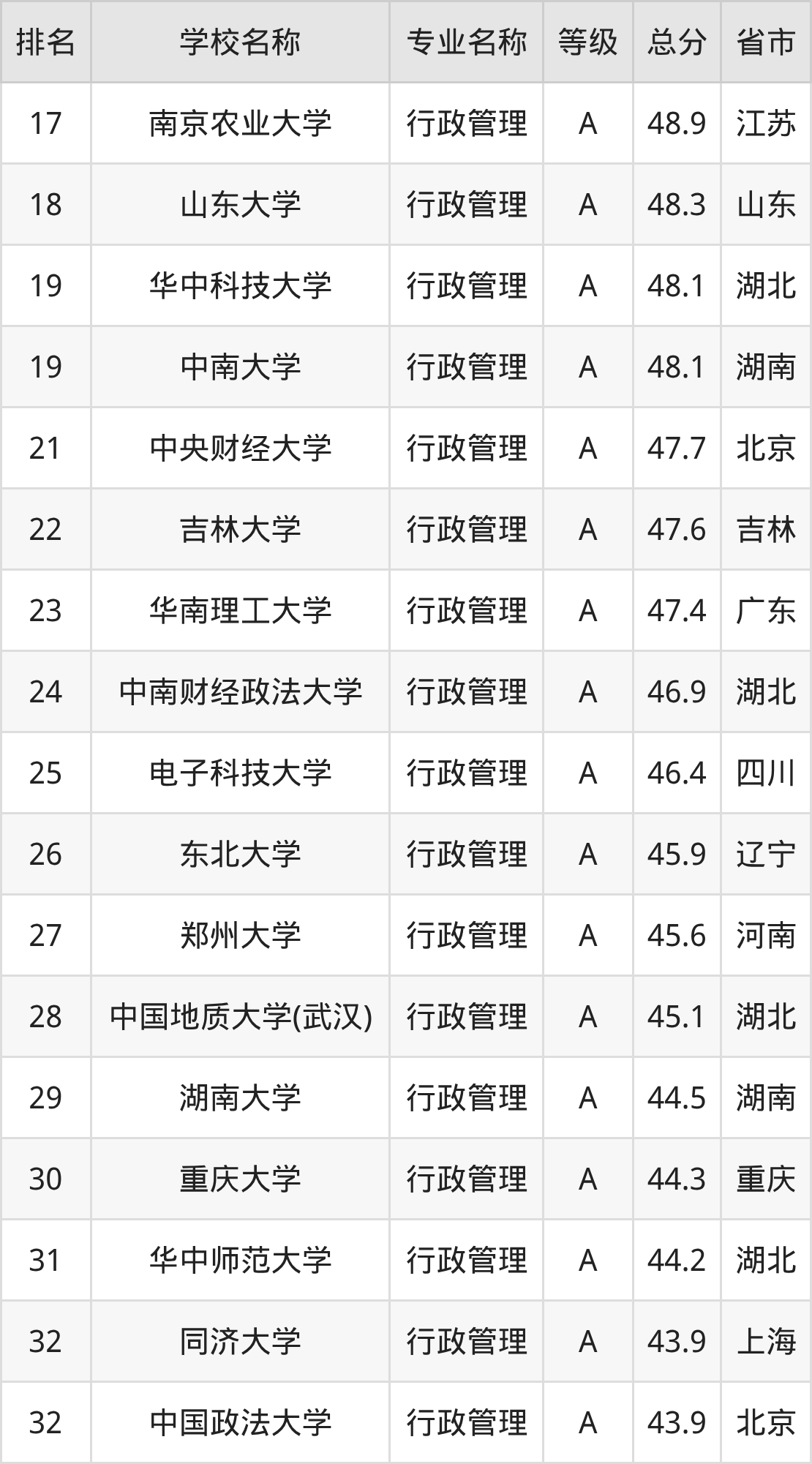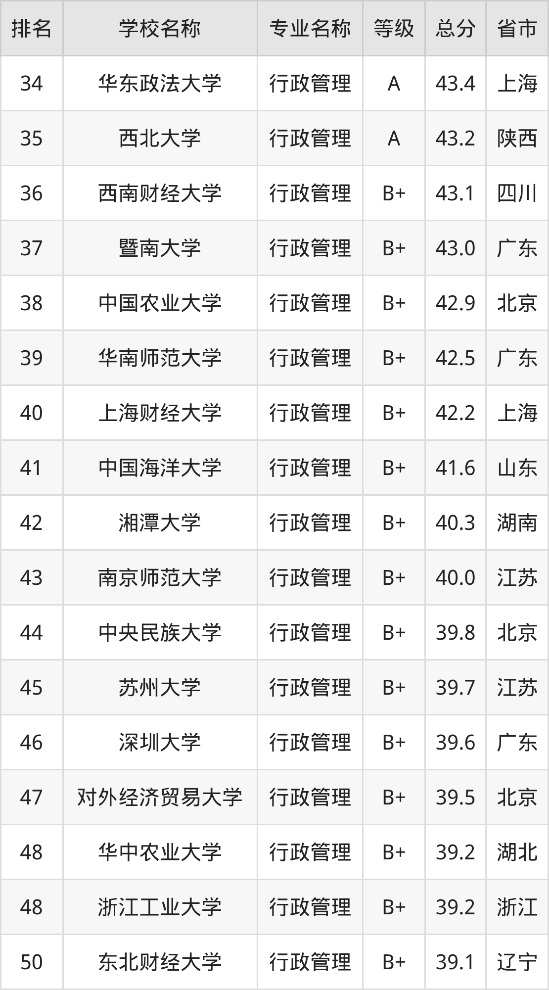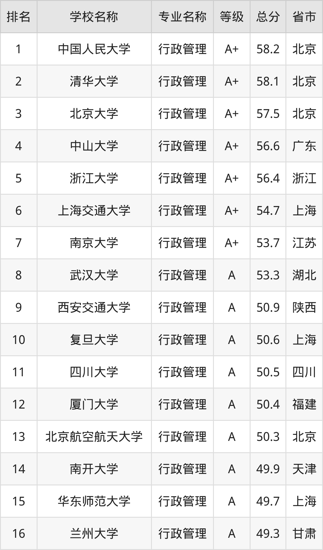 一、2025年行政管理专业全国大学排名