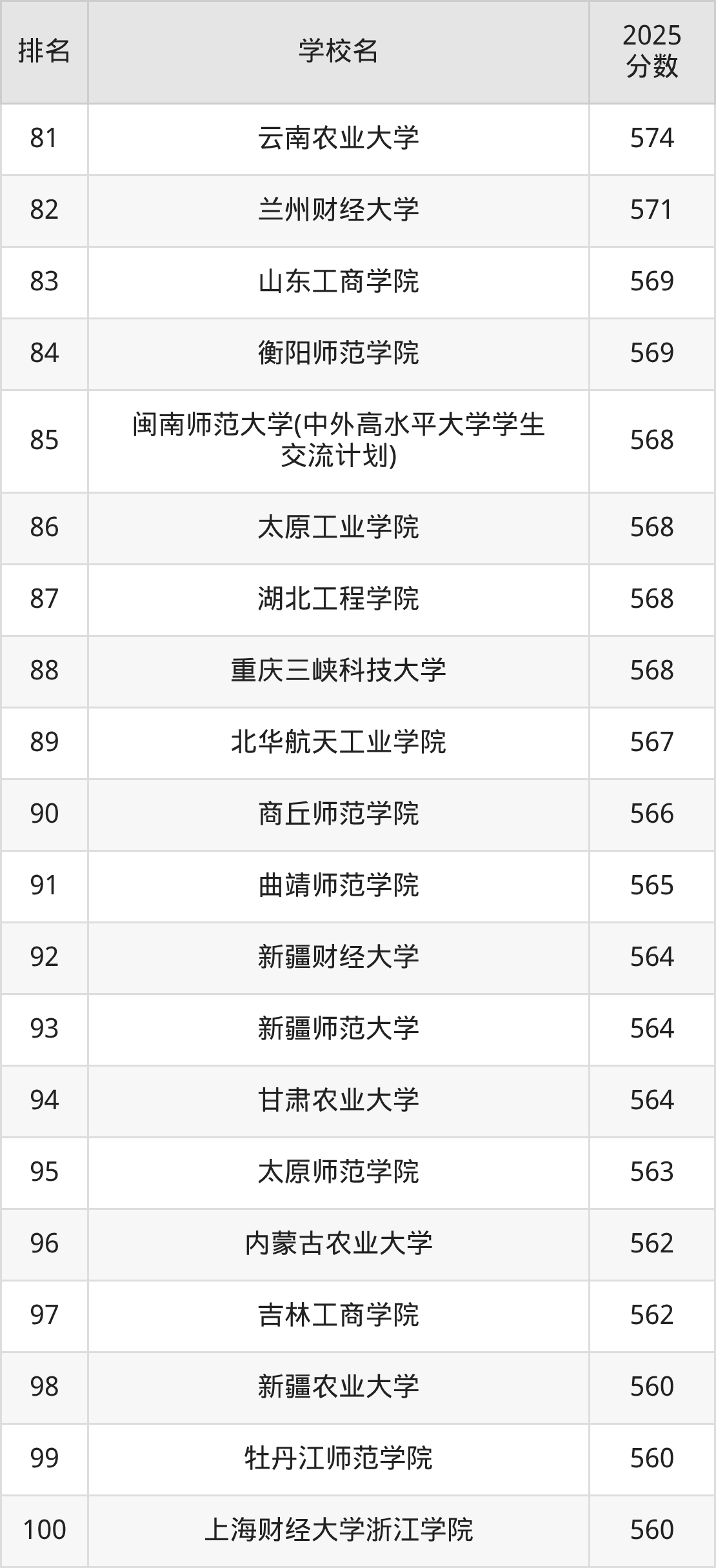 经济学专业排名前100的大学中,收分较低的有上海财经大学浙江学院(560分)、牡丹江师范学院(560分)、新疆农业大学(560分)、吉林工商学院(562分)、内蒙古农业大学(562分)。