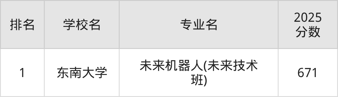 未来机器人专业排名前1的大学中,收分较低的有东南大学(671分)。