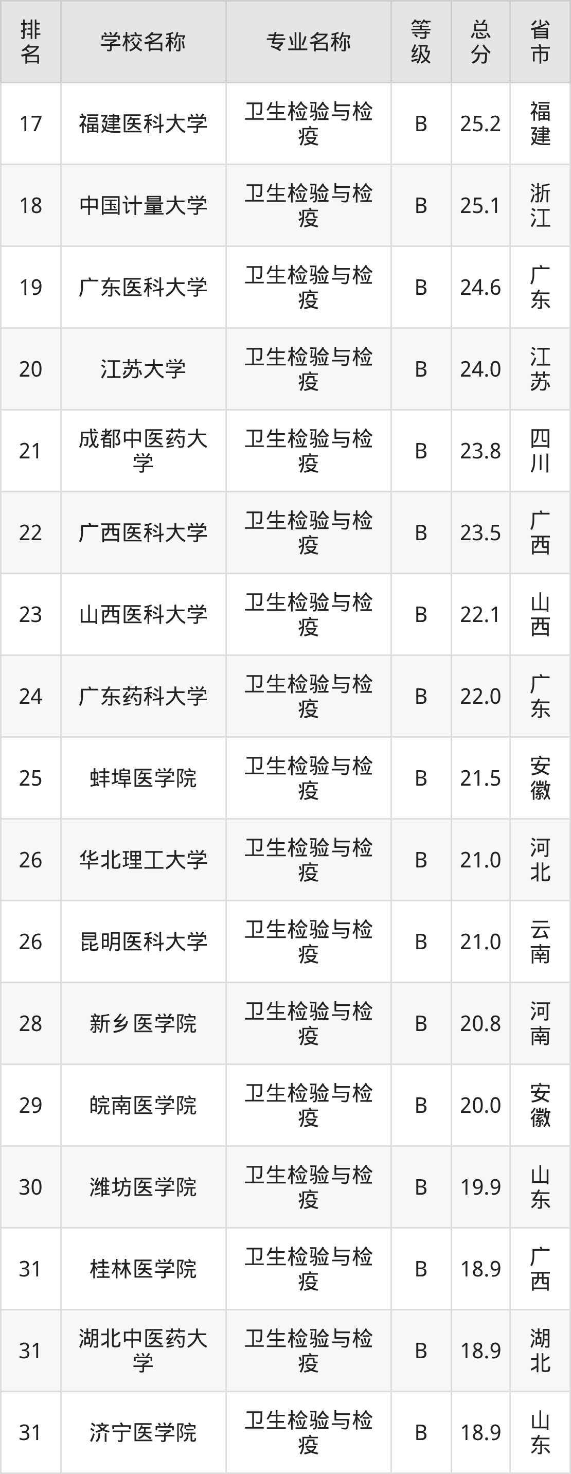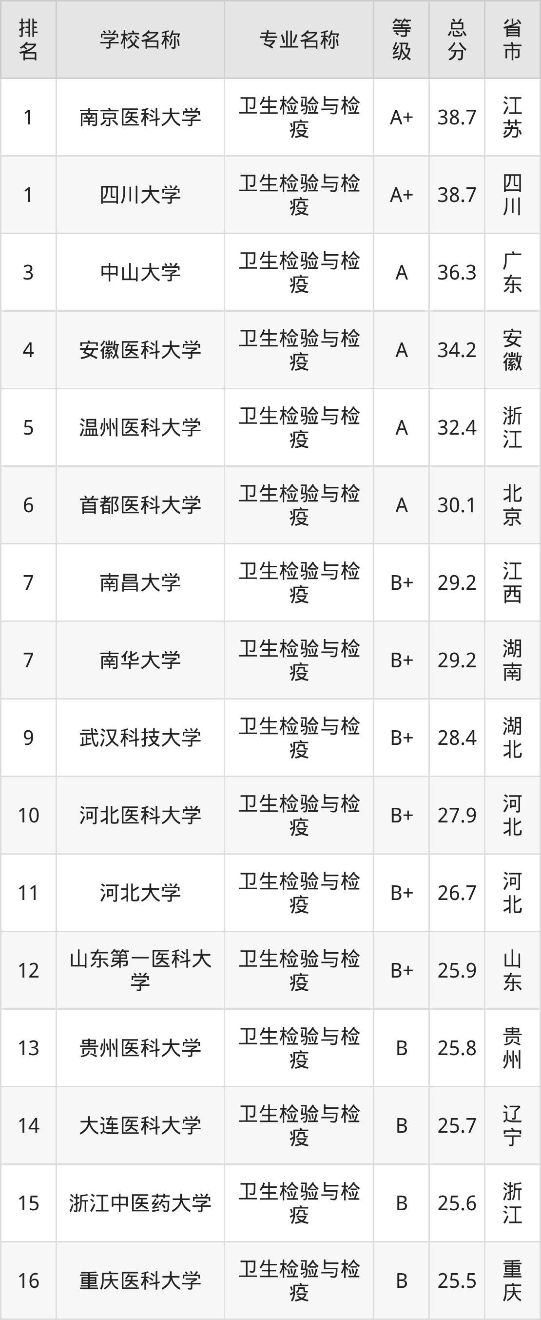 附卫生检验与检疫专业全国33所院校排名榜单一览表!