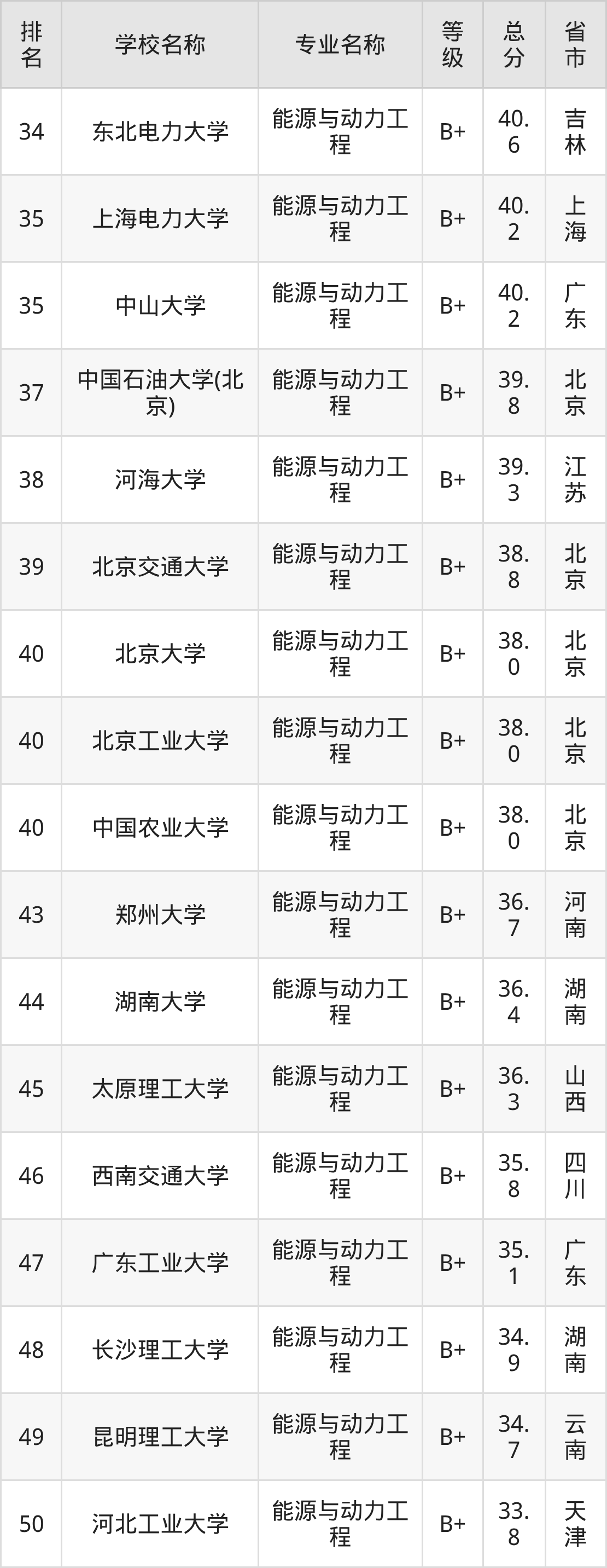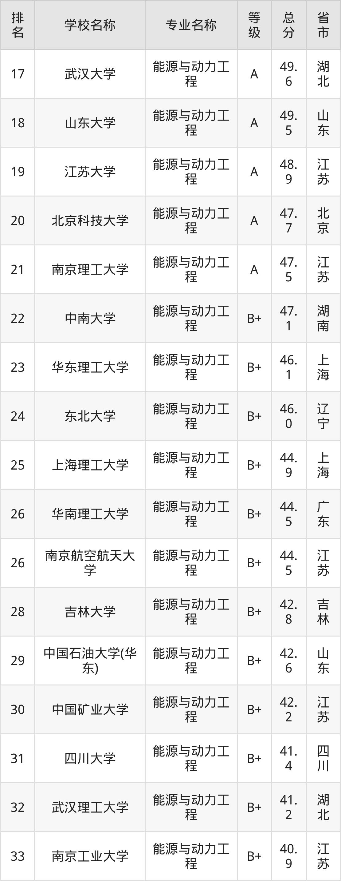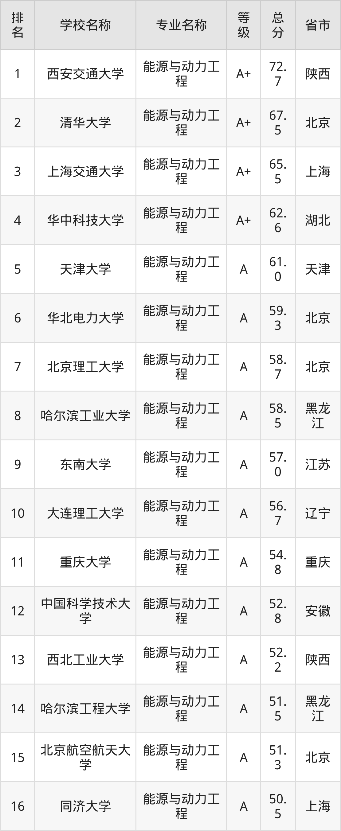 根据软科榜单可知,能源与动力工程专业全国排名前十的大学分别是: