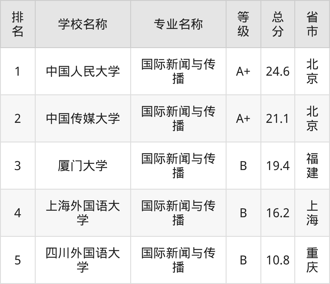 根据软科榜单可知,国际新闻与传播专业全国排名前五的大学分别是: