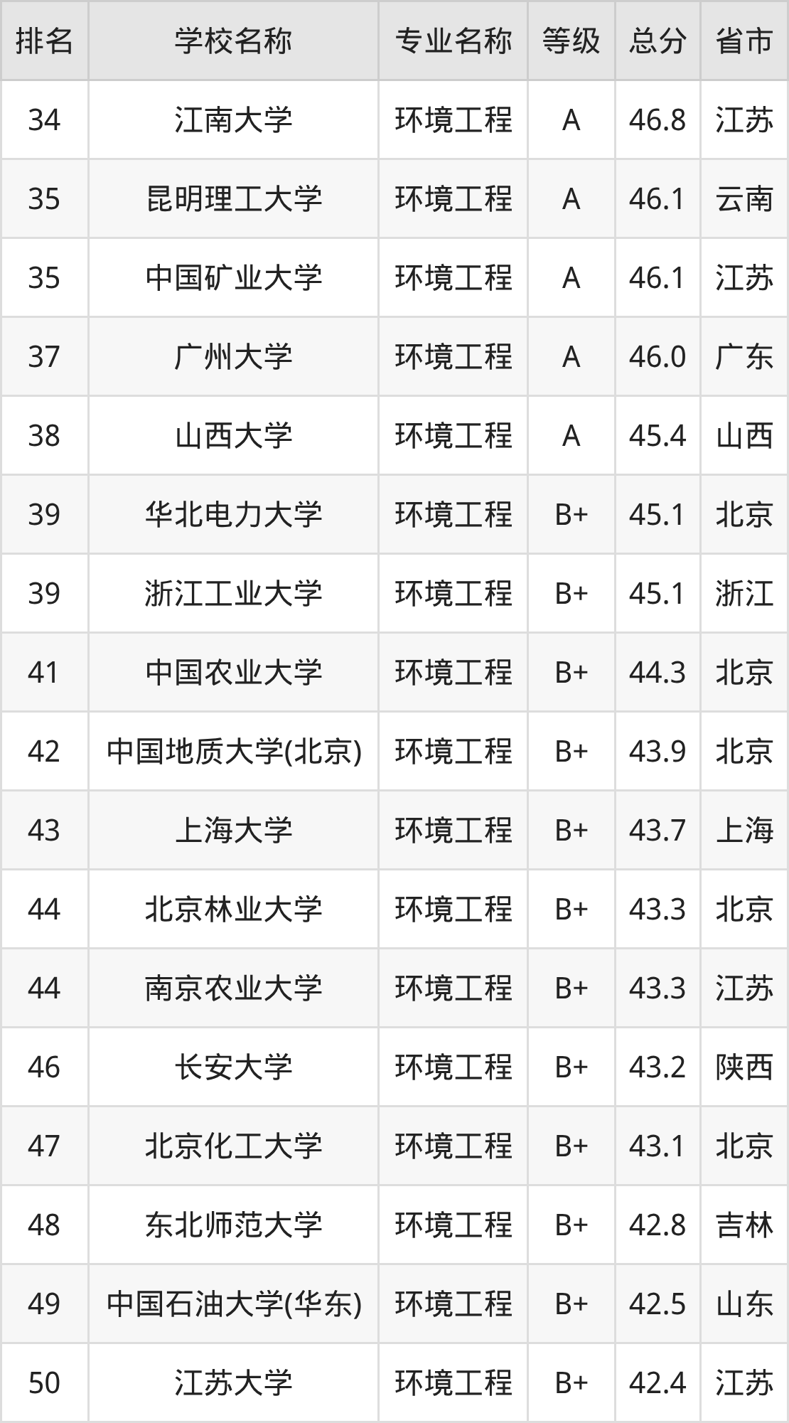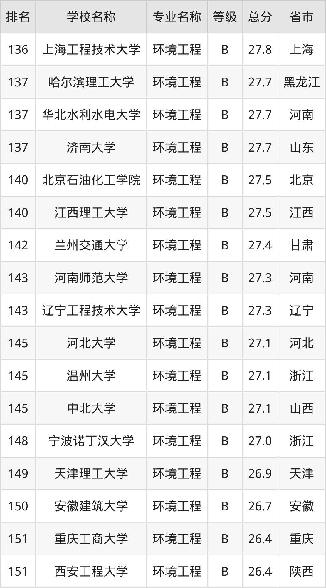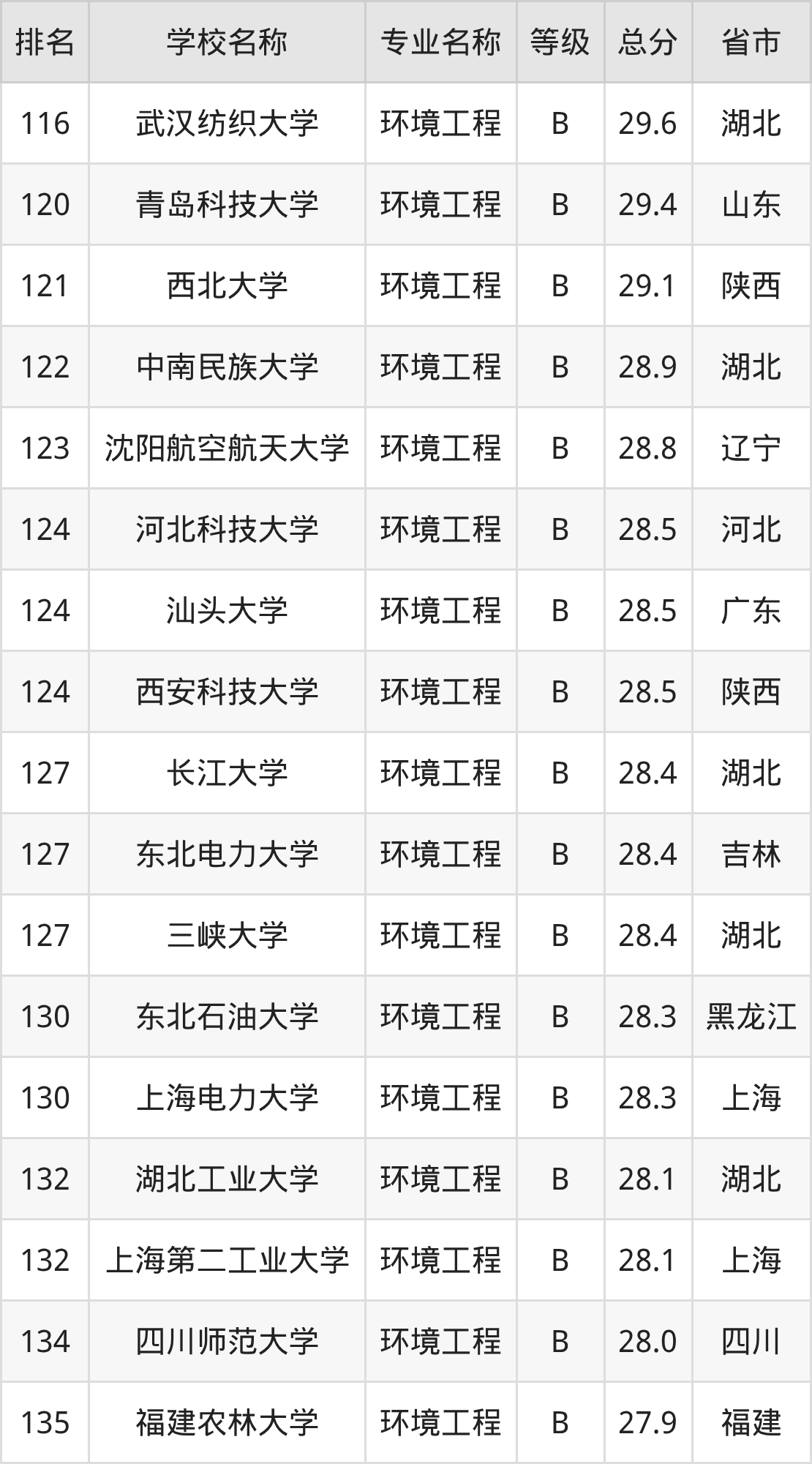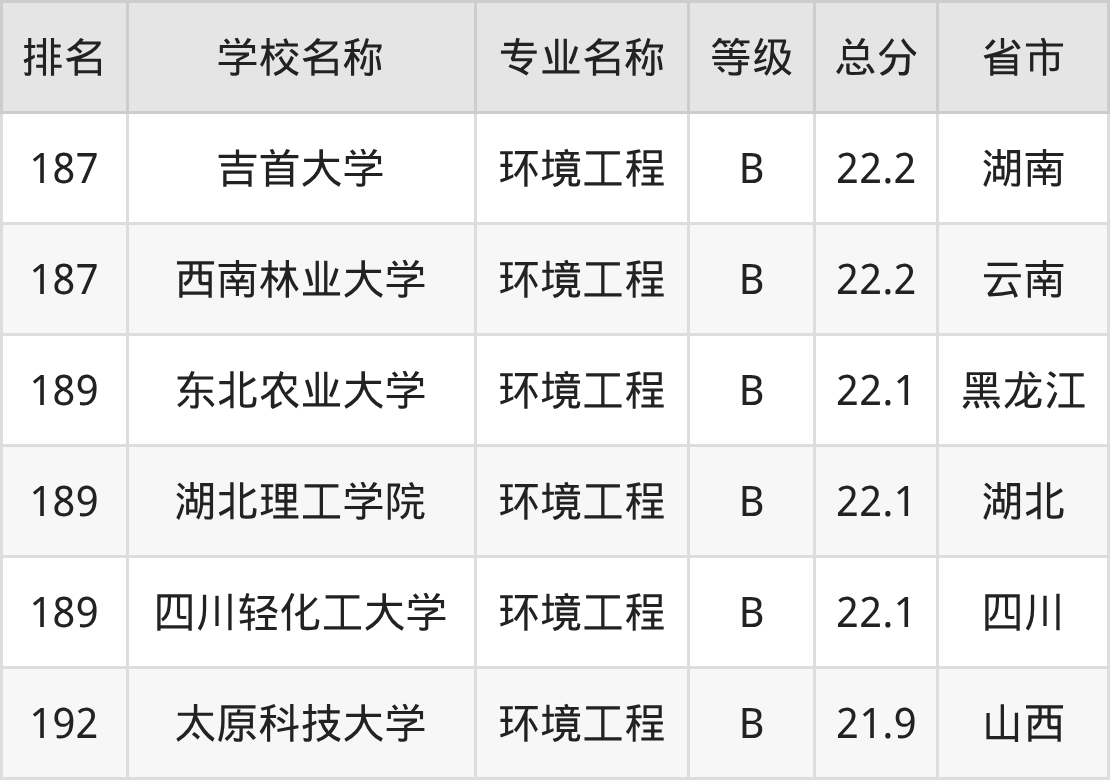 附环境工程专业全国192所院校排名榜单一览表!