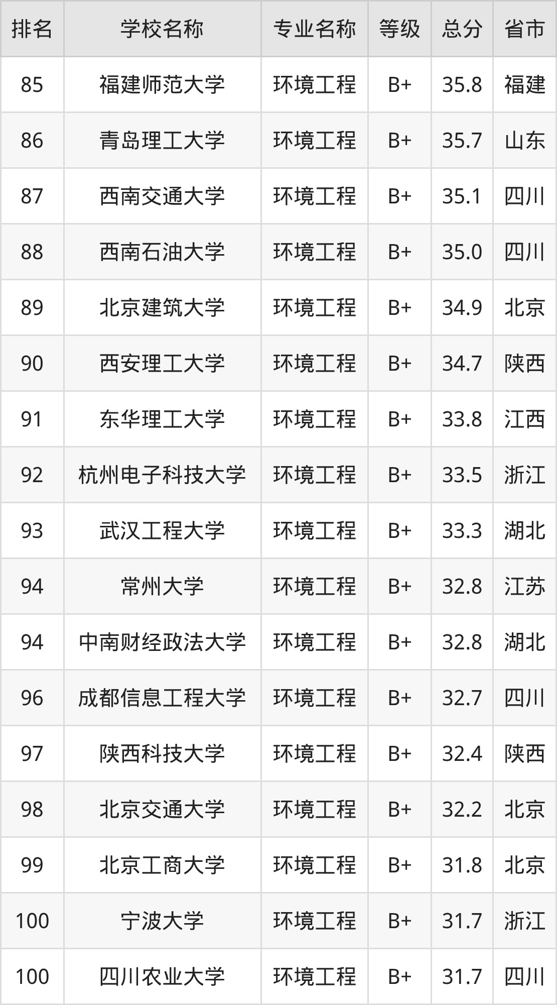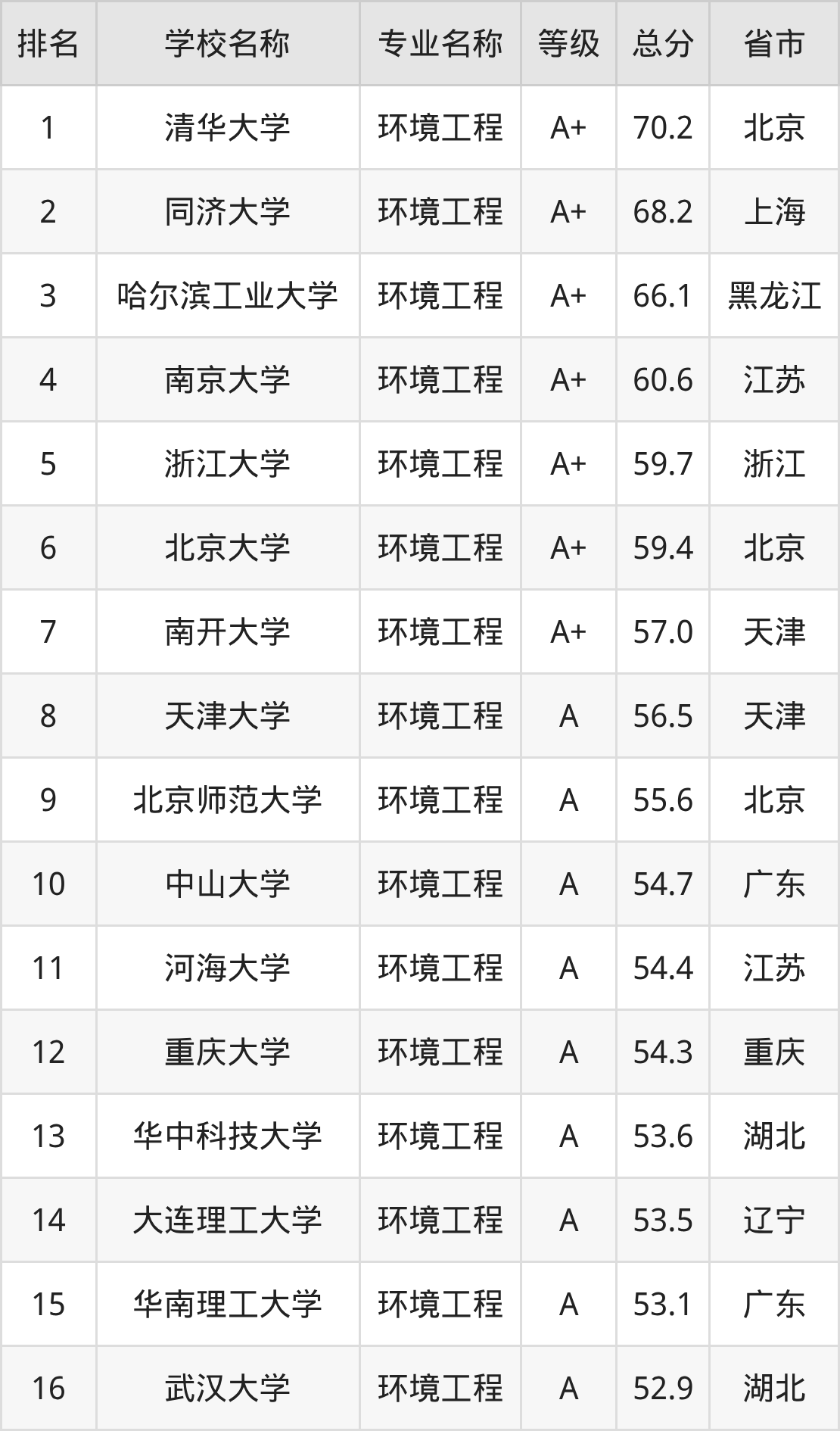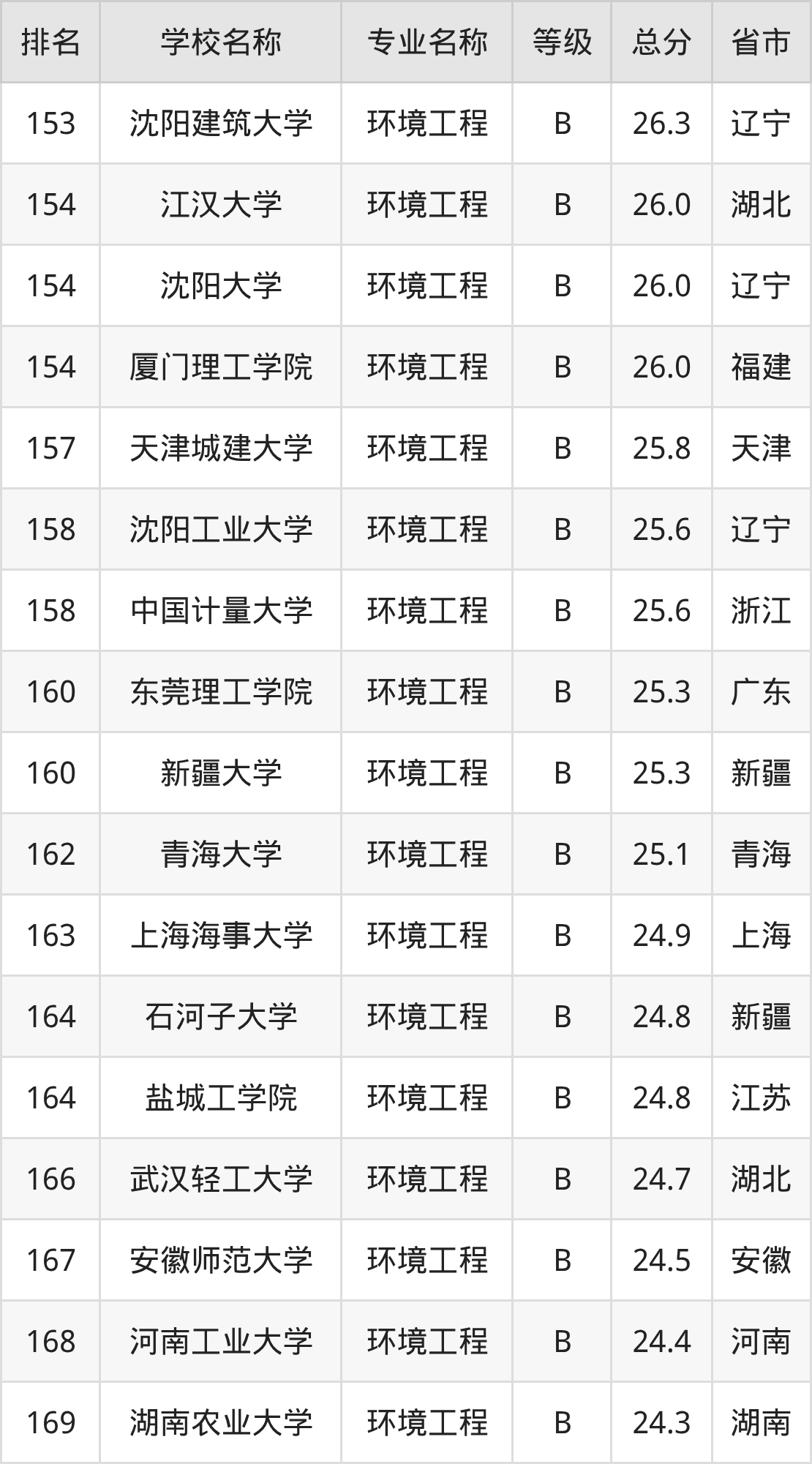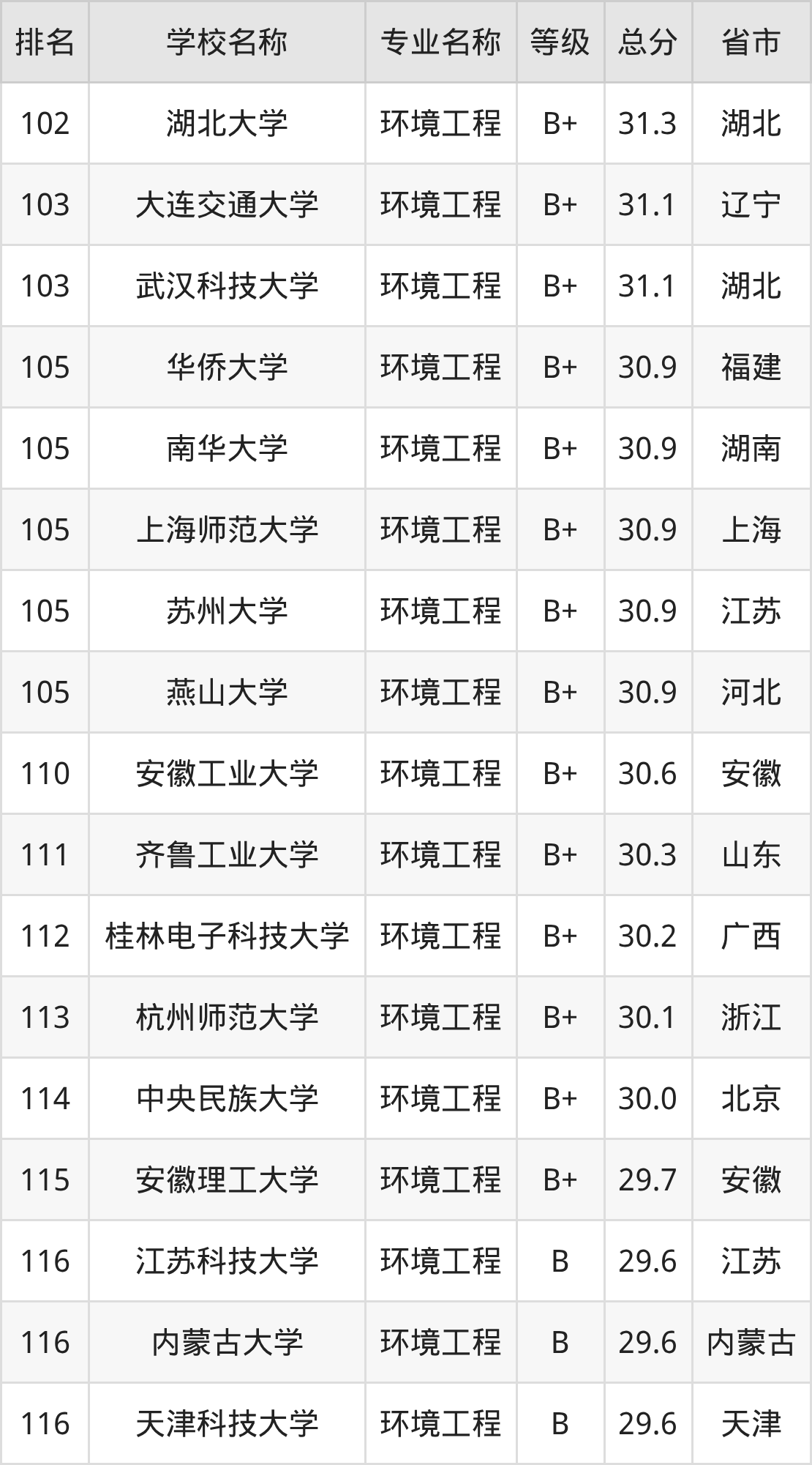 附环境工程专业全国192所院校排名榜单一览表!