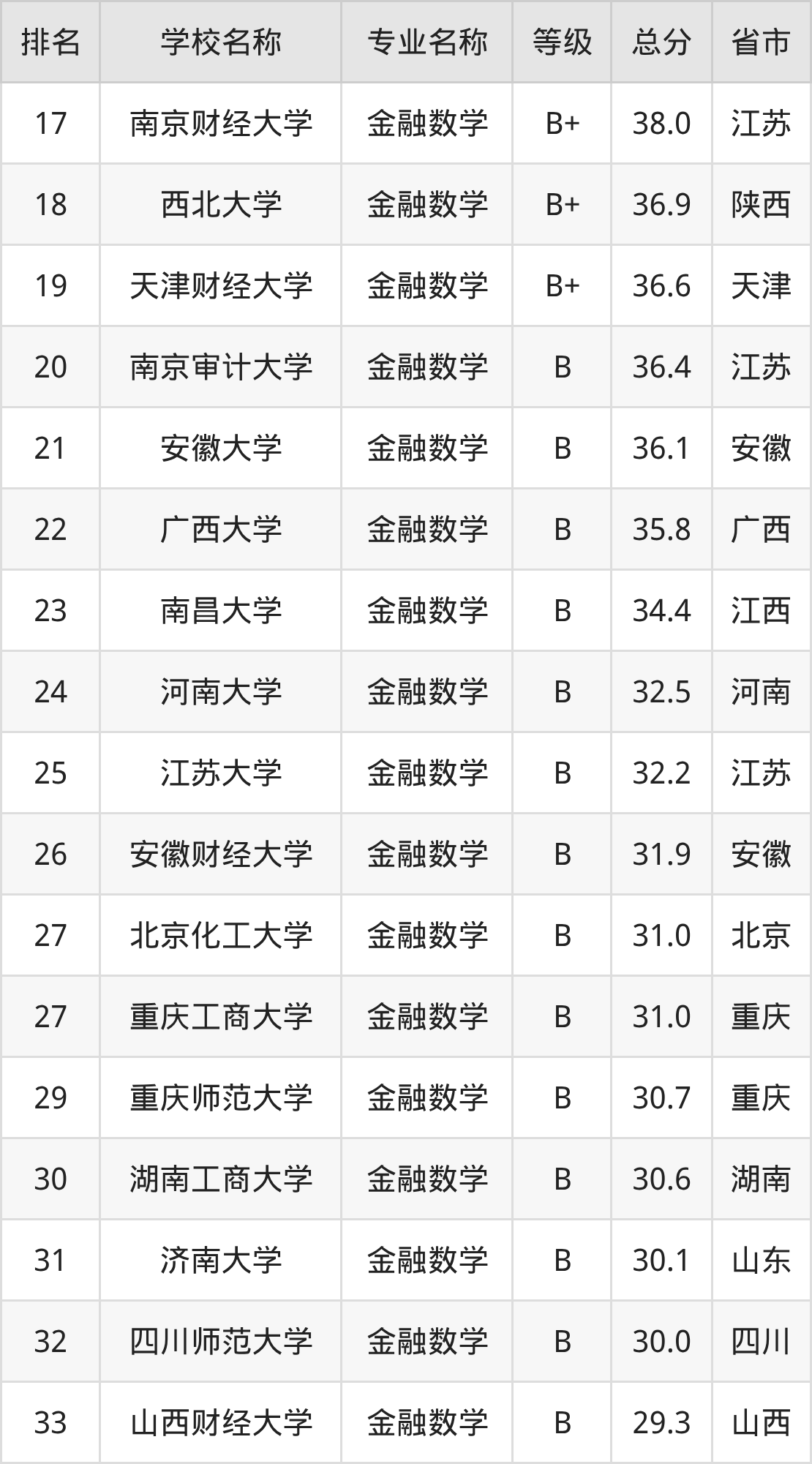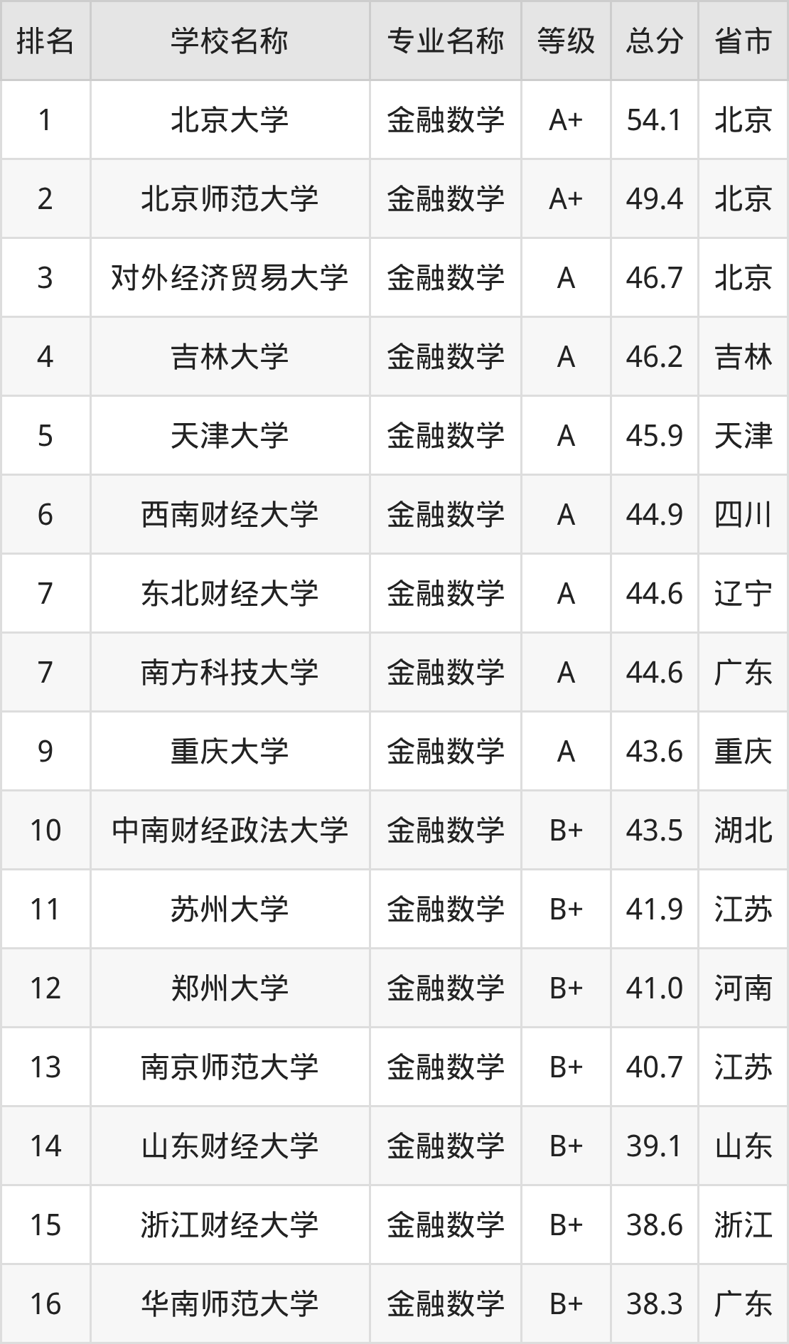 根据软科榜单可知,金融数学专业全国排名前十的大学分别是: