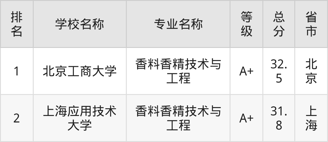 2025年香料香精技术与工程专业全国大学排名中,排名第一的是北京工商大学,被软科榜单评为:香料香精技术与工程专业实力最强的本科院校。本文将展示香料香精技术与工程专业上榜软科榜单的2所院校排名以及等级评分,供2026年想读香料香精技术与工程专业的同学们参考!
