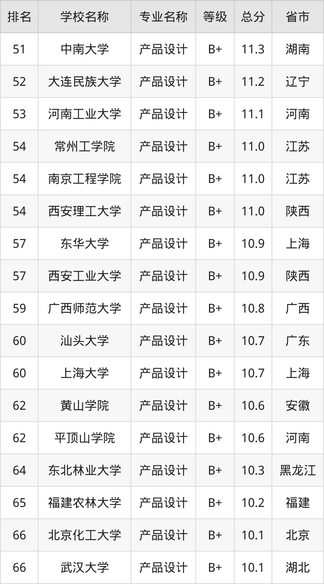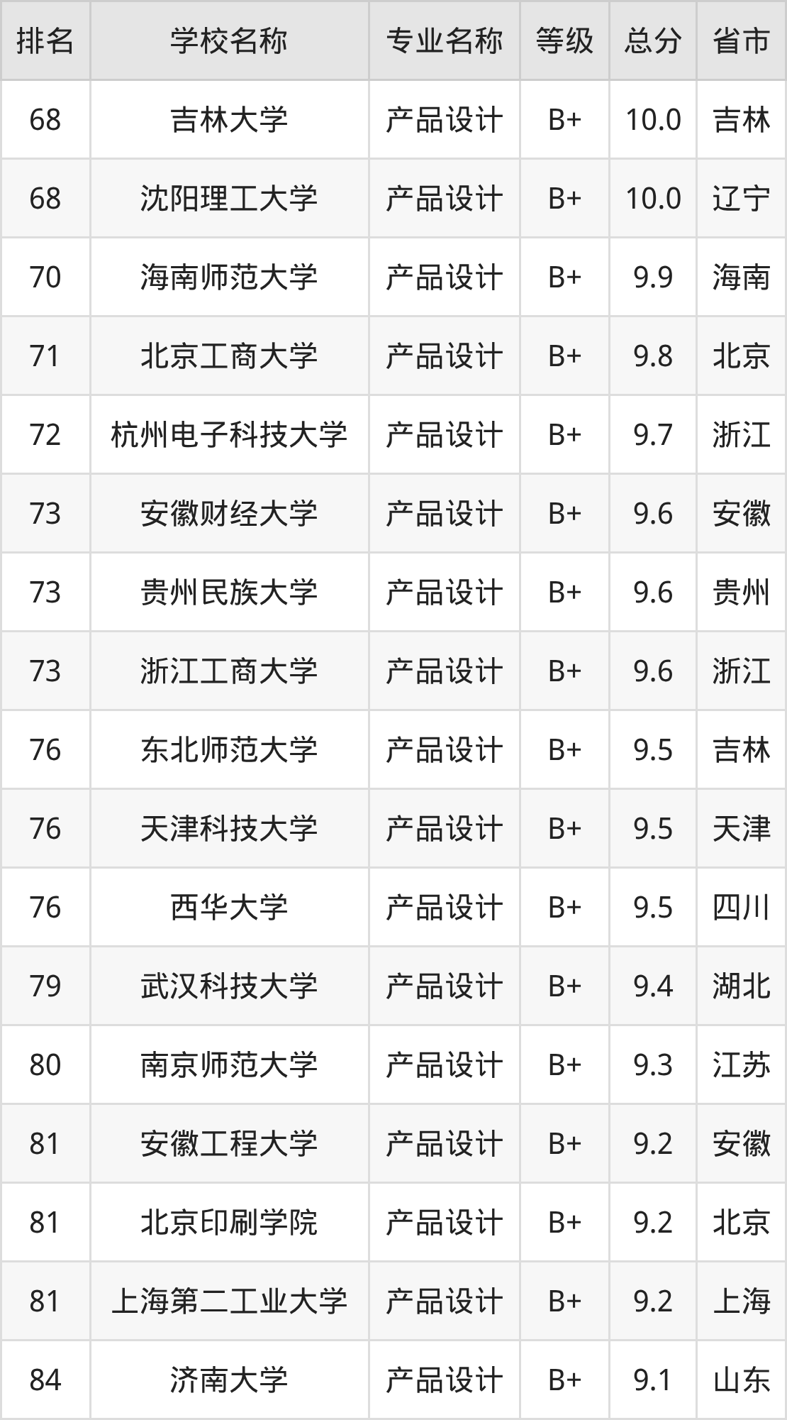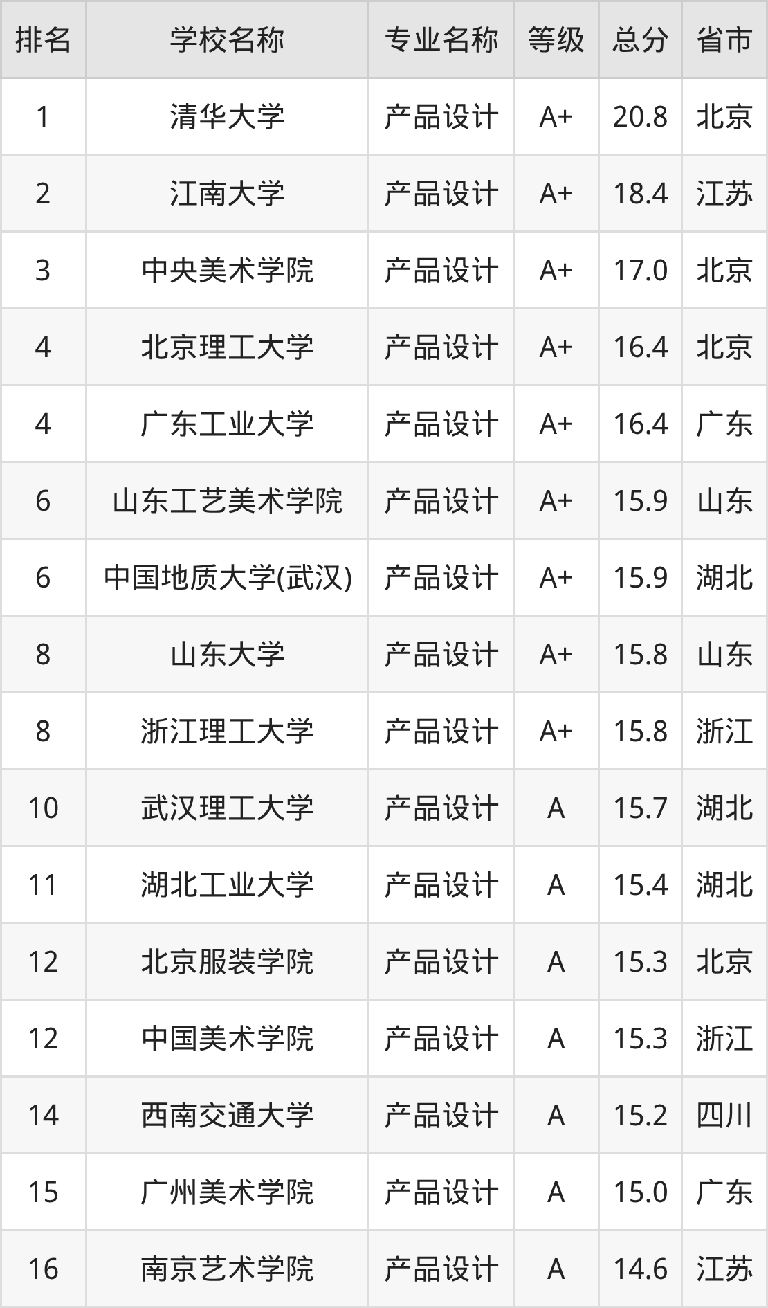 根据软科榜单可知,产品设计专业全国排名前十的大学分别是: