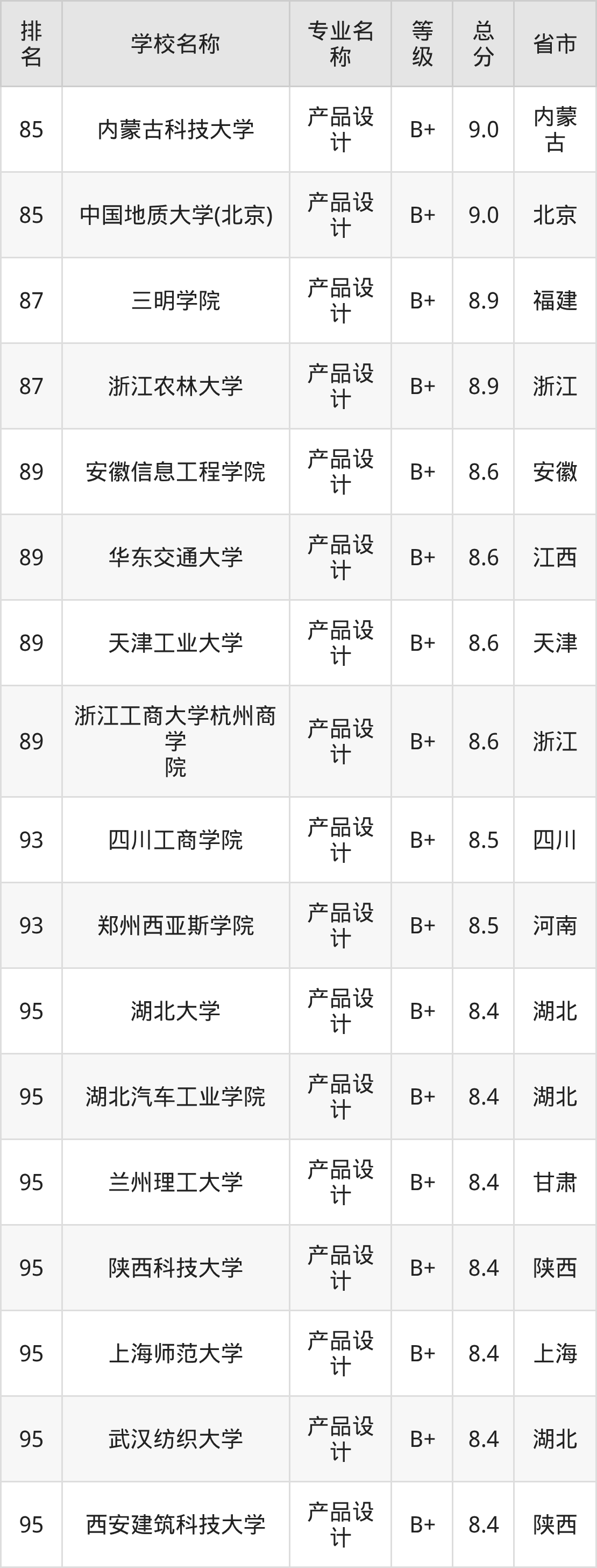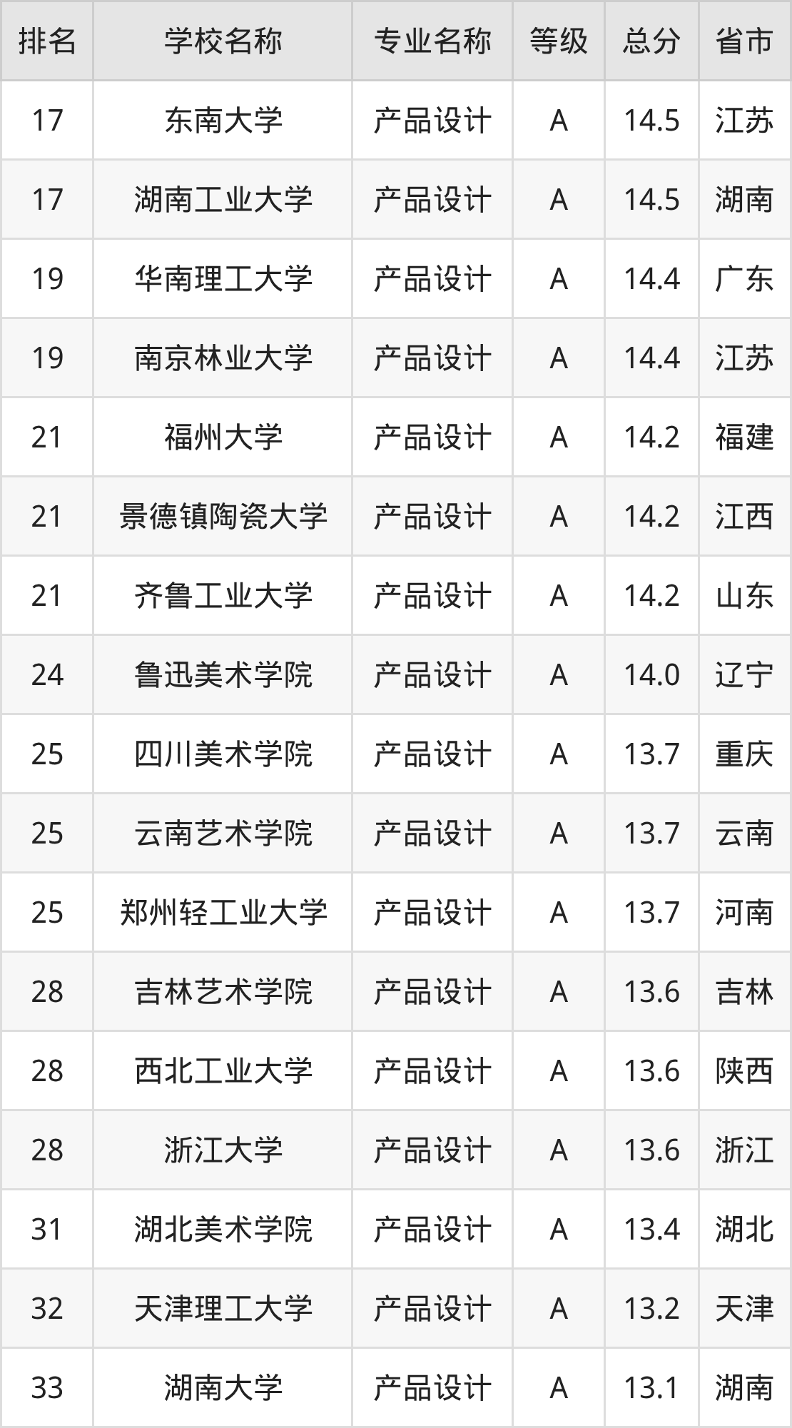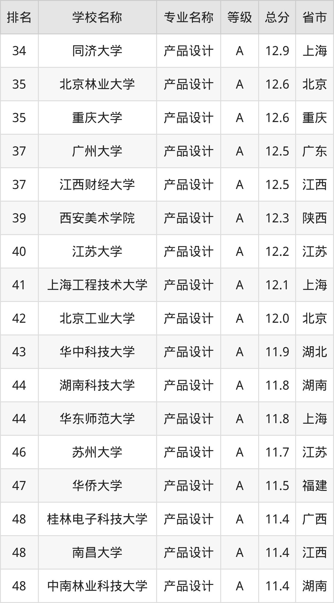 根据软科榜单可知,产品设计专业全国排名前十的大学分别是:
