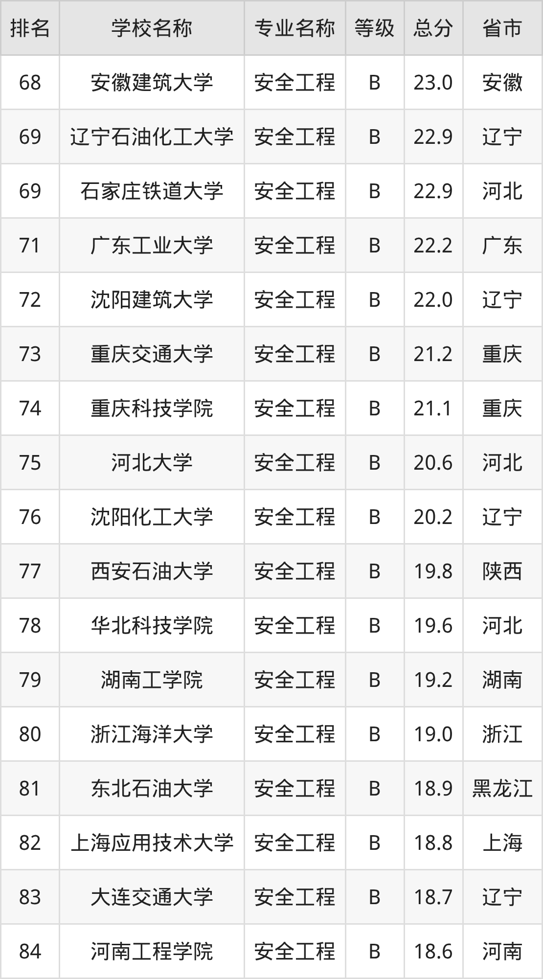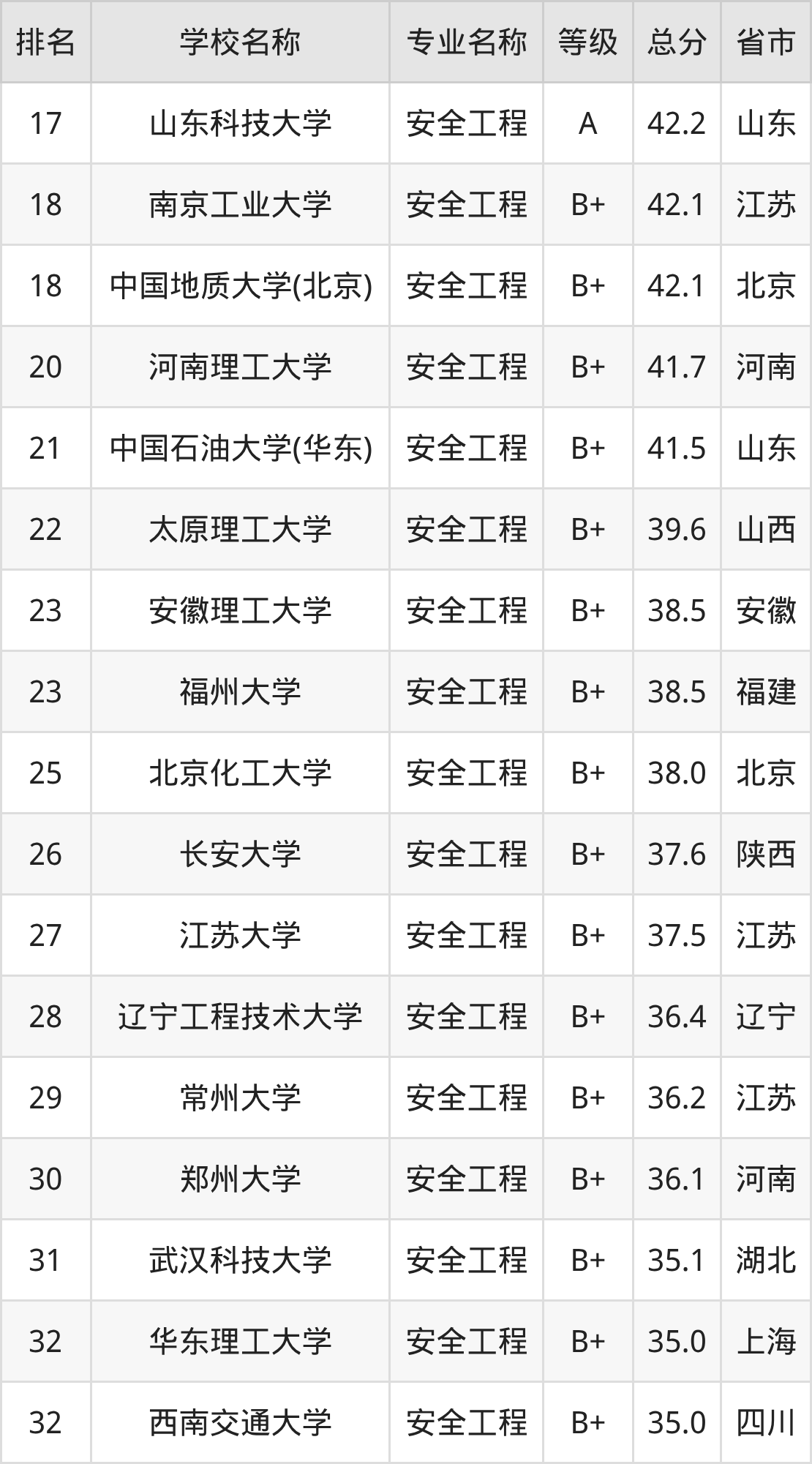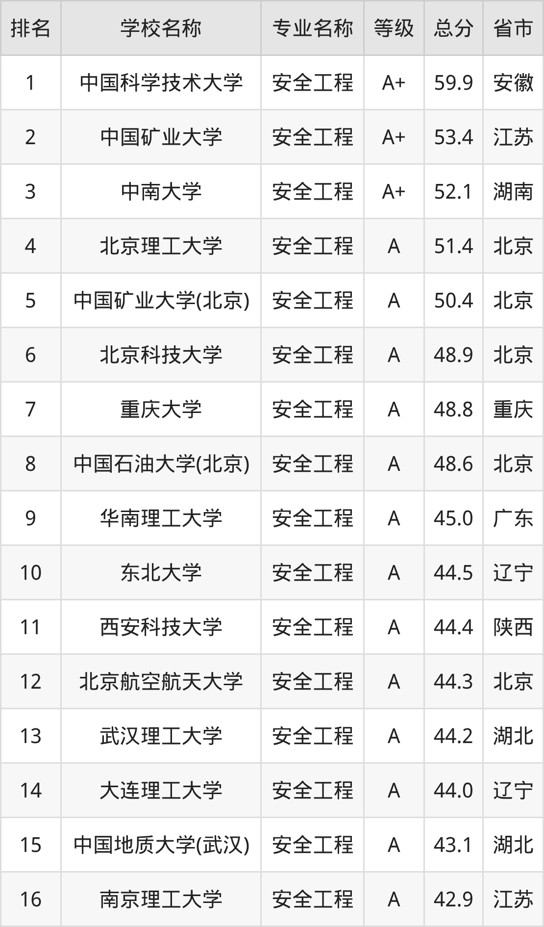 根据软科榜单可知,安全工程专业全国排名前十的大学分别是: