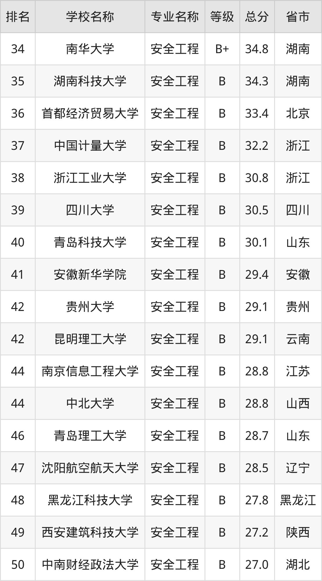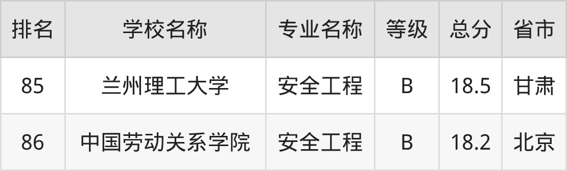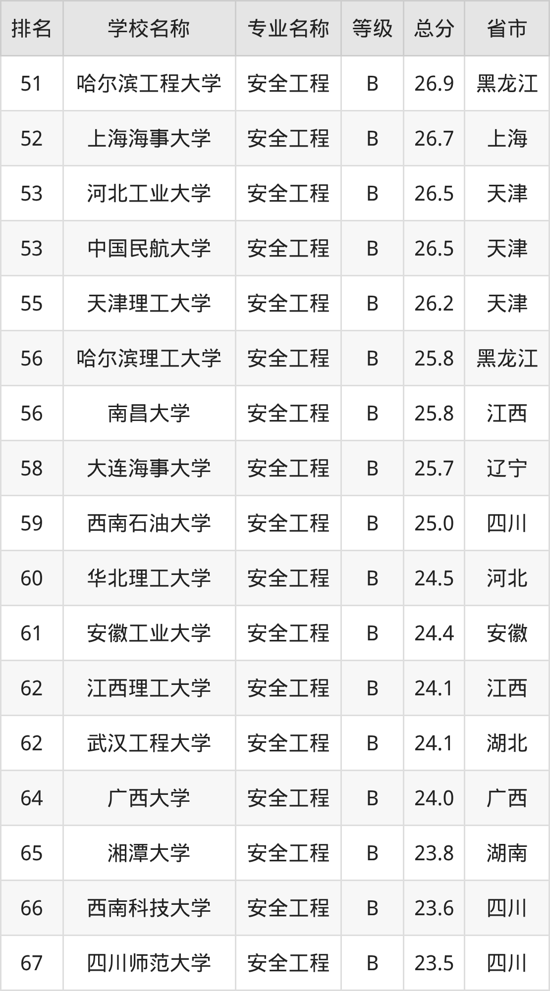根据软科榜单可知,安全工程专业全国排名前十的大学分别是: